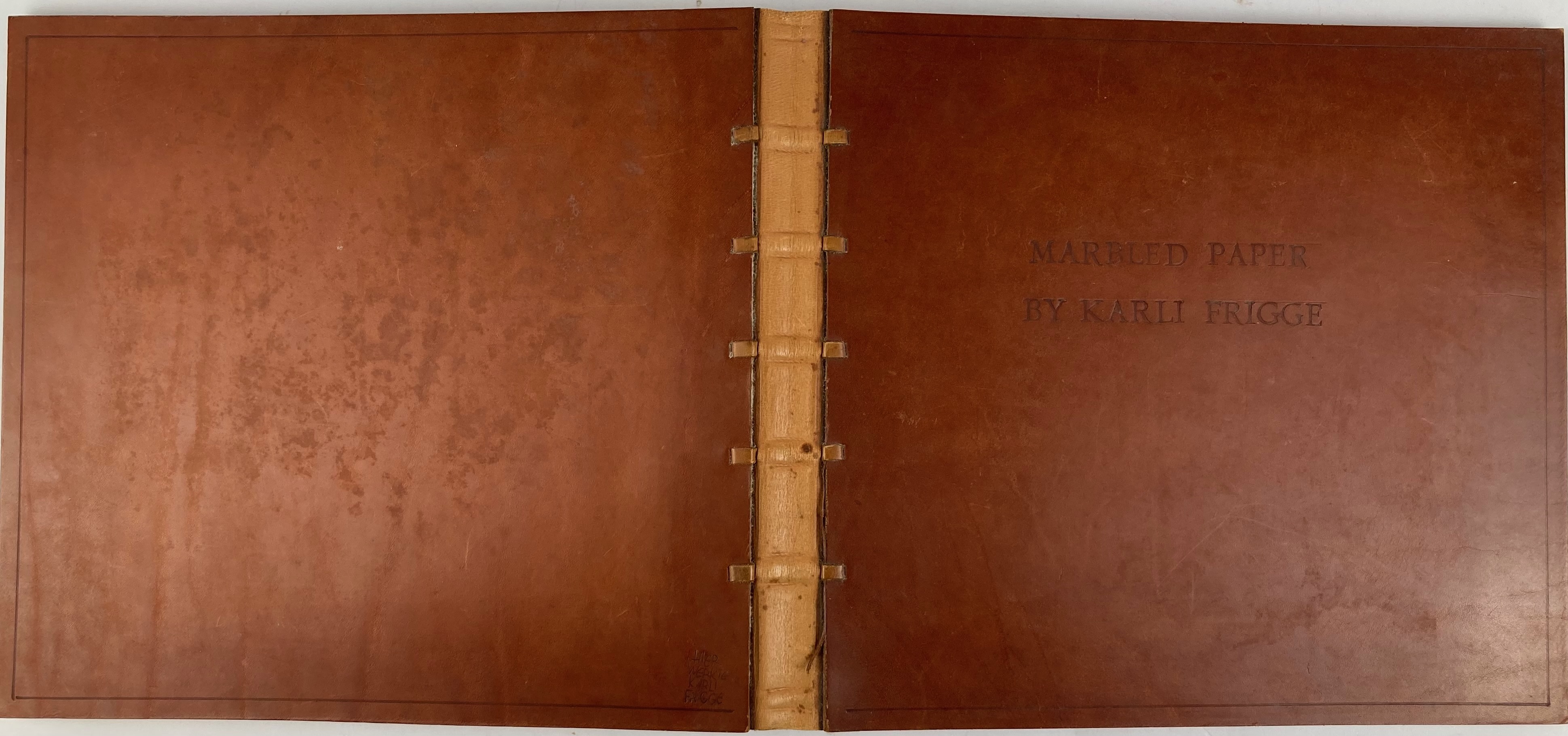 DECORATED PAPER -- FRIGGE, K. Marbled Paper. (Buren, F. Knuf, 1985). (43) lvs., incl. front. & colophon. W. 2 tipped in b&w photogr. and tog. 33 fine tipped-in cold. handmade marbled paper samples. 4°-obl. Or. calf w. blind stamped title on front cover. (Verso's of back & front cover whitened (not disturbing), most probably by storing the book in a damp environment, but a good copy without foxing).
