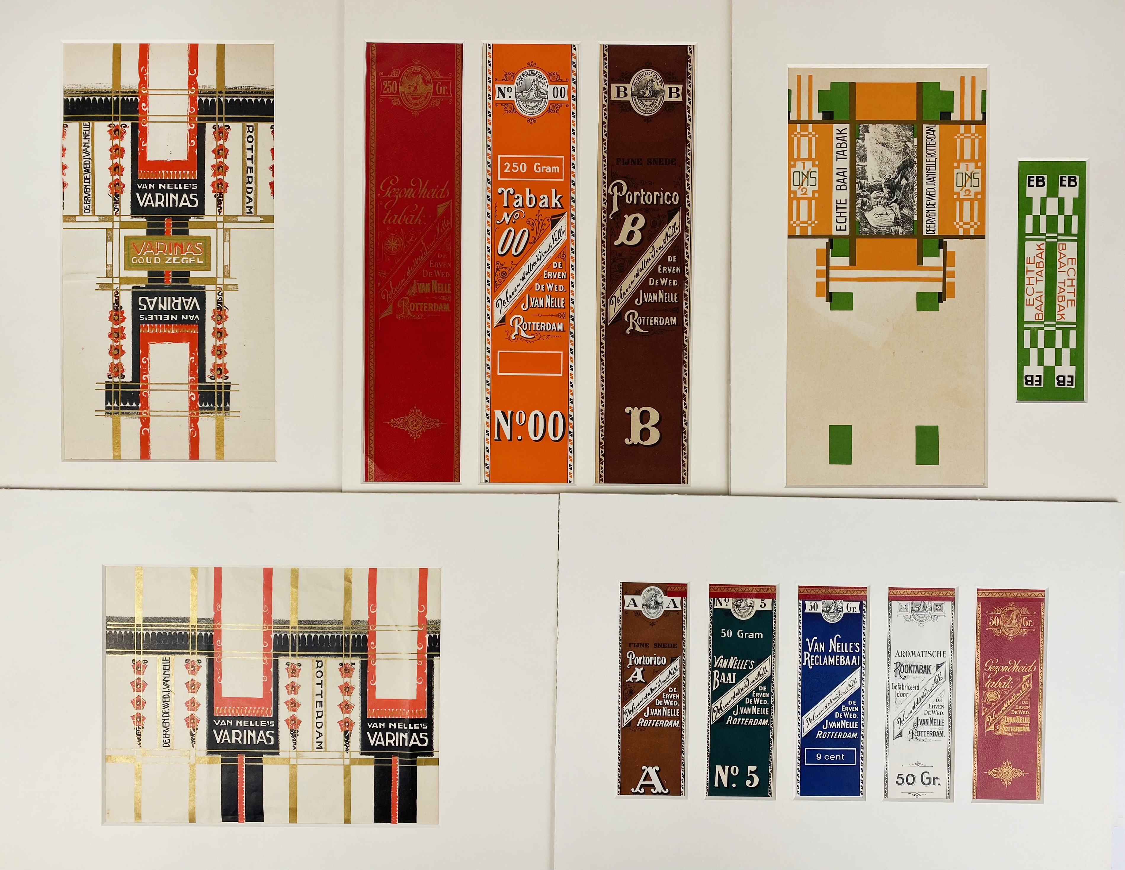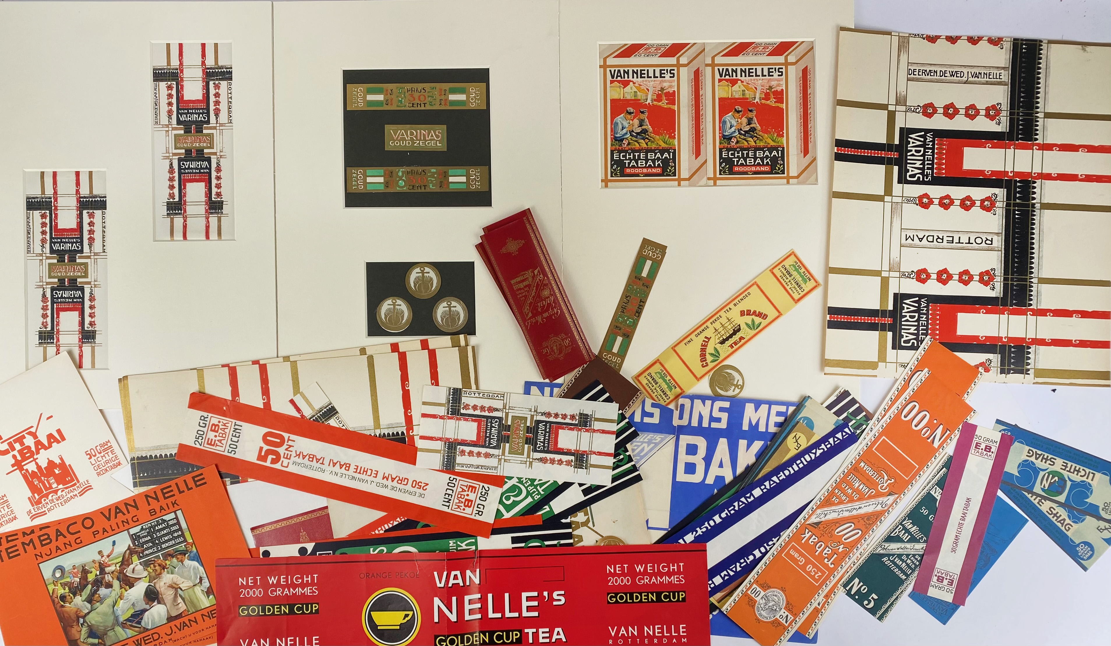 JONGERT -- VAN NELLE. Collection of 25 posters and labels for Varinas, Van Nelle echte baai tabak (groenband/ paarsband/ roodband). Dif. sizes. Tipped in under 13 passepartouts. -- Added: c. 55 labels/small posters for Van Nelle, incl. duplicates. -- (70).