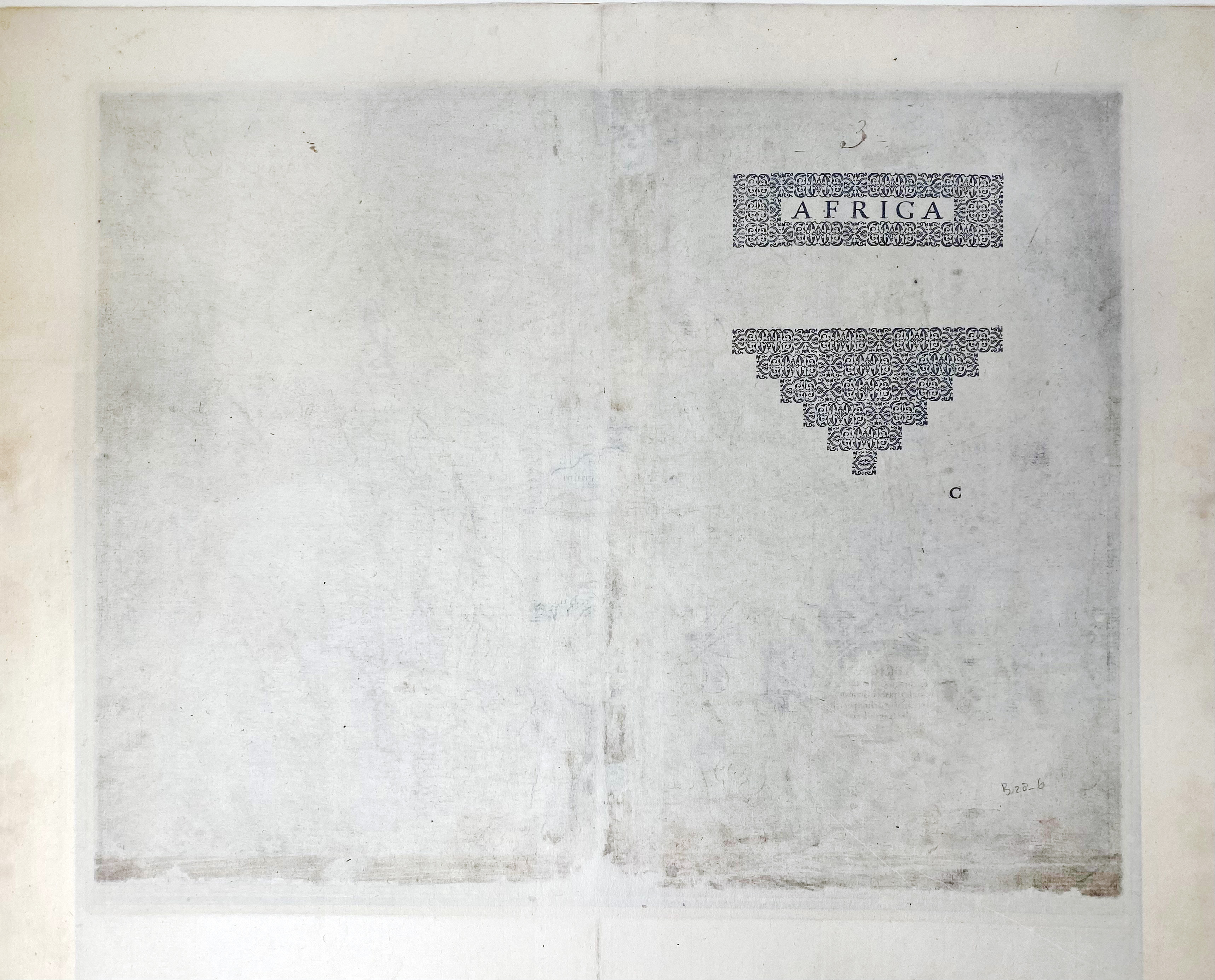 Derived from the elder Mercator's world map of 1569, this map of Africa was engraved by his grandson Gerard. Rare early edition of the map, with no text on v°, only "Africa", a decorated cartouche and "C". - Koeman Me12 (1595B); V.d. Krogt I, 8600:1A (1:011/012).€ 500