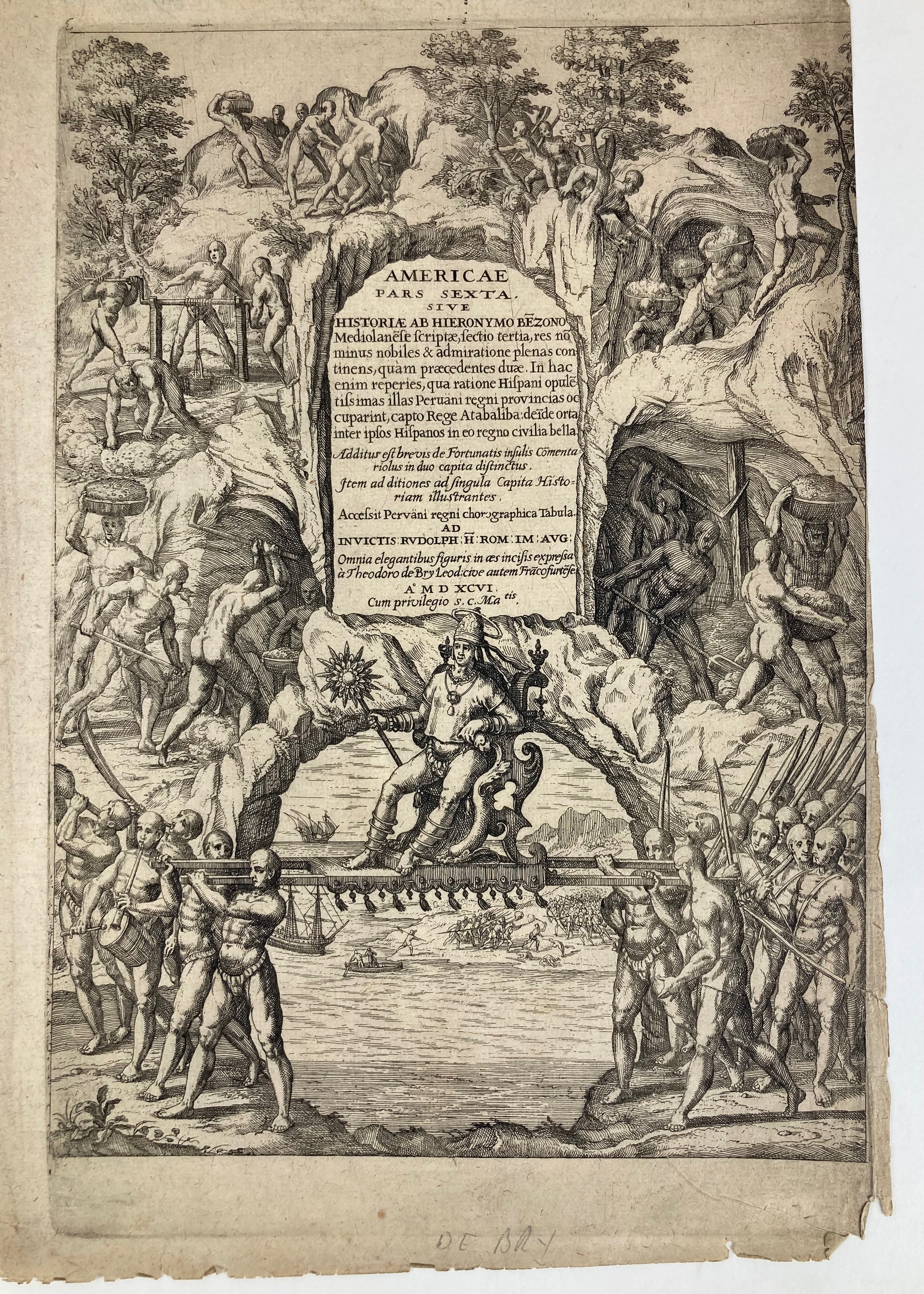 AMERICA -- "AMERICAE PARS MAGIS COGNITA". (Frankfurt), Th. de Bry, 1624. Engr. map of the Americas w. elaborate cartouches, coats of arms, 2 compass roses, and 2 insets. (Upper margin partly cut off (w. loss of part of the decorative border), a strip at the foot of c. 10 mm across the entire width of the image is missing unfortunately, browned).
