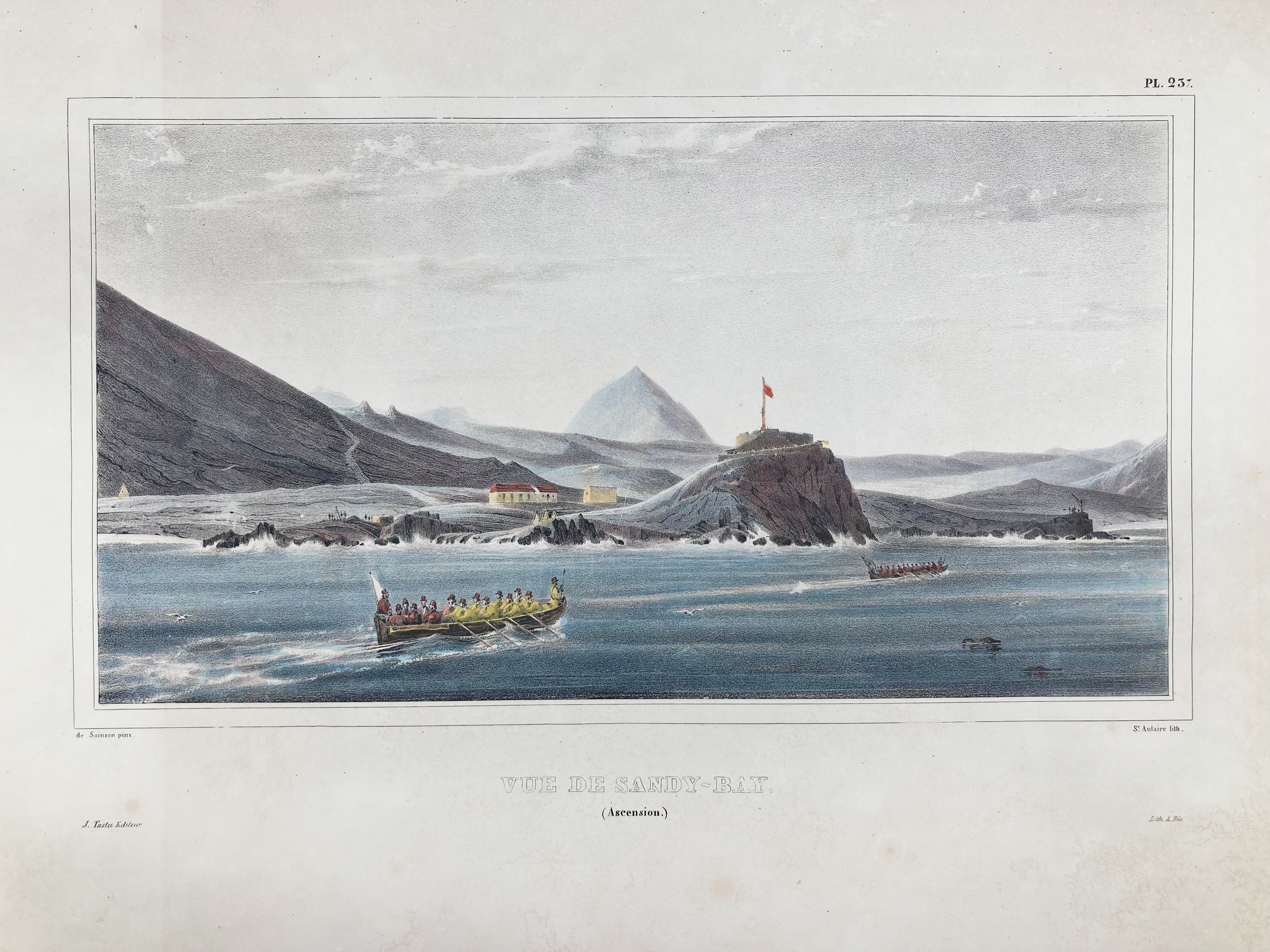 DUMONT D'URVILLE -- "SAINT CROIX de Ténériffe" - "VUE de Saint Denis [Réunion]" - "VUE de Sandy-Bay" [Ascension] - "VUE de Jame's-Town" [St. Helena]. (Paris), J. Tastu, n.d. (1830). 4 lithogr., cold. by hand, by Guérard/Adam & St. Aulaire after De Sainson. 190 x 370 mm (image size) w. ample margins. (A bit age-toned, outer margins frayed/torn in places, but in good condition).