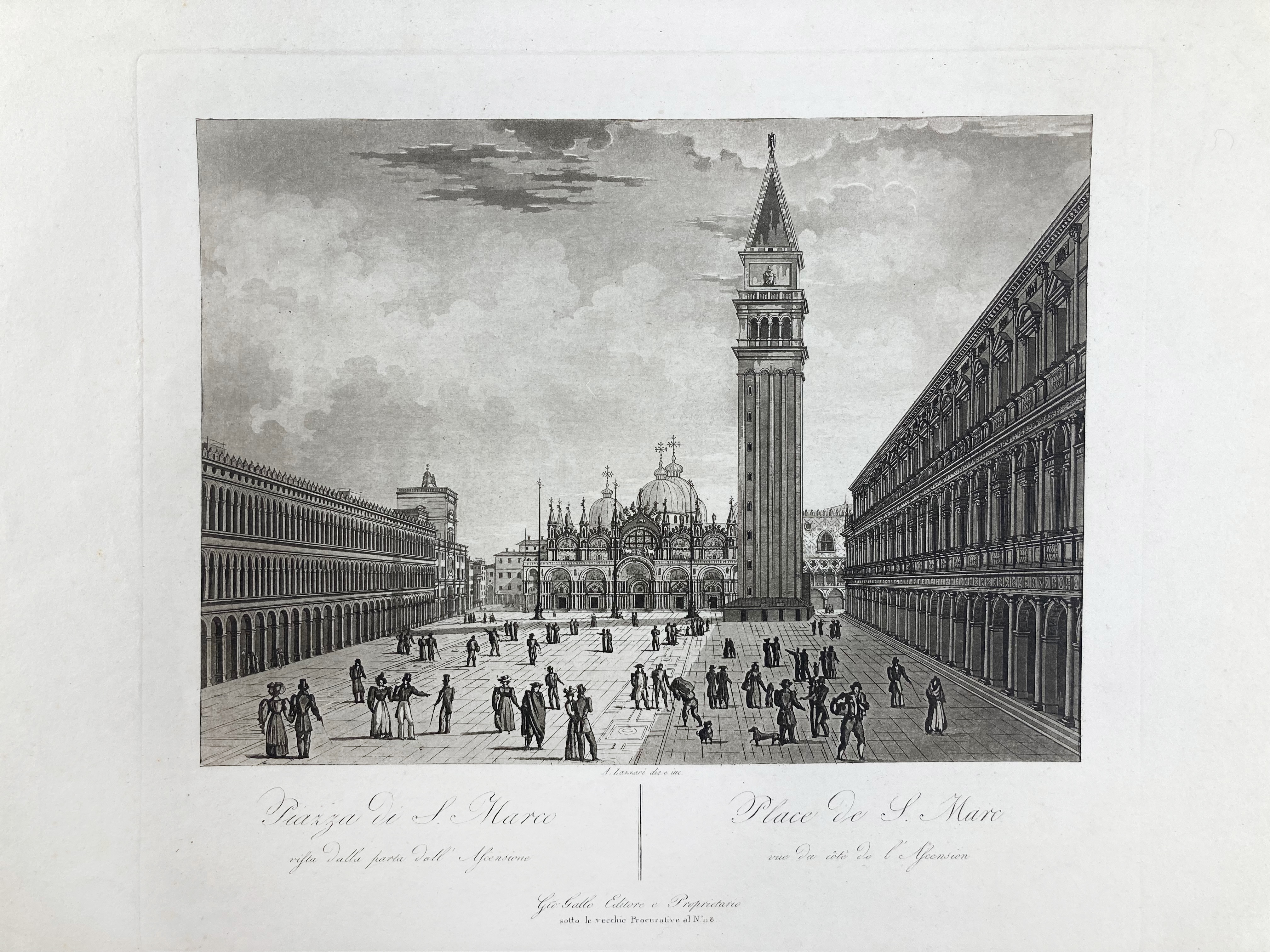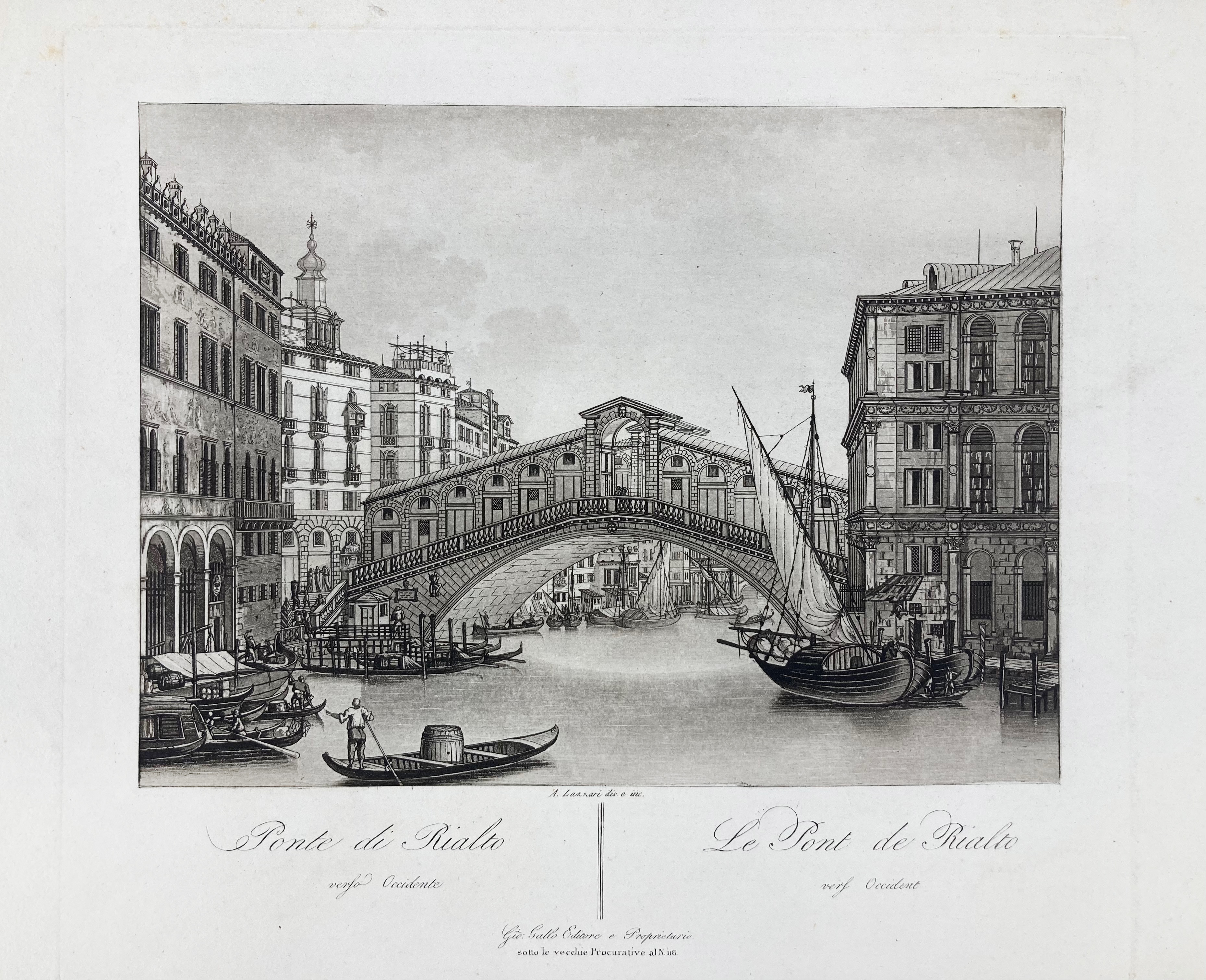 ITALY -- VENICE -- "PONTE DI RIALTO/Le Pont de Rialto" - "PIAZZA DI S. MARCO/Place de S. Marc" - "PONTE DELLA PAGLIA, E PRIGIONI/Pont de la Paille, et Prisons" - "PIAZZETTA DI S. MARCO/Petite Place de S. Marc" -- "J.R. ARSENALE/J.R. Arsenal" - (Venice), Gio. Gallo, n.d. (c. 1830). 5 fine plain aquatint town views of Venice by A. Lazzari (from a series of 12: 'Vedute principali di Venezia'), captioned in the plates. (In very good condition, but w. some foxing to outer blank margins and some marginal splits (not affecting images)).