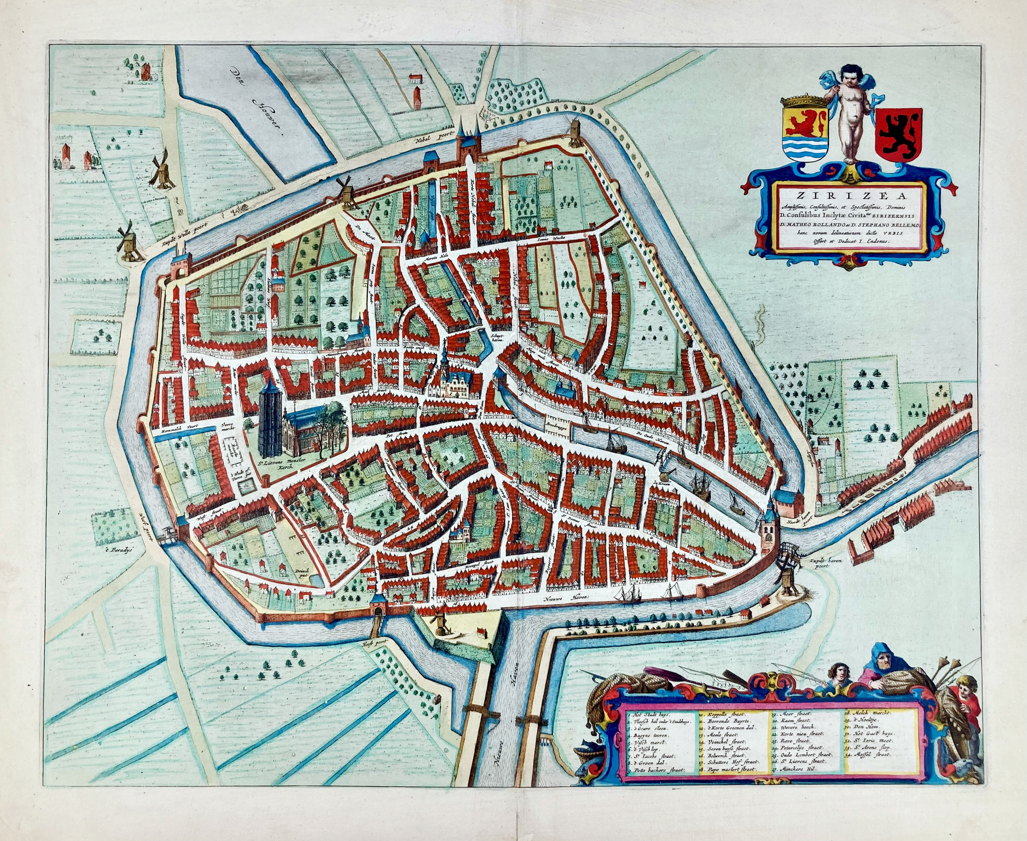 LOW COUNTRIES -- AMERSFOORT -- "AMISFURTUM." (Amst., Blaeu, 1652). Engr. plain bird's eye plan w. cartouche w. 2 coats of arms of Amersfoort, cold. by hand. 417 x 520 mm. Dutch text on v°. -- Added: "ZIRIZEA [Zierikzee]". (Amst., Blaeu, 1652). Engr. plain bird's eye plan w. cartouche w. 2 coats of arms and 2 cartouches, cold. by hand. 420 x 530 mm. Dutch text on v°. -- And 2 o. bird's eye perspective plans, 1 cold. (4).