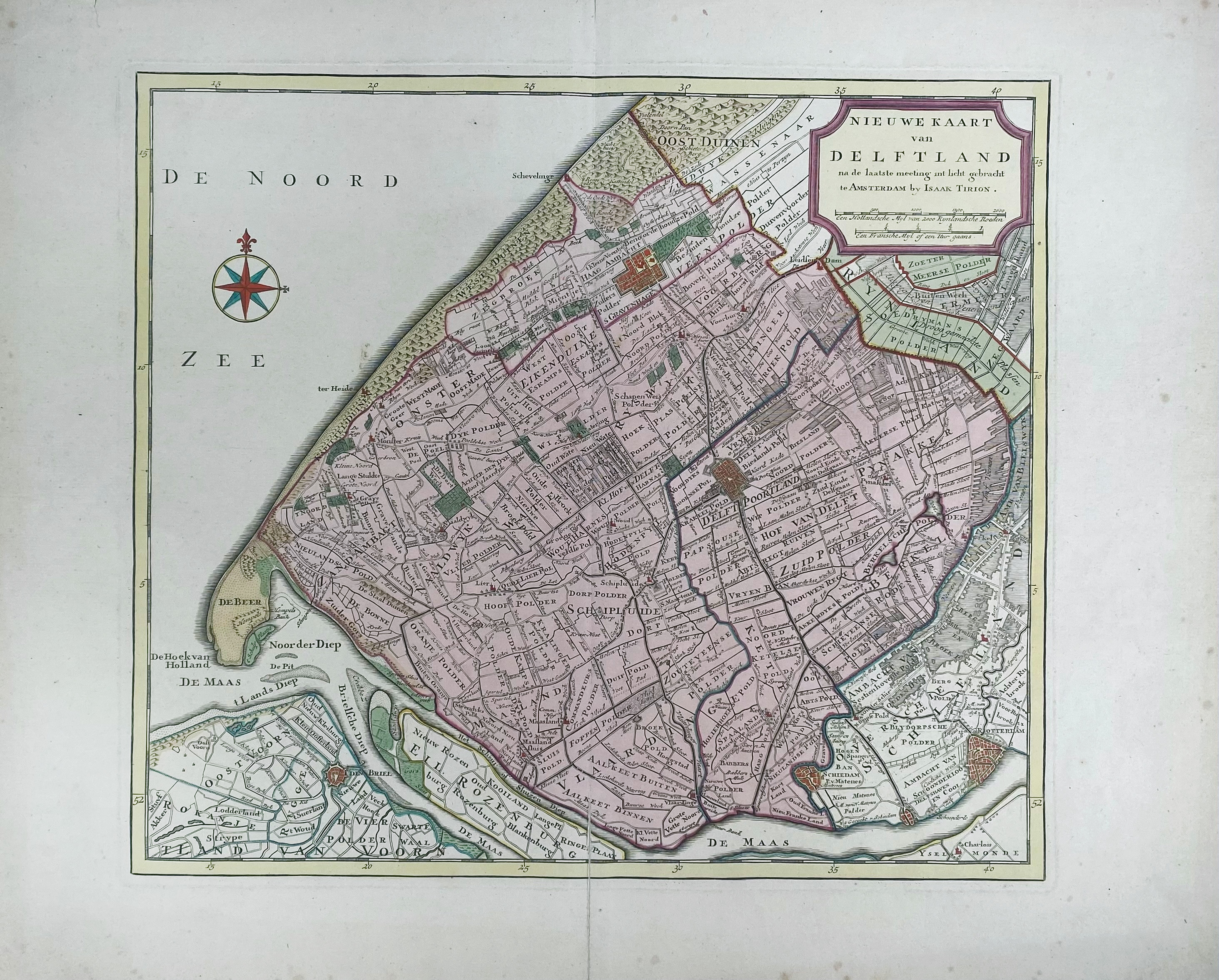 LOW COUNTRIES -- DELFT -- "DELFLANDIA, SCHIELANDIA, et insulæ trans Mosam illis objacentes ut sunt Voorna, Overflackea, Goerea, Yselmonda, etc." (Amst.), W.J. Blaeu, (1662). Cont. engr. cold. map. 385 x 502 mm. (With some sharp creases). -- "NIEUWE KAART VAN DELFTLAND". Delft, I. Tirion, (1753). Cont. engr. cold. map. 340 x 387 mm. (Ample margins, but w. tiny tears and some marg. foxing, sm. piece of blank lower left corner torn off). -- (2).