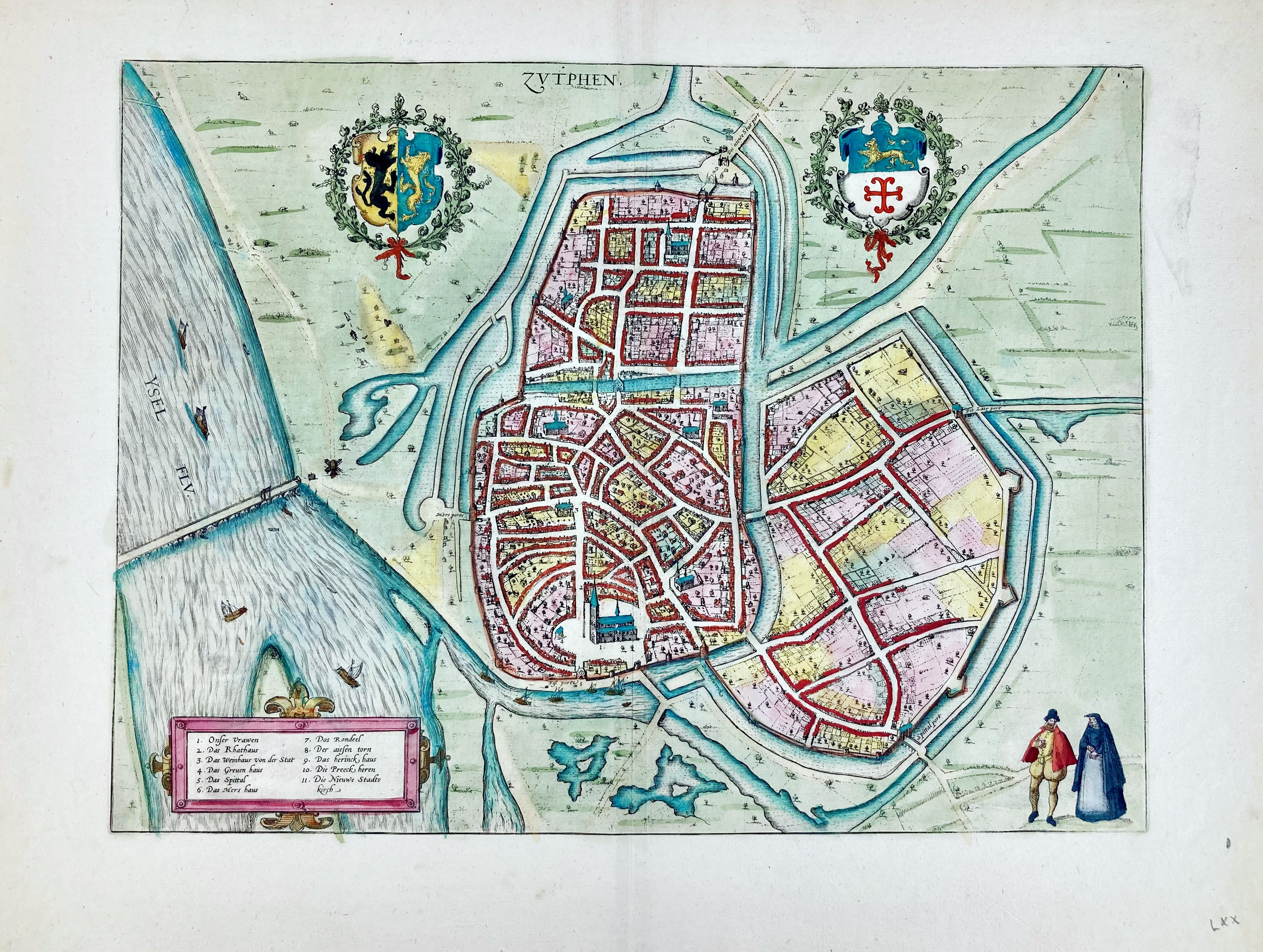 LOW COUNTRIES -- DEVENTER -- "DAVENTRIA vernacule Deventer". (Amst.), J. Blaeu, 1650). Fine engr. plan of the city in bird's eye perspective, cold. by hand, w. 2 coats of arms and dedic. cartouche. 420 x 525 mm. Dutch text on v°. (Tear in upper blank margin closed). -- Added: "ZUTPHEN". (Cologne, Braun & Hogenberg, c. 1588). Engr. plan of the city in bird's eye view in cont. colouring. 317 x 422 mm. Latin text on v°. -- (2).