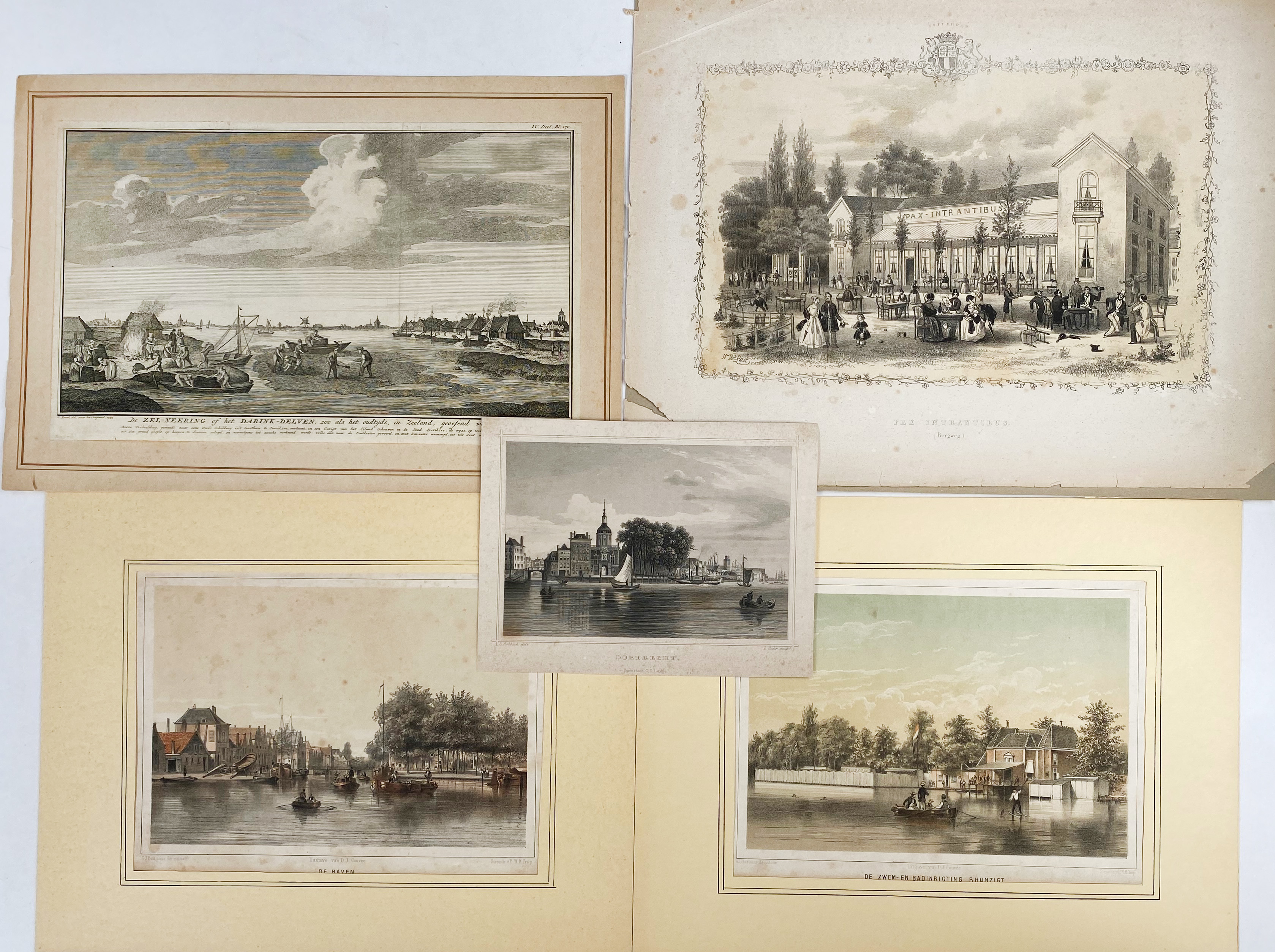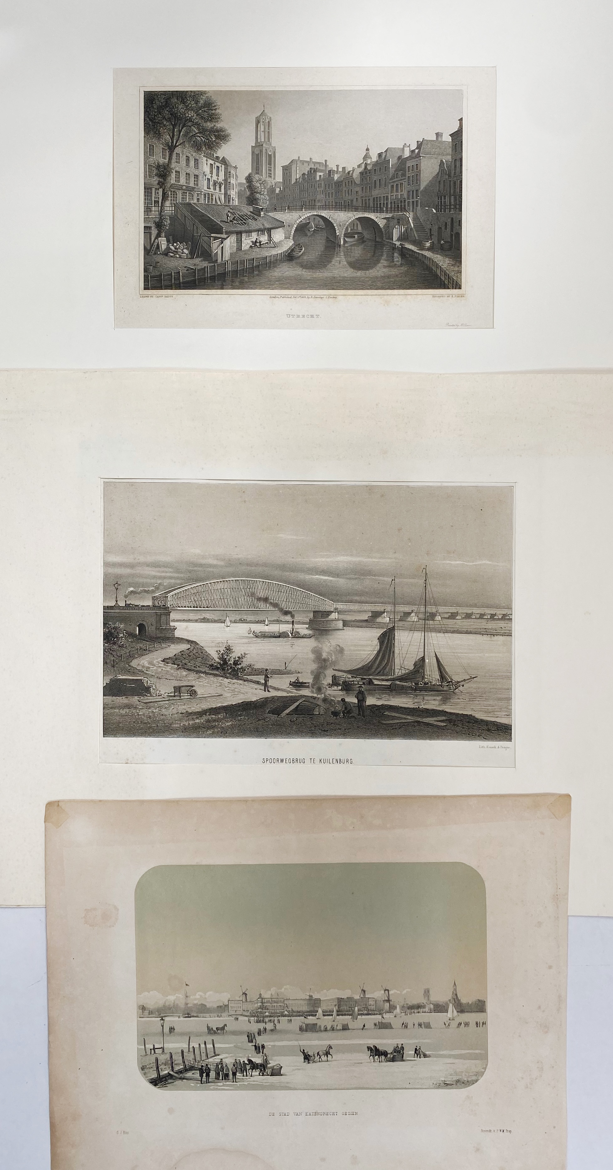LOW COUNTRIES -- "LE ROKIN A AMSTERDAM". Paris, Imp. Lemercier, (c. 1859). Tinted lithograph by C.J. Billmark, depicting a still not filled-in Rokin with ice skaters. 185 x 283 mm. -- "ROTTERDAM". Paris, Imp. Lemercier, (c. 1859). Tinted lithograph by C.J. Billmark. 187 x 282 mm. -- "DE STAD VAN KATENDRECHT GEZIEN". (1855). Tinted lithograph by G.J. Bos, printed by Trap. 149 x 229 mm. (Stain in lower margin, a bit browned/foxed). -- And 7 o. (10).