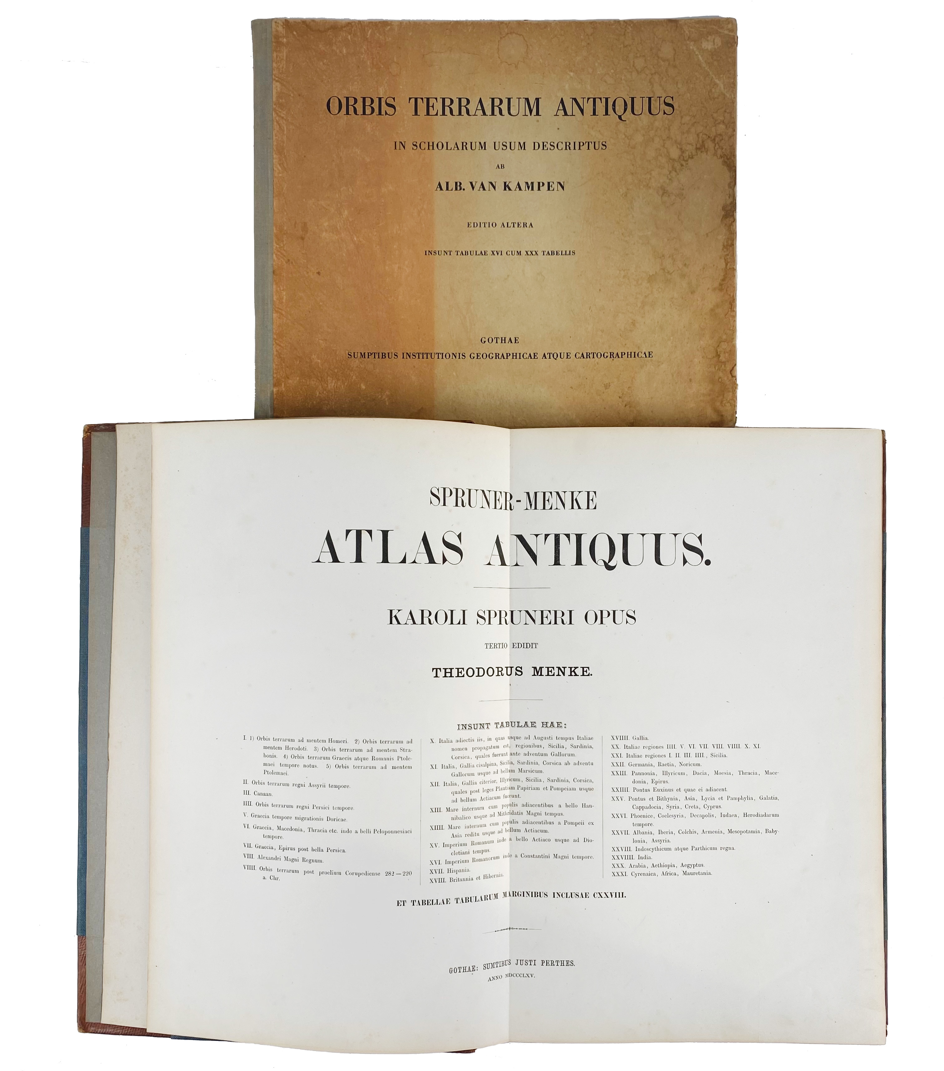 ATLAS -- SPRUNER (v. MERZ), C. de. Atlas antiquus. Ed. 3a. Th. Menke. Göttingen, J. Perthes, (1865). W. 31 engr. double-p. maps, cold. in outlines. Fol. Cont. hcf. (Spine ends dam.). -- And 1 o. (2).