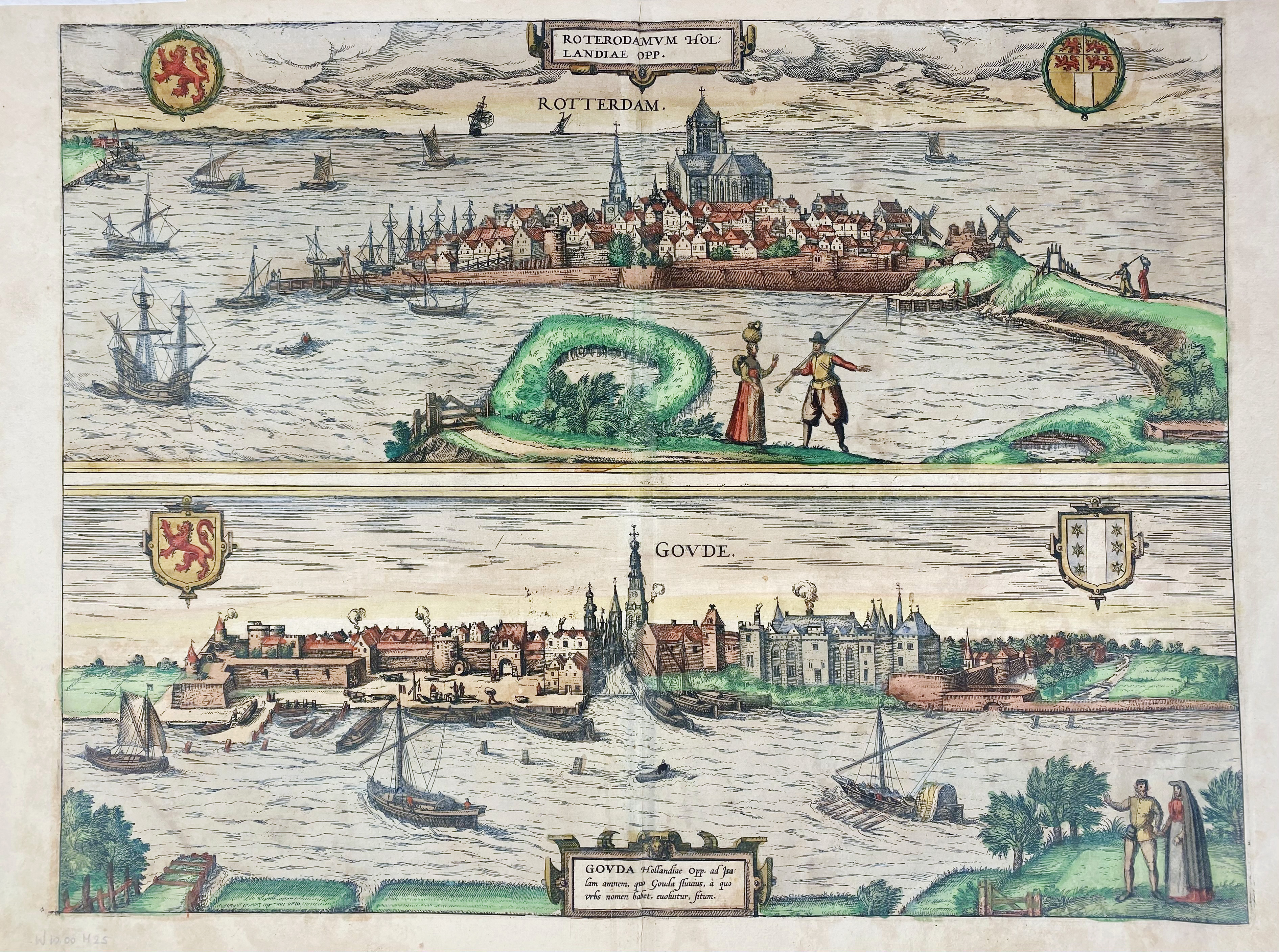 LOW COUNTRIES -- ROTTERDAM -- "ROTERODAMI Delineatio Ichnographica et Scenographica (…)". Augsburg, T.C. Lotter, n.d. (± 1750). Engr. map by M. Seutter of which the plan above the perspective view of the city is cold. by hand. 510 x 588 mm. (Traces of former hinging). -- Added: "ROTERODAMUM HOLLANDIÆ OPP./GOUDA Hollandiæ opp.". (Braun & Hogenberg, 1581). Cont. cold. engr. panoramic views of Rotterdam & Gouda printed on top of each other on 1 sheet. Total size 373 x 487 mm. (Browned, traces of former hinging). V.d. Krogt IV-2.2, 3784. -- (2).