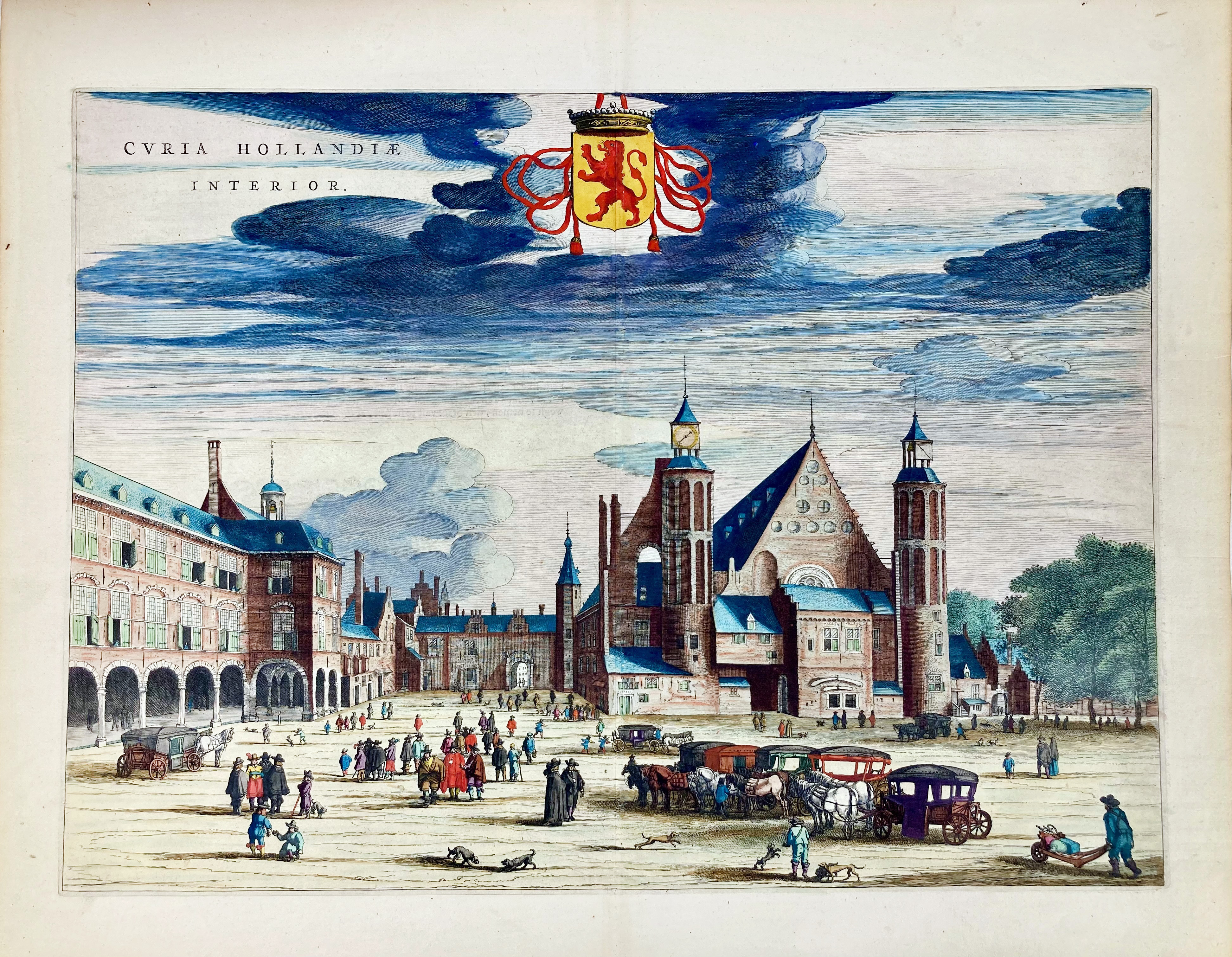 LOW COUNTRIES -- THE HAGUE -- "CURIA HOLLANDIAE INTERIOR" - "CURIA HOLLANDIAE EXTERIOR". - (Amst., Blaeu, 1652). Fine engr. views, cold. by hand. 420 x 555 and 395 x 535 mm. Dutch text on v°.