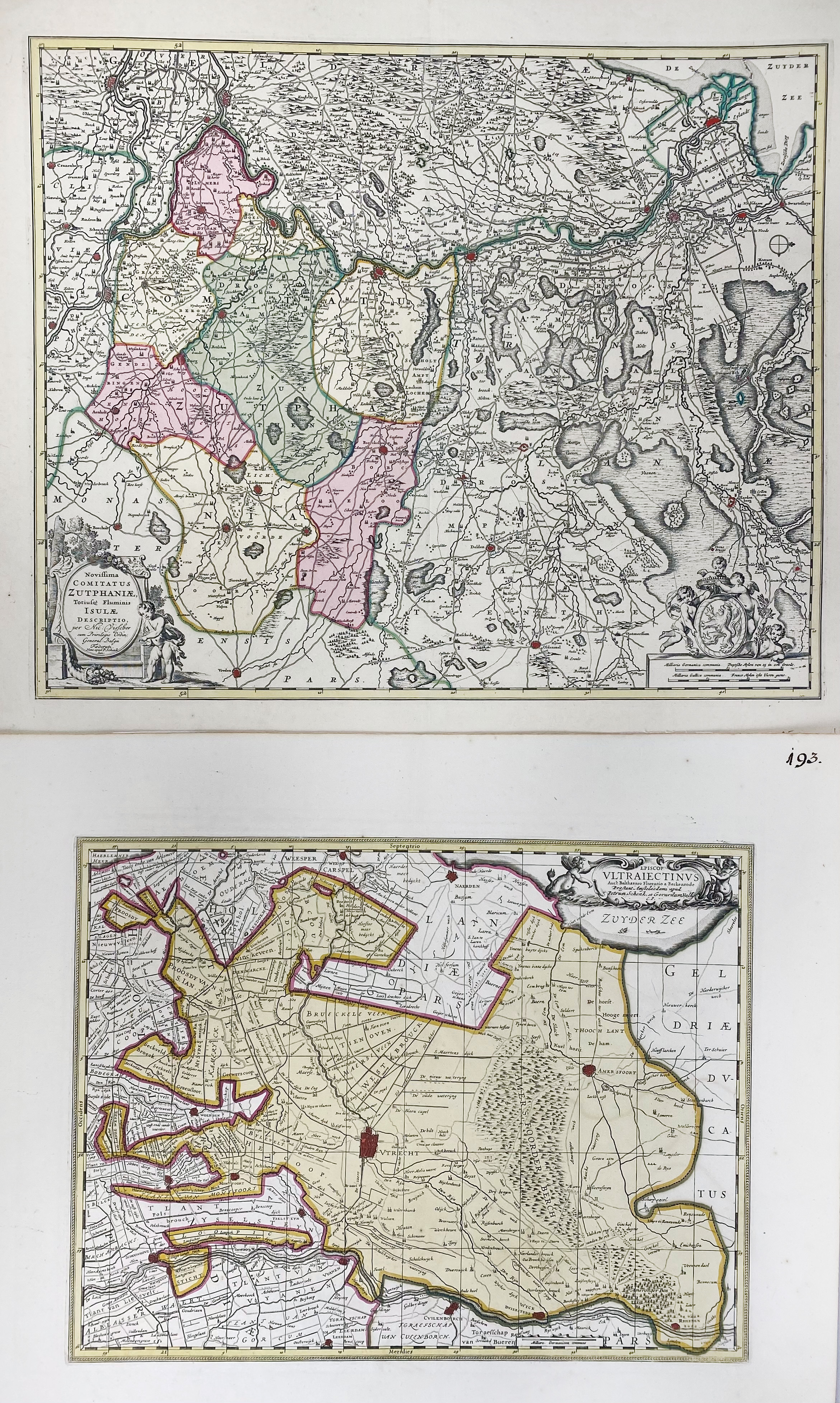 LOW COUNTRIES -- "TRANSISALANIA PROVINCIA; vulgo Over-Yssel. Auctor. N. ten-Have. Sch. Zwol. Conrect." (Amst.), N. Visscher, (c. 1690). Engr. cont. handcold. map. 442 x 564 mm. -- "NOVISSIMA COMITATUS ZUTPHANIÆ, Totiusque fluminis Insulæ descr. per N. Visscher." (Amst.), P. Schenk, (c. 1700). Engr. cont. handcold. map. 470 x 567 mm. -- "EPISCOP. ULTRAIECTINUS". Amst., P. Schenk & G. Valk, (c. 1700). Engr. cont. handcold. map by B.F. v. Berkenrode. 370 x 480 mm. -- (3).