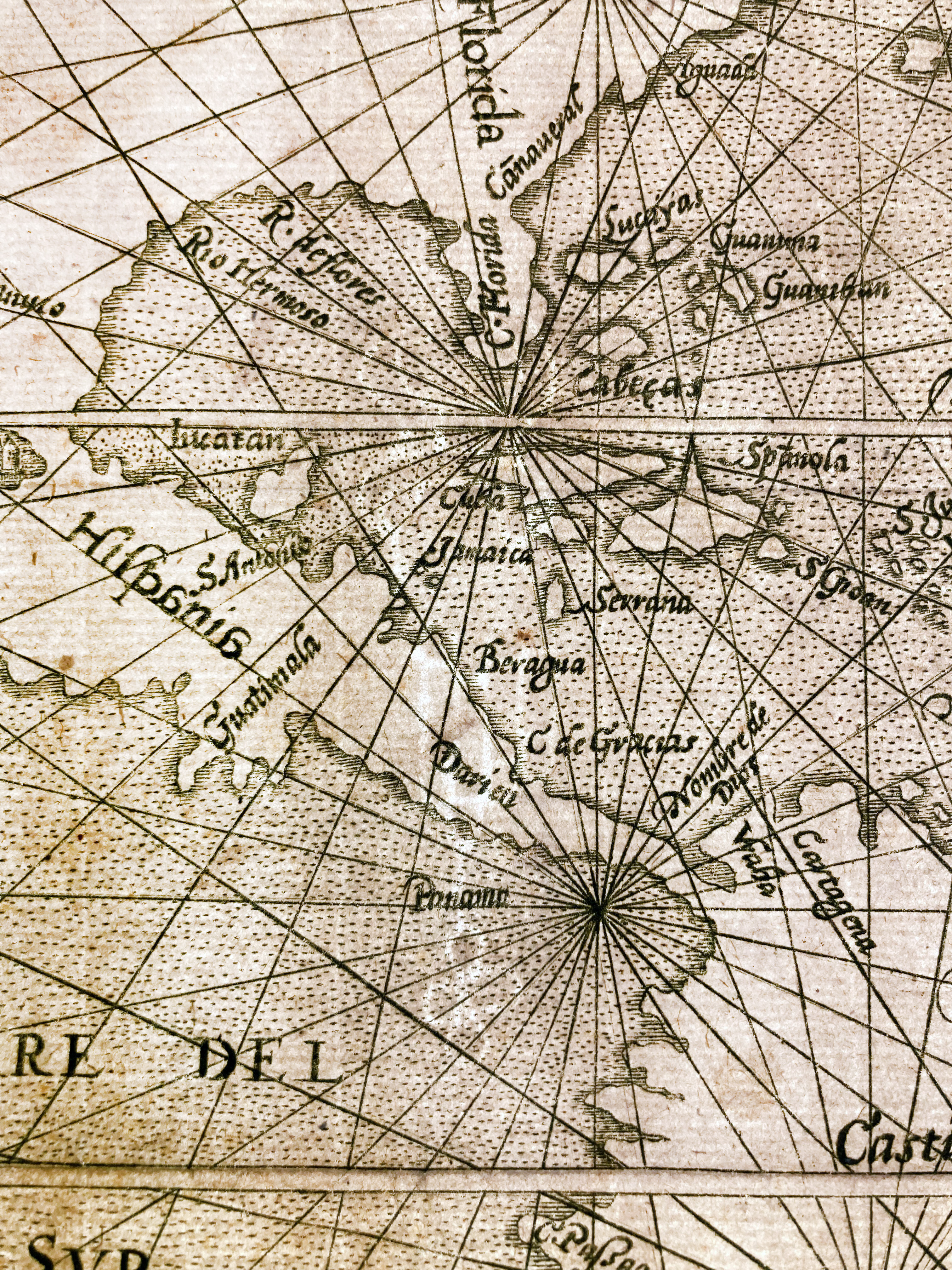Third state of an excessively rare map of the New World and the Atlantic Ocean. Where previously "Nouveau Monde" was engraved in the upper left cartouche this text was erased (still partly readable) and replaced by the date "1579". The equator is made visible by means of a horizontal double line. Nicolas de Nicolay (1517-1583), French geographer and traveler from Dauphiné. In 1556, he received the official title of "geographer to the king." Nicolay had traveled extensively in Northern Europe (Germany, Denmark, Livonia, Sweden, England, Scotland) on diplomatic missions. In 1551, Henry II ordered Nicolas de Nicolay to accompany Gabriel Aramon on an embassy to the Grand Turk Suleiman the Magnificent. - According to Burden 53 this ("extremely rare") map was published in a Dutch edition of Pedro de Medina's work 'L'Arte del navegar', published in Antwerp by H. Hendricksen, 1580; see also Bibl. Belgica IV, p. 312; Sabin not listing any of the Dutch translations. This third state has "Terra de Labrador" in lowercase as a distinguishing feature.€ 2000