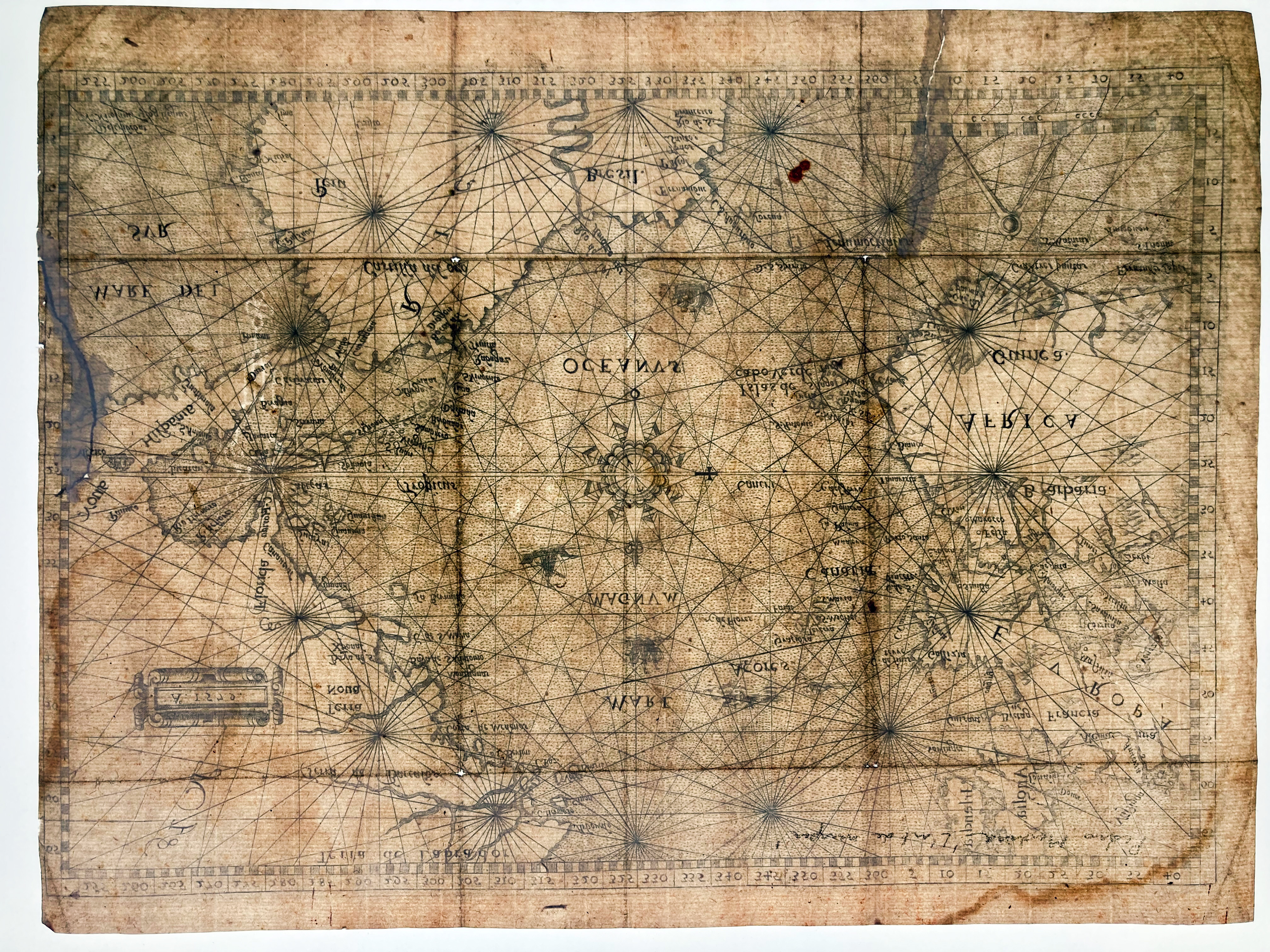 NORTH ATLANTIC -- (NORTH ATLANTIC CHART). 1579 (=Antwerp, 1580). Engr. sea chart by Nicolas de Nicolai w. scale indicator and compass rose, annotated in the plate: "Describebat N. Nicolaius Geog. Regius". 246 x 352 mm. (2 tears closed on v°, a bit stained, 4 very tiny holes at the intersection of folds, left outer margin short).
