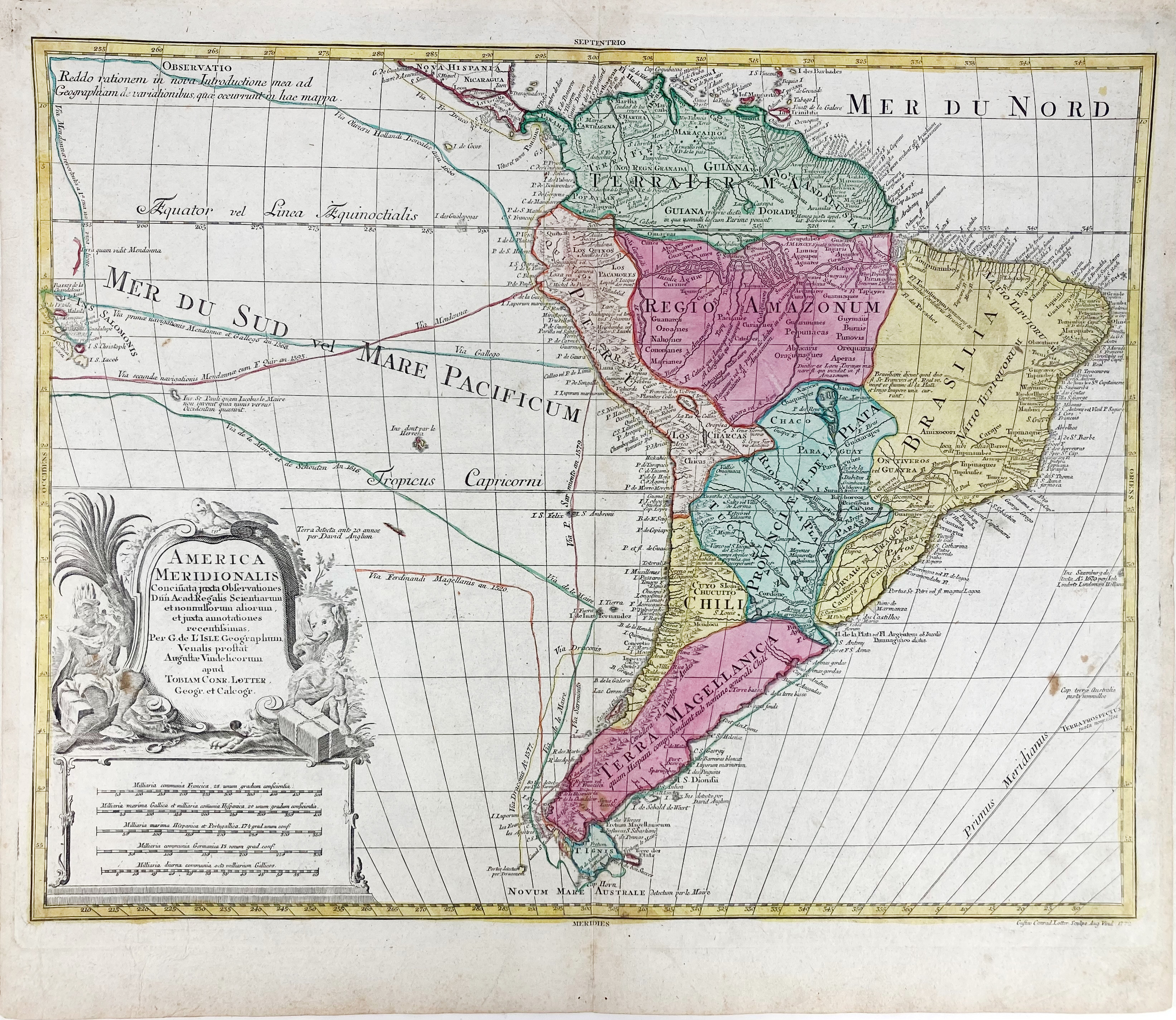 SOUTH AMERICA -- "AMERICA MERIDIONALIS". Augsburg, T.C. Lotter, 1772. Engr. map in cont. colouring w. large title cartouche. 490 x 600 mm. (A bit age-toned, small brown spots in right lower corner, but in fair condition). -- Added: "L'AMERIQUE selon l'etendue de ses principales parties (…)". Augsburg, M. Will, n.d. (c. 1810). Handsomely cold. engr. map of South America w. large title cartouche. 498 x 590 mm. (Some small annot. in ink added in the image in places). -- (2).