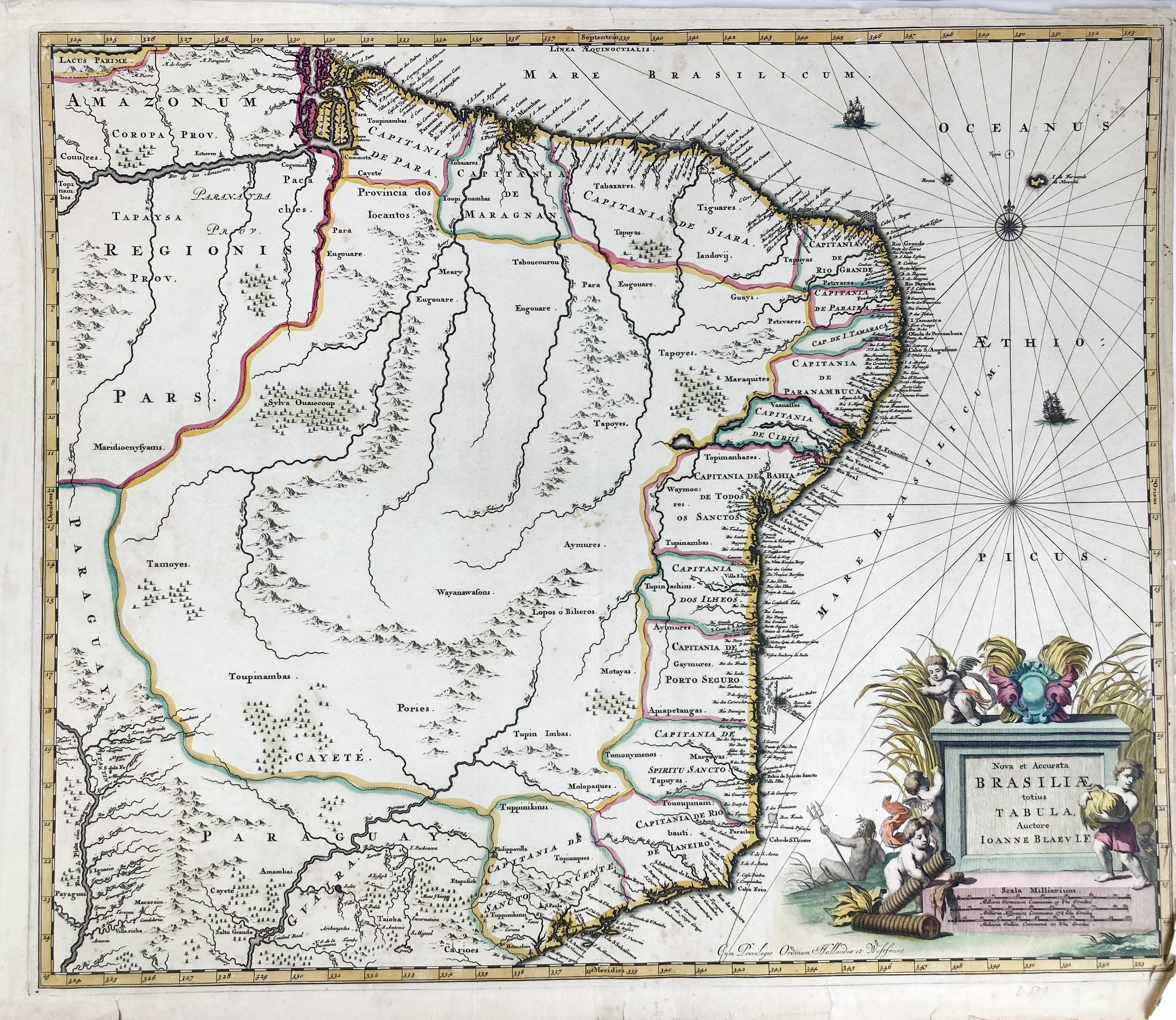 SOUTH AMERICA -- BRAZIL -- "BRASILIA". (Amst.), J. Blaeu, (1642/43). Engr. map in fine cont. colouring. -- Added: "NOVA ET ACCURATA BRASILIAE totius tabula". (Amst.), J. Blaeu, (after 1662?). Engr. map in cont. colouring. 500 x 600 mm. (Margins short/cut on plate edge, margins partly in need of repair, espec. outer lower right corner). -- Added: 2 plain engr. maps of (parts of) Brazil. -- (4).