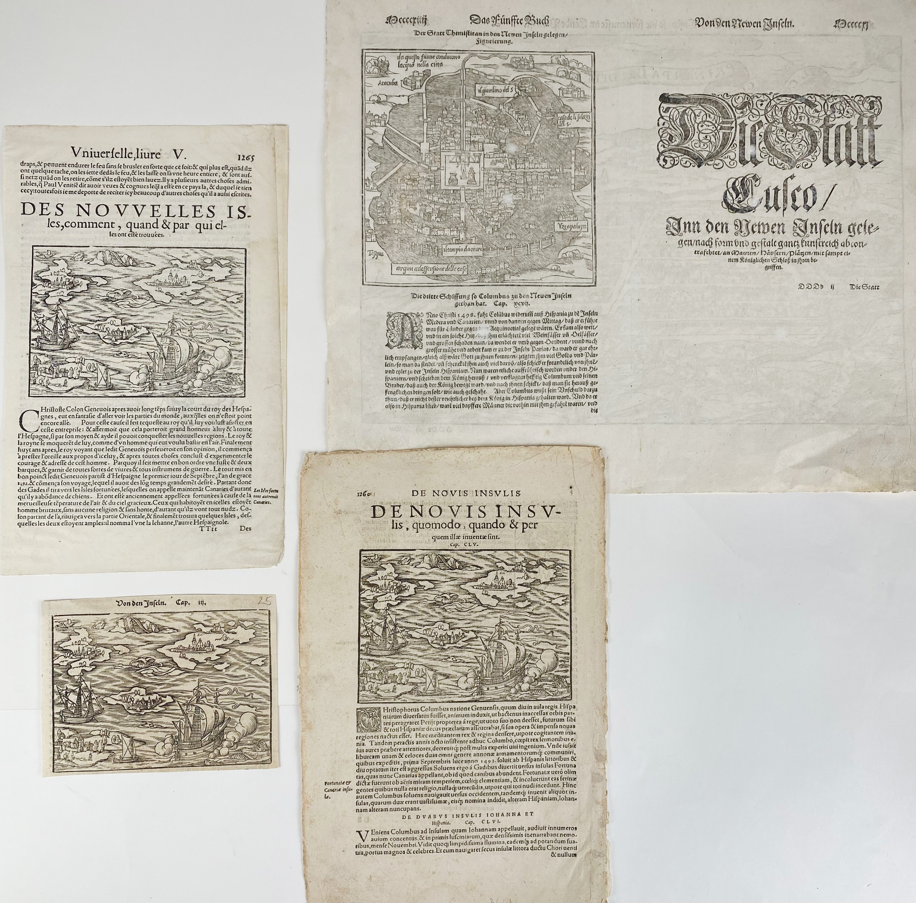 SOUTH AMERICA -- "DIE STATT CUSCO / so die fuernemeste im Landt Peru ist." Woodcut perspective view of Cusco, taken from S. Münster's 'Cosmographia'. 2nd half 16th c. 275 x 378 mm (block size). -- And 1 o. woodcut (3 states) from Münster's 'Cosmographia'. (4).