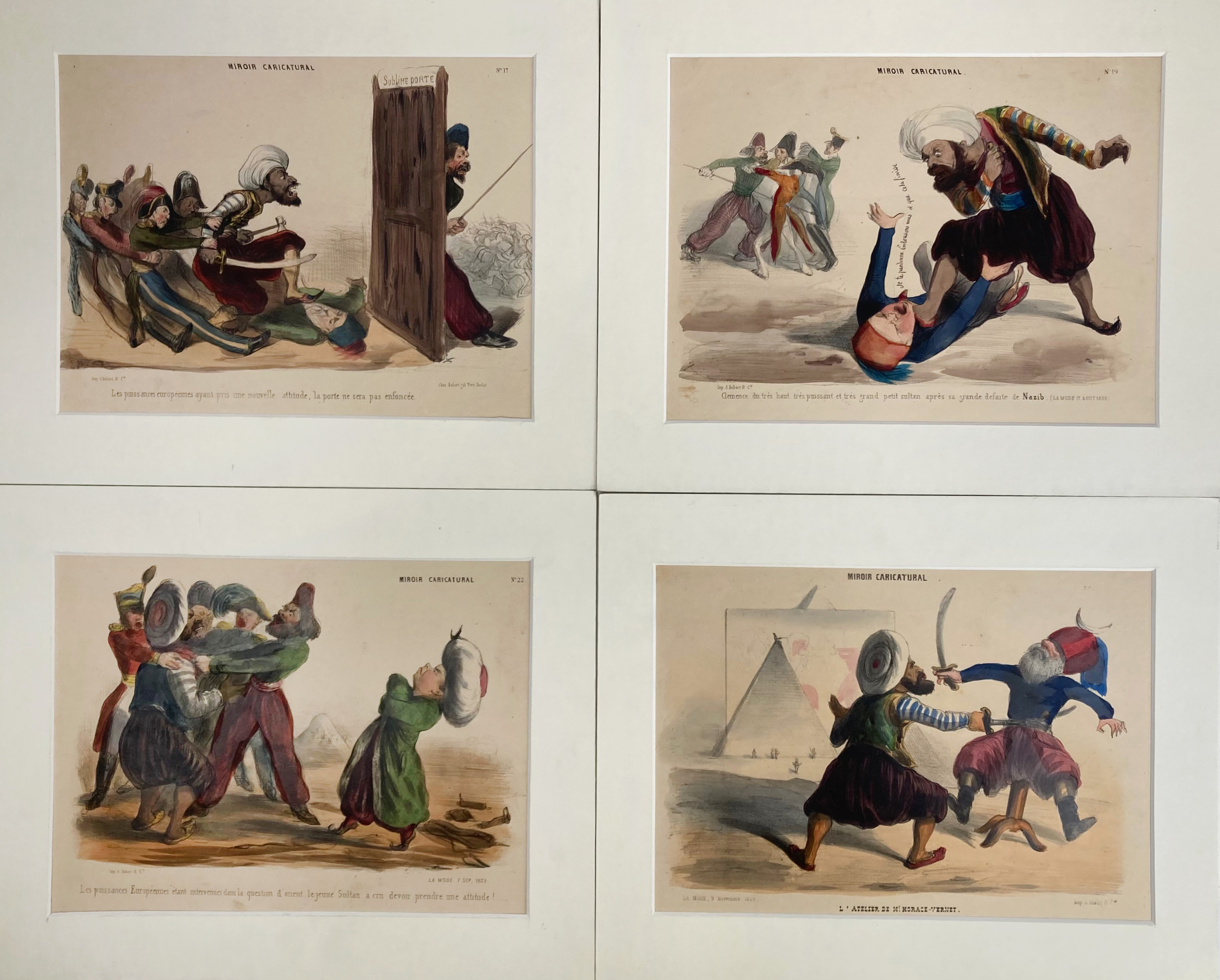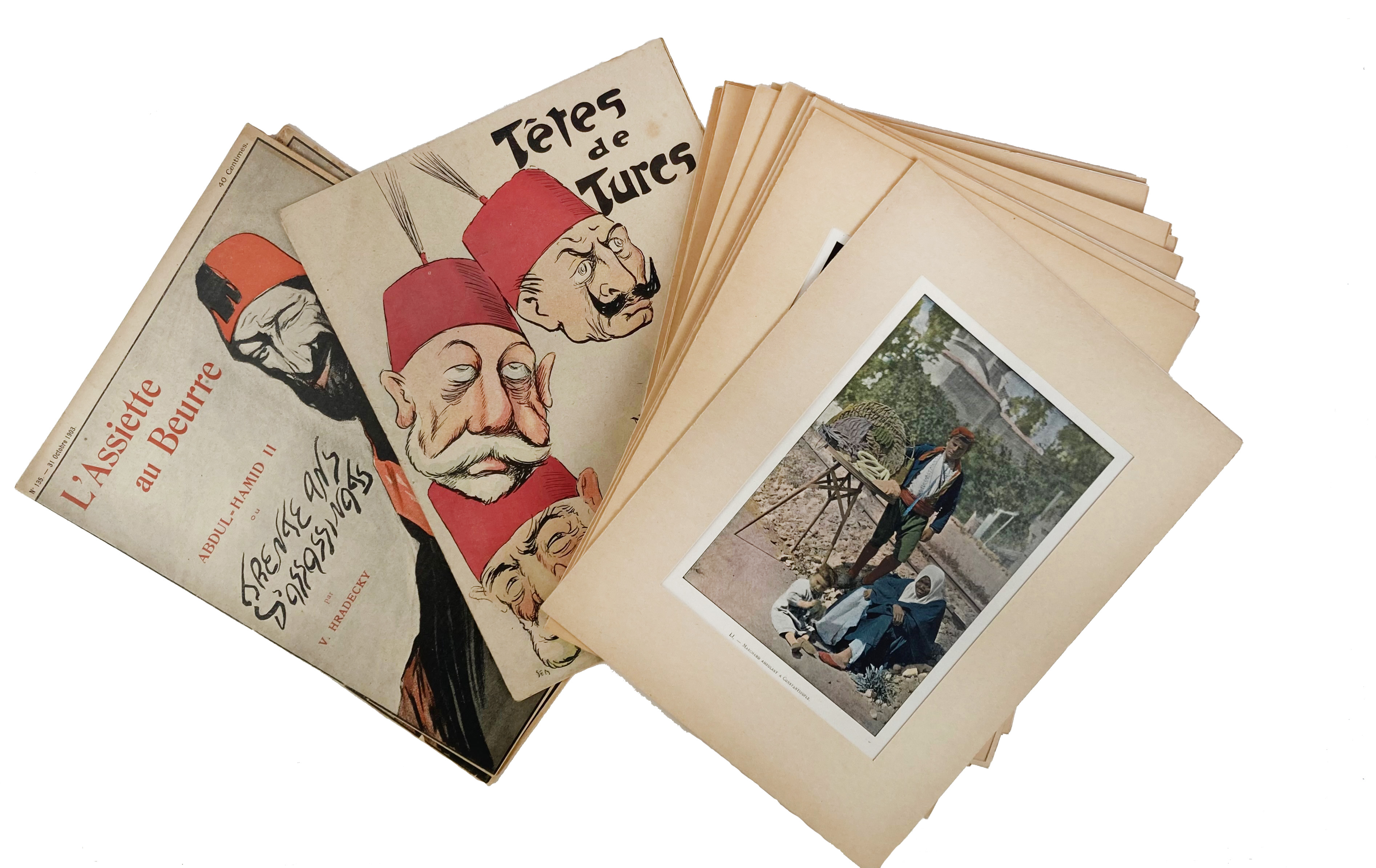 TURKEY -- CARICATURE - SATIRE -- COLLECTION of 5 prints pertaining to a crisis of succession at the Turkish court. 1839. Handcold. lithographs by B. Roubaud. 260 x 345 mm (image size). Originally published in the Miroir Caricatural, a supplement to the magazine La Mode. -- Added: V. HRADECKY. Abdul-Hamid II ou Trente ans d'assasinats. 1903. Owrps. (L'Assiette au Beurre, vol. 135.). -- A LA BAÏONETTE Num. 2. Tetes de Turcs. Num. spécial. 1915. Owrps. -- Ch. GILLOT. Coll. of 16 prints of life in Turkey. (c. 1900). -- (23).