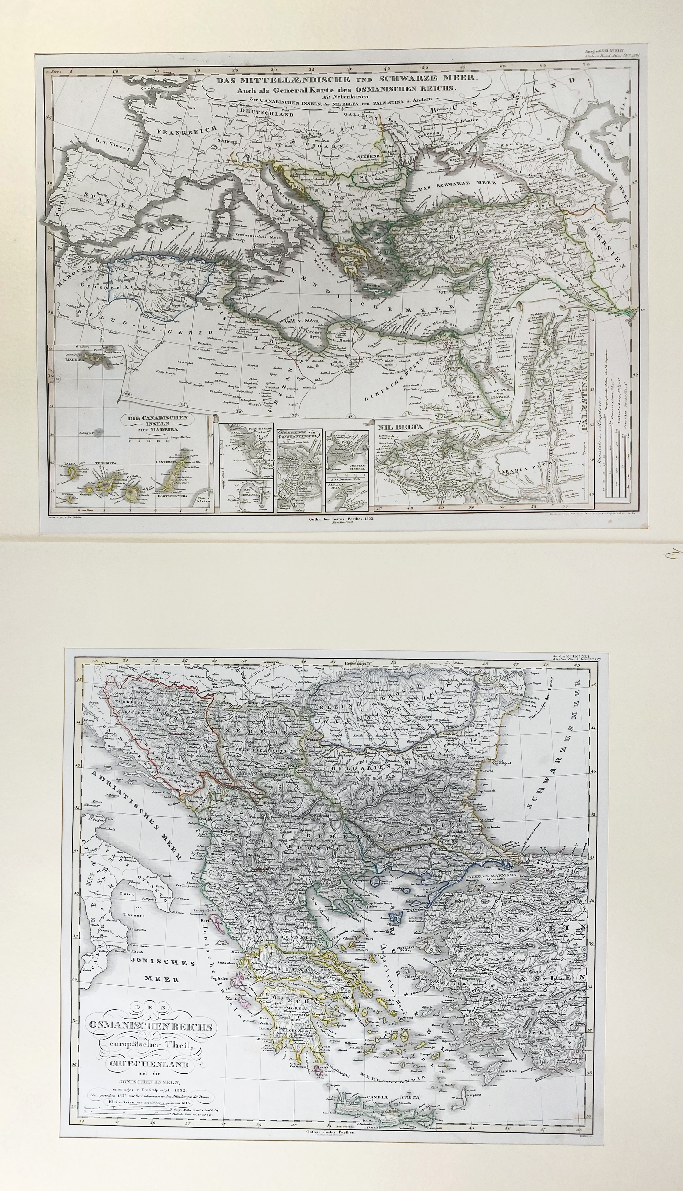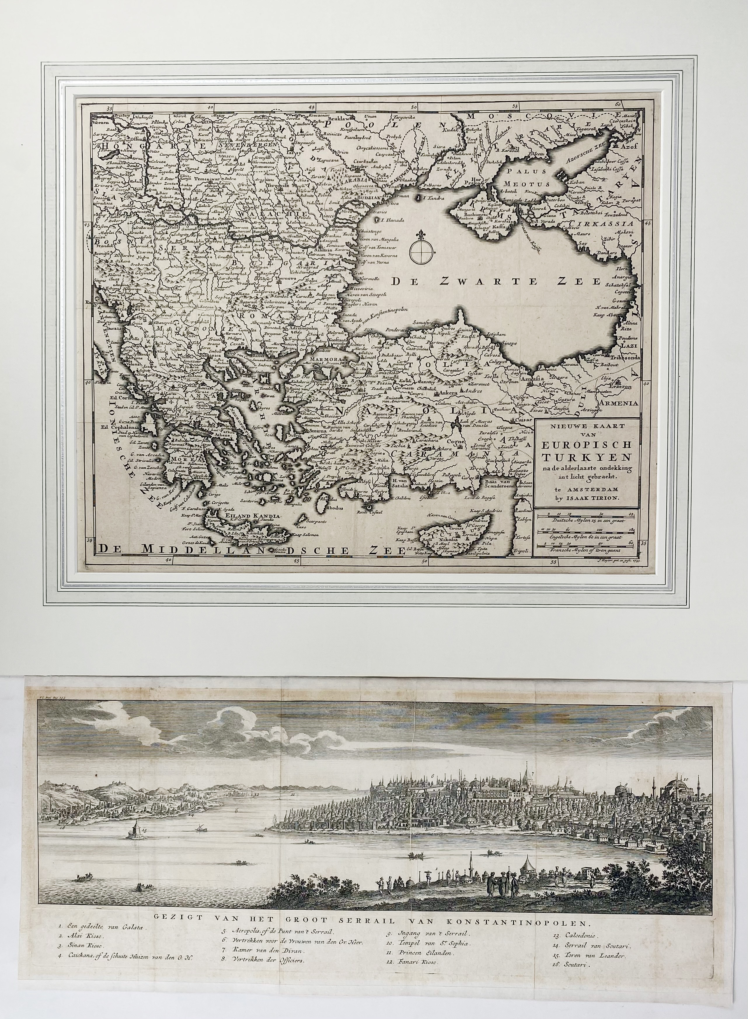 TURKEY -- "CARTE DE l'ASIE MINEURE ou de la Natolie et du Pont Euxin, tirée des Voyages et des Observations des Anciens et Modernes et Dressée suivant les principes d'une nouvelle Projection (...)." Nuremberg, Homann heirs, 1743. Engr. map by J.H. Haas, partly handcold. 490 x 585 mm. (A few spots). -- "NIEUWE KAART VAN EUROPISCH TURKYEN na de alderlaatste ontdekking int licht gebracht." Amst., I. Tirion, 1733. 290 x 354 mm. Mounted to passepartout. -- Added: "GEZIGT van het Groot Serrail van Konstantinopolen." (Amst., I. Tirion, 1734). 170 x 340 mm. (Sl. foxed, traces of former hinging). -- And 14 o. maps of Turkey and surroundings, 18th-19th c., dif sizes. (17).