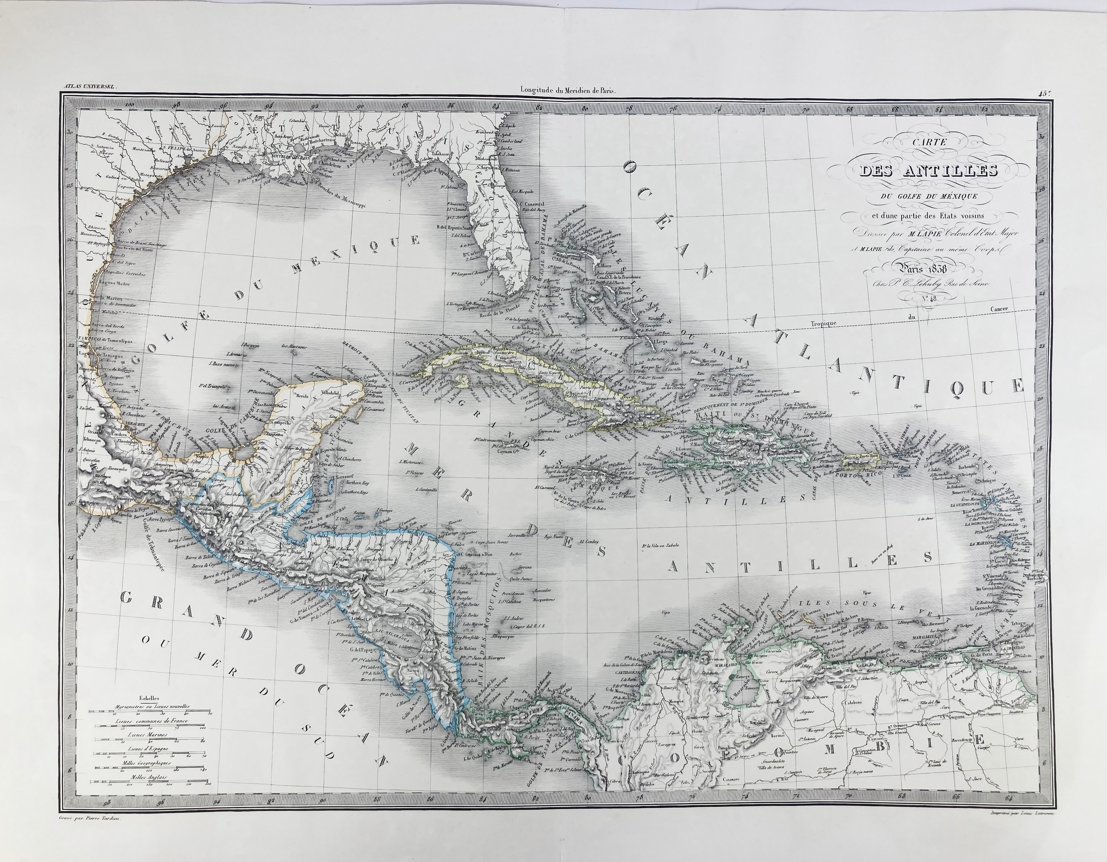 WEST INDIES -- "CARTE DU GOLFE DU MEXIQUE. Dressée pour l'intelligence de l'histoire generale des Voyages de Laharpe, par Ambroise Tadieu". 1821. Engr. map, cold. in outlines. 405 x 540 mm. -- "CARTE DES ANTILLES du Golfe de Mexique et d'une partie des Etats voisins". Paris, L. Letronne for P.C. Lehuby, 1838. Engr. map by P. Tardieu after (P.) Lapie and (P.) Lapie Fils. 395 x 550 mm. -- Added: 7 maps and views of Cuba/Hispaniola, St. Lucia, Martinique and Antigoa, and two views of Martinique and Jamaica, partly cold. by hand. -- And 1 o. (9).