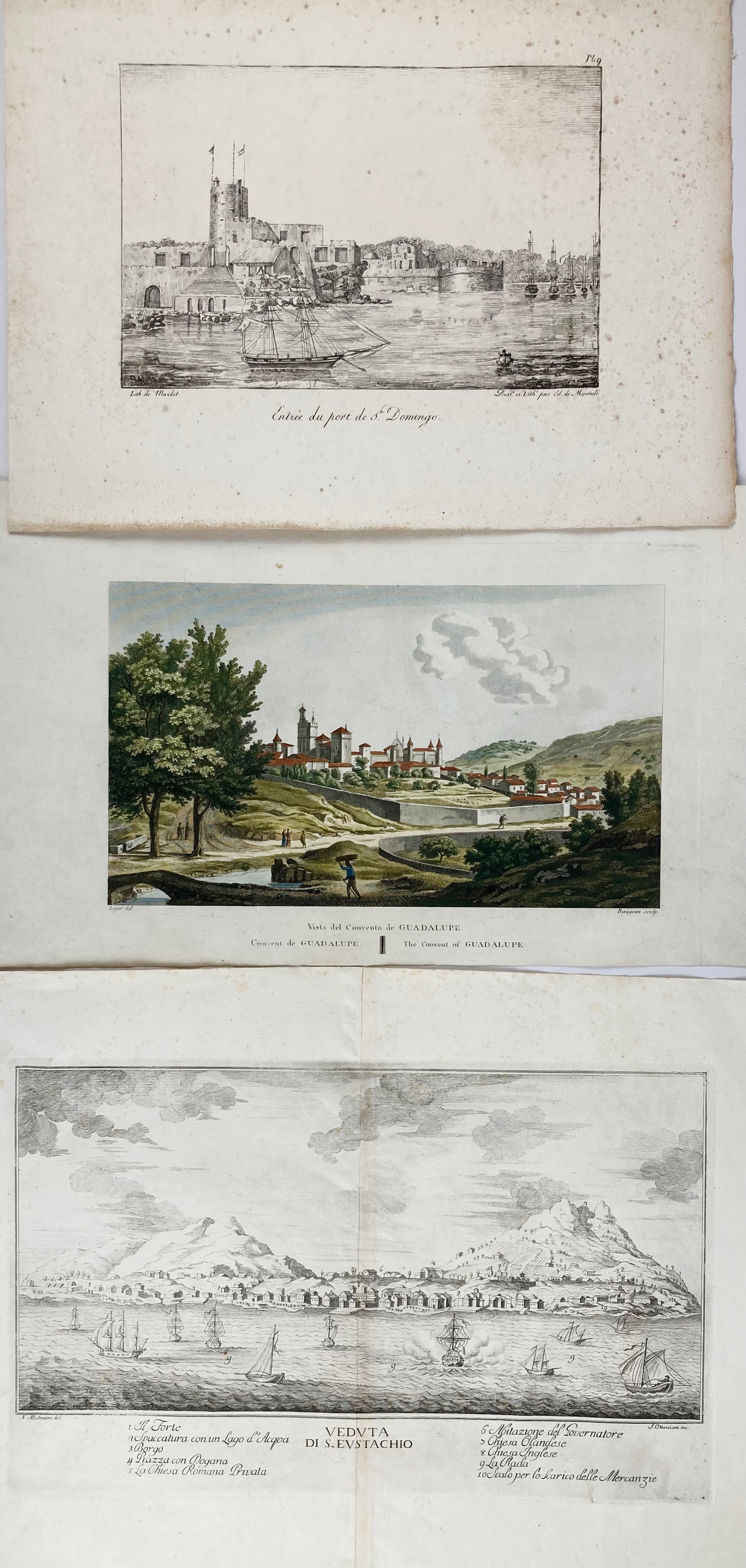 I.a.: "PERSPECTIVE VIEW of Roseau in the Island of Dominica in the West Indies". Engr. for Middleton's Complete System of Geography, c. 1780. -- "VIEW of the Island of St. Thomas taken from Havensicht". Lond., Longman, (etc.), 1812. -- "LA VILLE ET ISLE de St. Martin dans l'Amerique". Leiden, P. v.d. Aa, (1671). -- "VEDUTA DI S. EUSTACHIO". Engr. after Malraini by Ottavicini.