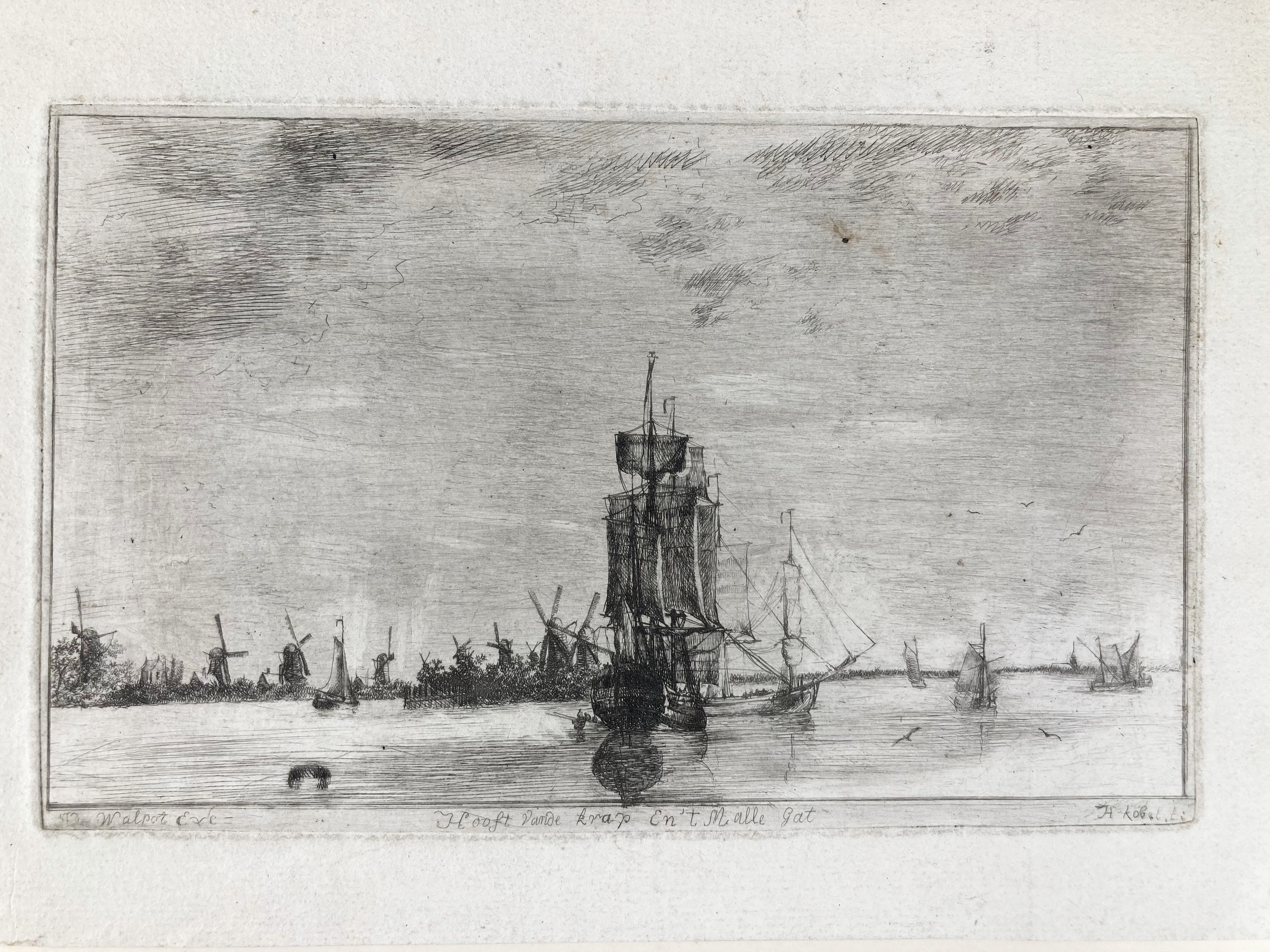 BOUT, Pieter (1640/45-1689/1719). (Fish market on the beach at Scheveningen). (Antw.), Mart. v.d. Enden, (c. 1664/74). Etching. 190 x 280 mm. Signed in the plate. (Margins short, small diagonal stain in right upper corner, a bit age toned). Hollstein Dutch 1-2(2). -- Added: Hendrik KOBELL (1751-1779). "Hooft van de Krap en 't Malle Gat". (Dordrecht?), A. Walpot, 1762/79. Etching. 145 x 230 mm. Signed in the plate. View of the Krabbegeul and Mallegat. State 2 (of 2). - De Groot/Vorstman 184. -- (2).