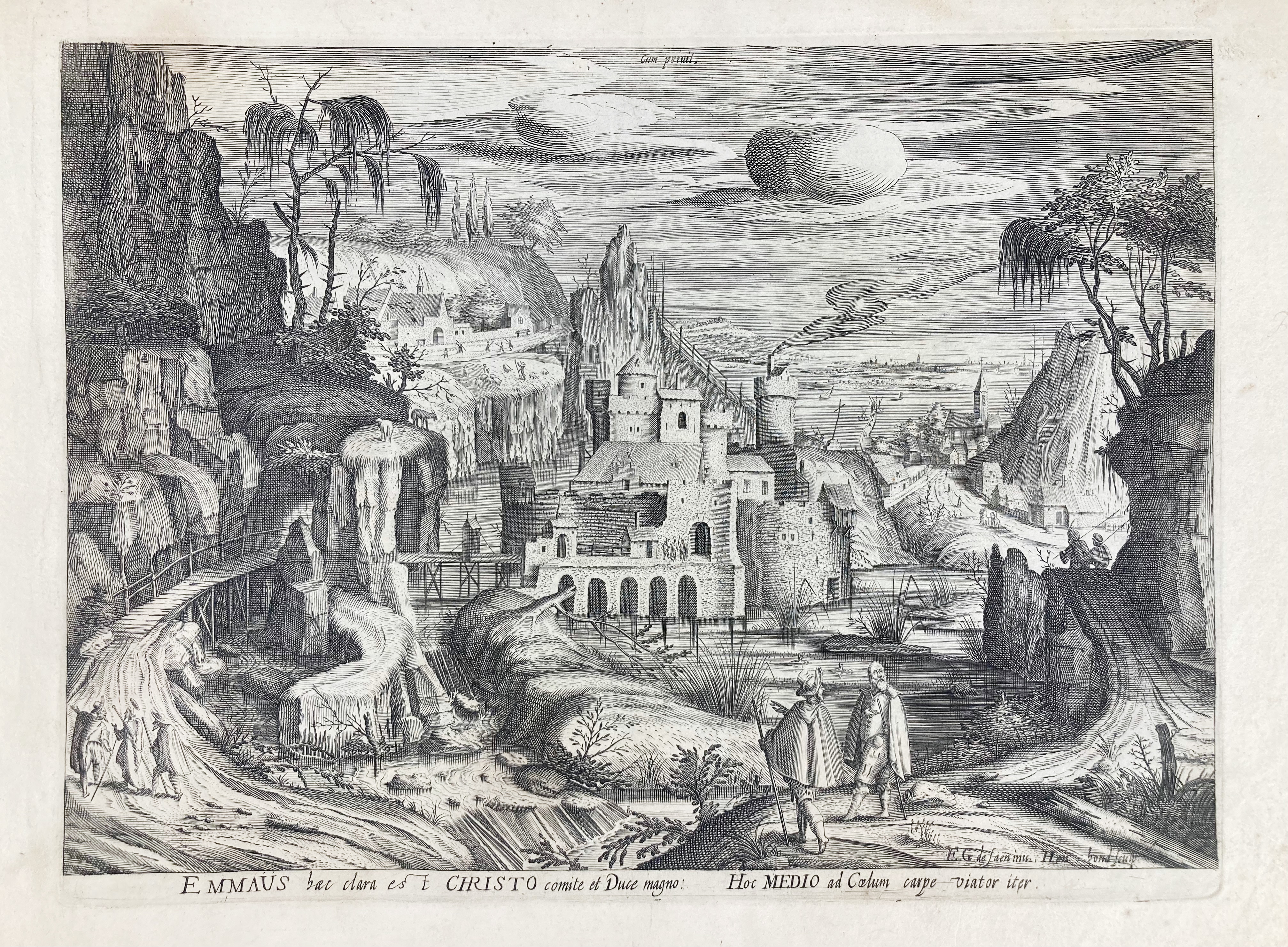 HONDIUS the Younger, Hendrik (1597-after 1644). (The Times of the Day:) "Hesperus". (1605). Engr. after Pieter Stevens II (1567-1624). 234 x 333 mm. (Soiled/browned). -- Added: Id. "Emmaüs haec clara est Christo comite et Duce magno: Hoc Medio ad Coelum carpe viatorviter". (c. 1600). Engr. after Giliaeme de Zaen/Saen (c. 1563-1599). 213 x 283 mm. (Soiled/browned). -- Added 3 o. Biblical scenes. (5).