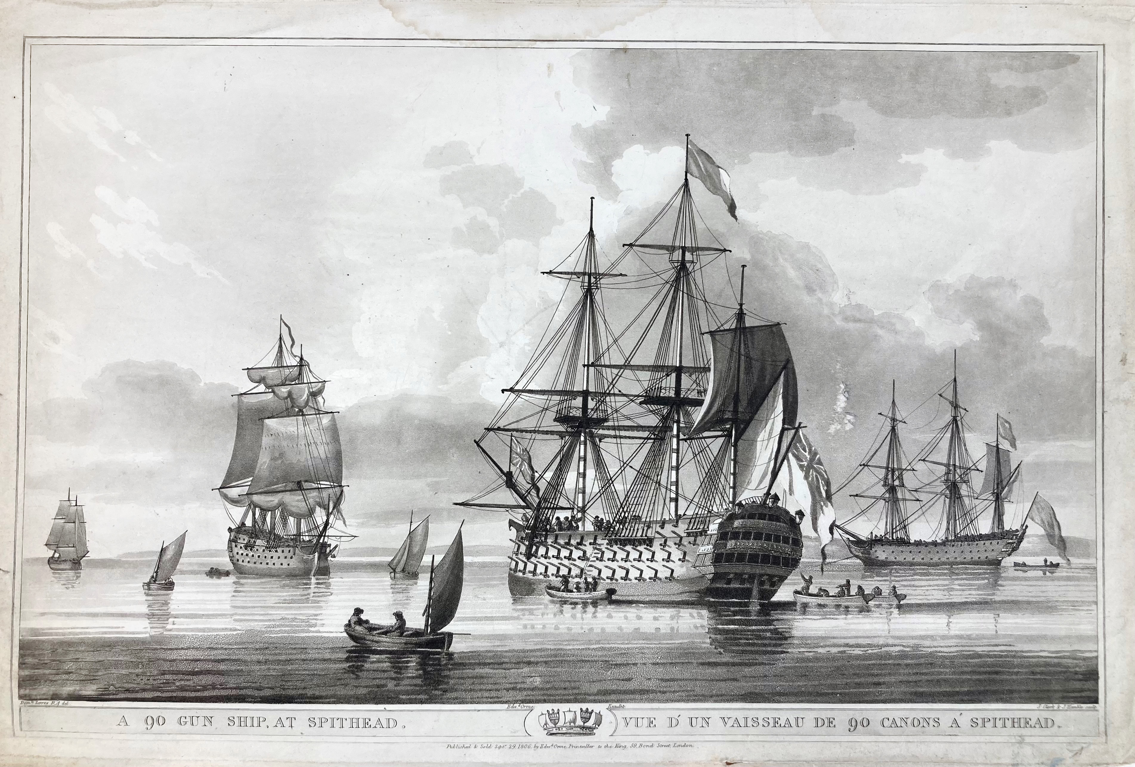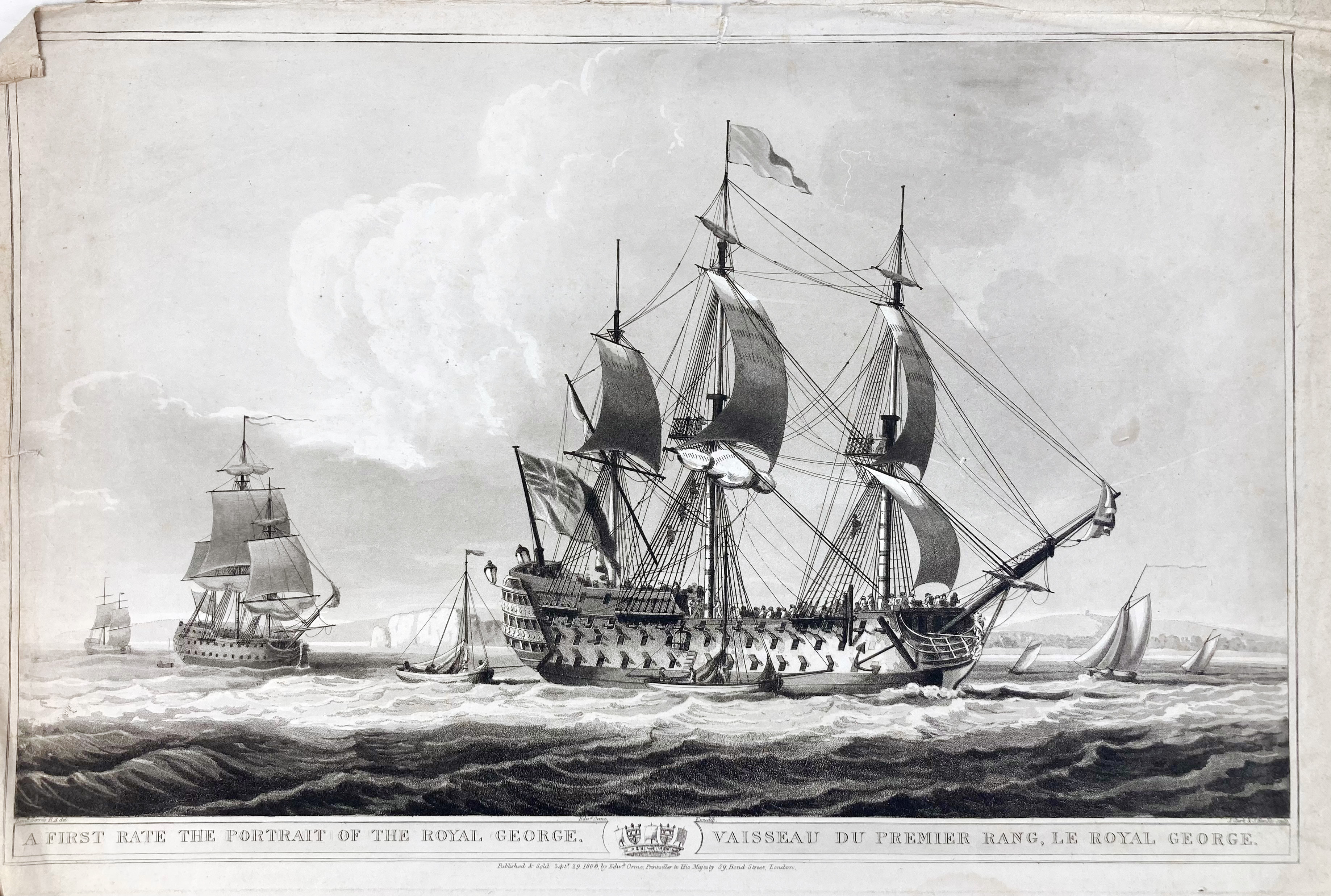 MARITIME SCENES -- "A SHIP OF THE LINE IN THE DOWNS/Vue d'un vaisseau de guerre dans les dunes" - "A FIRST RATE THE PORTRAIT OF THE ROYAL GEORGE/Vaisseau du premier rang, le Royal George" - "A 90 GUN SHIP, AT SPITHEAD/Vue d'un vaisseau de 90 canons a Spithead" - Lond., Edw. Orme, 1806. 3 plain mezzotint maritime scenes after D. Serres. 290 x 445 mm. (Margins dam.). - Sold w.a.f., not subject to return.