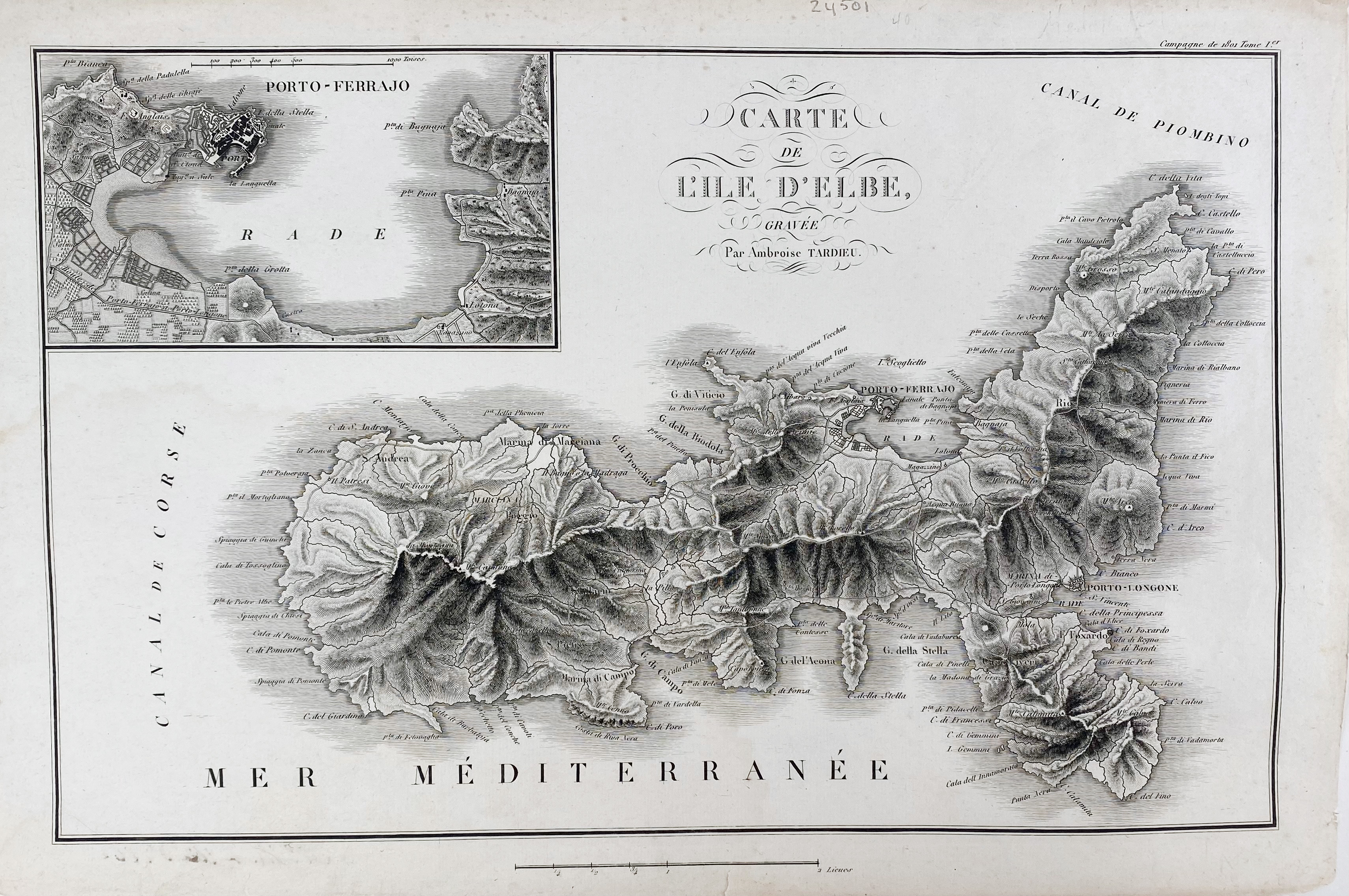 NAPOLEONIC WARS -- ("HET VERBRANDEN DER WONINGEN en tuinhuizen over den Yssel by Deventer, door de Franschen; en het aanvallen der Kozakken op den 26 November 1813"). (c. 1813). Engr. by J.E. Marcus after N. Sonnenberg. Plate edge 397 x 485 mm. (Margins sl. foxed). Rare proof print. Atlas v. Stolk 6220. -- Added: Small map of Elba. -- (2).