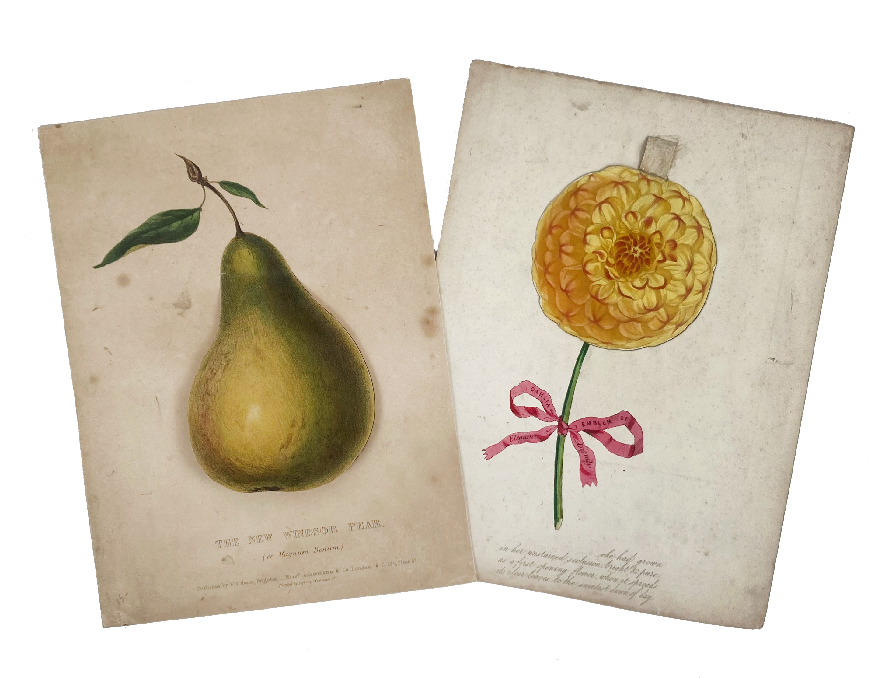 NOVELTY CARDS -- "THE NEW WINDSOR PEAR (Or Magnum Bonum)". (c. 1840). Handcold. lithograph of a pear which folds ca. 3 cm from the top, revealing a double-portr. of Queen Victoria & Prince Albert. 180 x 240 mm. (Some dust stains). -- "DAHLIA EMBLEM OF ELEGANCE and Dignity". (c. 1840). Handcold. lithograph of a flower, partly attached w. strip of paper, with a portr. of a royal lady below. 180 x 240 mm. (Margins dusty). -- (2).