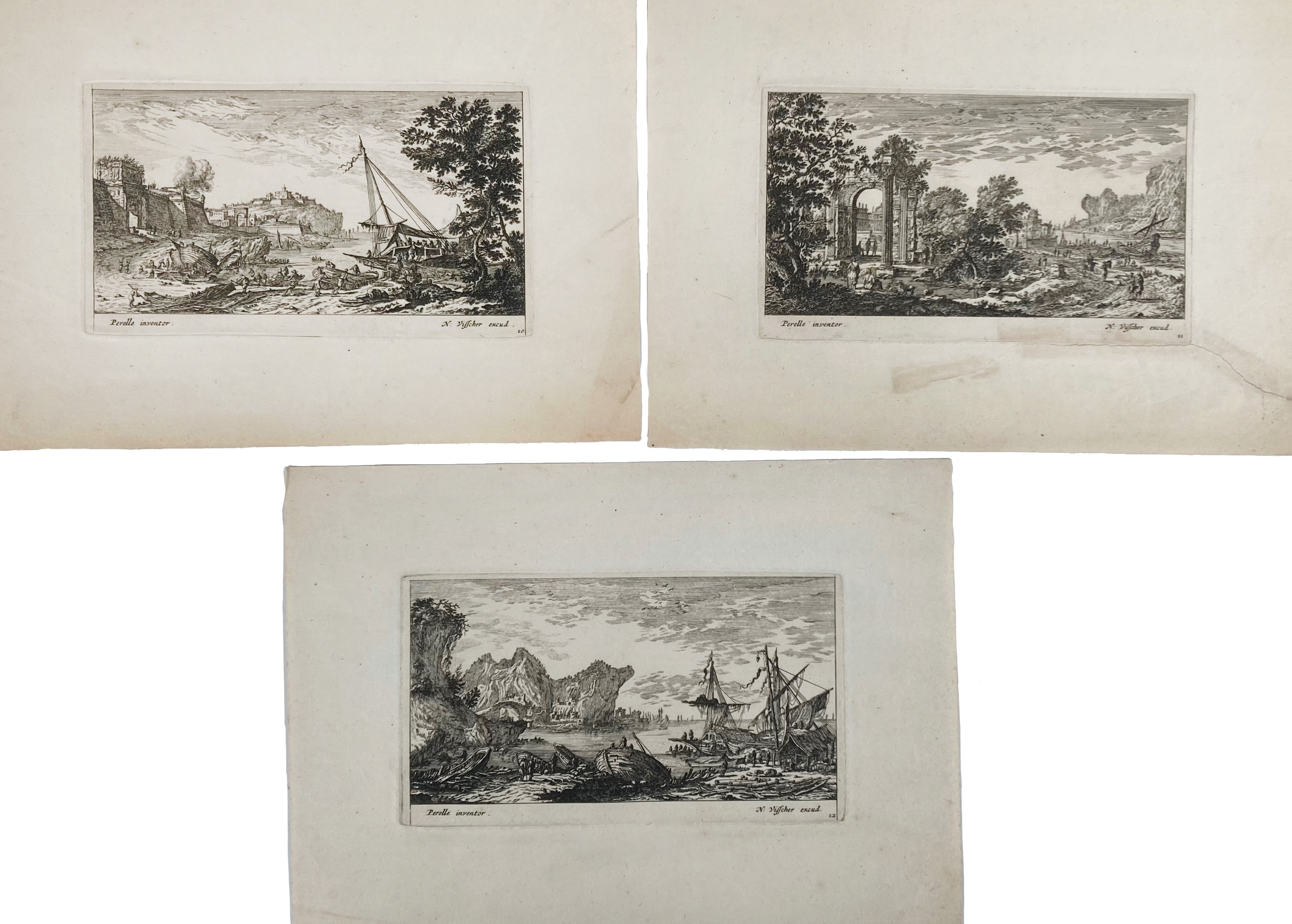PERELLE, N. Divers veues de Ports de Mer / Verscheyde Zee-Havens. (Amst.), N. Visscher (II), 17th c. 12 etchings. All c. 180 x 260 mm. Printed on laid paper w. foolscap watermark. In improvised foolscap portfolio. (Print 1 & 2 w. some spots, print 11 torn on the edge of the plate (no image loss), repaired w. paper, some marginal yellowing).