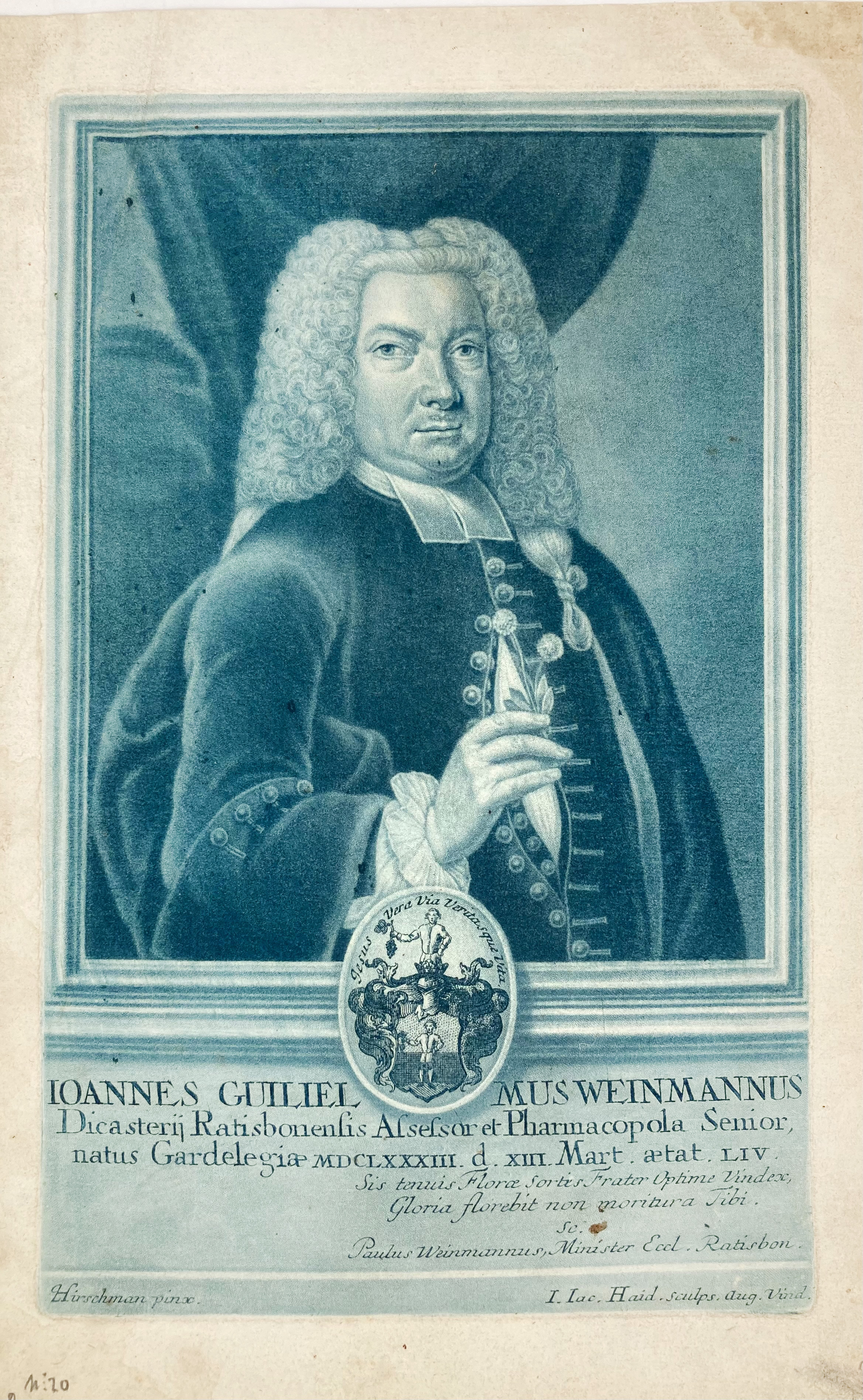 PORTRAITS -- "ALBERTUS SEBA, Etzela Oostfrisius Pharmacopoeus Amstelaedamensis (…) aetatis LXVI anno MCCXXXI". (1731). Very fine engr. portrait by J. Houbraken after J.M. Quinckhard. 442 x 303 mm. (A bit foxed along blank margins, but in v.g. condition). -- Added: "HERMANNUS BOERHAAVE. Medicinæ, Botanices, Chemiæ & Collegii practici, (…)". (c. 1725). Engr. portr. after Wandelaar (by J. Houbraken). 345 x 245 mm. -- And: "JOANNES GUILIELMUS WEINMANNUS". (c. 1735). Mezzotint portr., printed in blue ink by J.J. Haid. 320 x 203 mm. -- (3).
