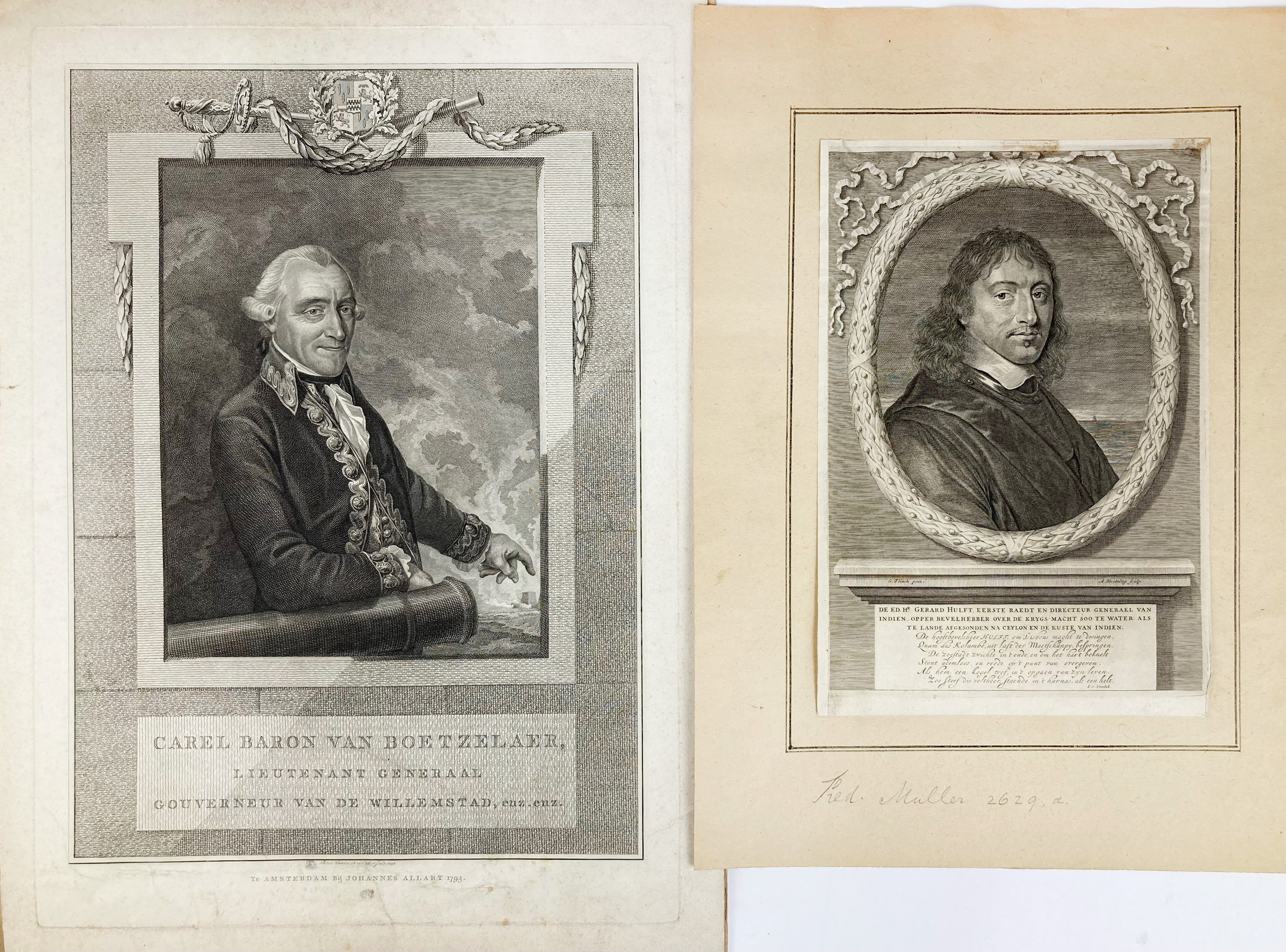 PORTRAITS -- "GERARD HULFT, De Ed. Hr., (…), opper bevelhebber (…) afgesonden na Ceylon en de kuste van Indien". Engr. portr. by A. Blooteling after G. Flinck. 280 x 190 mm. Captioned in the plate. Hinged to mount. (Margins short). -- "GEERARDUS OORTHUYS, kapitein ter zee". R'dam, T. Krap, c. 1782. Engr. portr. by R. Muys. 345 x 242 mm. 'Proefdruk'. -- "JOHAN ARNOLD ZOUTMAN, vice admiraal van Holland en Westvriesland". Engr. portr. by R. Vinkeles. 335 x 246 mm. 'Proefdruk'. -- "CAREL BARON VAN BOETZELAER, Lieutenant Generaal Gouverneur van Willemstad, enz." Amst., J. Allart, 1793. Engr. portr. by R. Vinkeles. 450 x 320 mm. Tipped in on mount. (A bit soiled/thumbed). -- And 22 o. portrs. of naval and land forces commanders. (26).