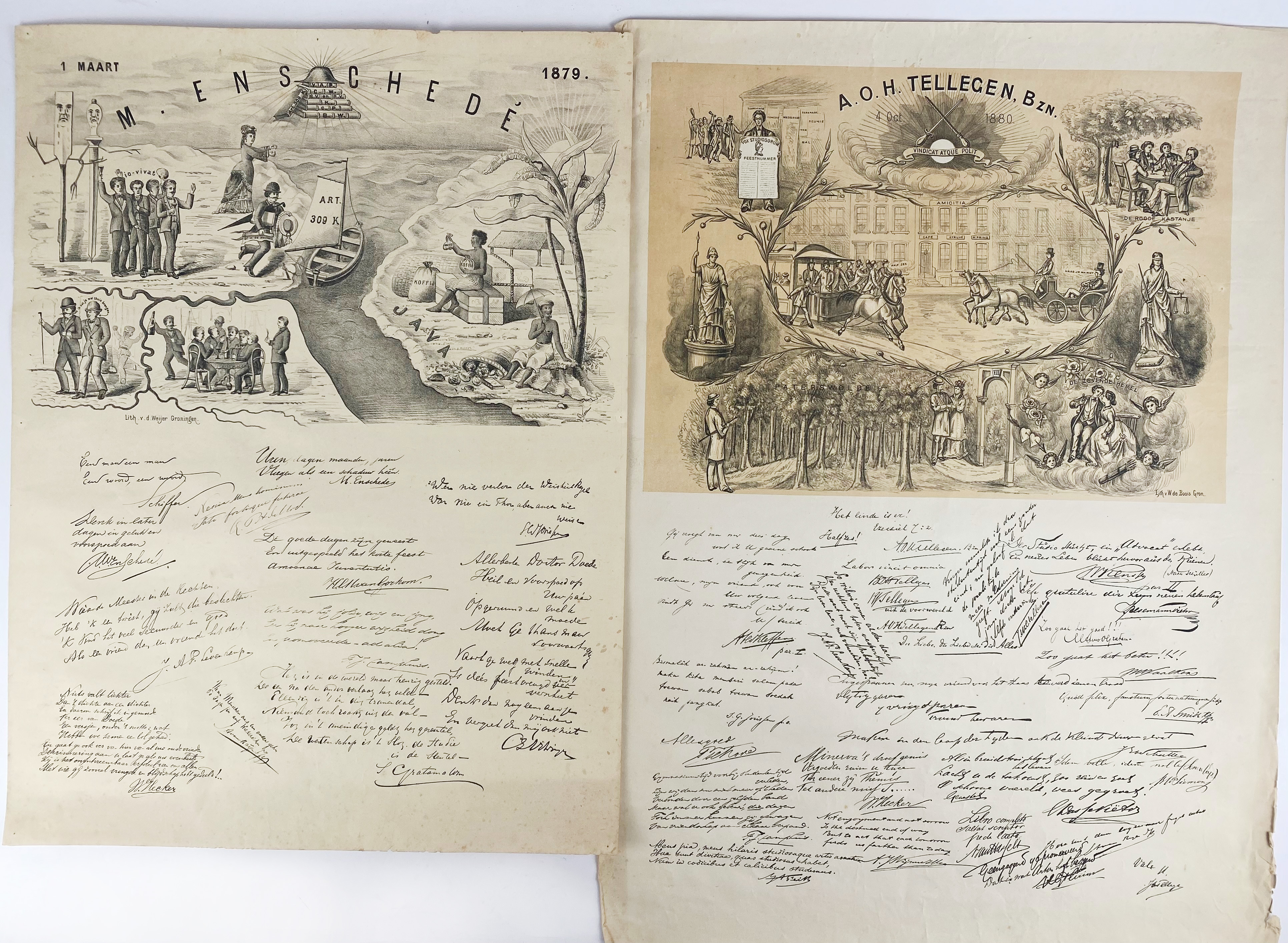 UNIVERSITIES/STUDENTS -- GRONINGEN -- COLLECTION of 15 doctoral graduation prints ('promotieplaten') of Groningen University. All late 19th c. Of which 8 w. (tinted) satirical lithogr. ill. Dif sizes: mostly c. 680 x 500 mm. (Margins dam./torn in places, a bit age-toned/foxed).