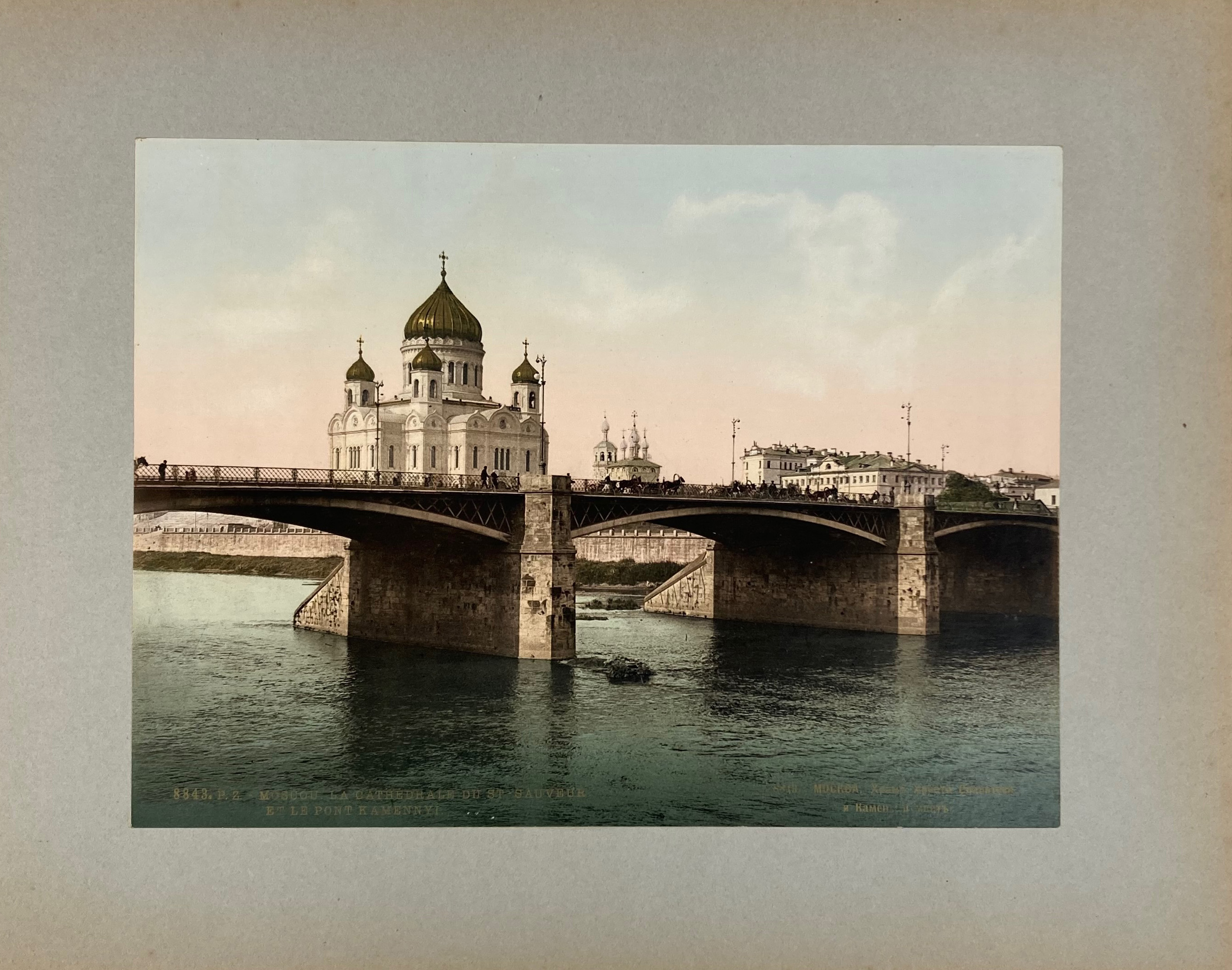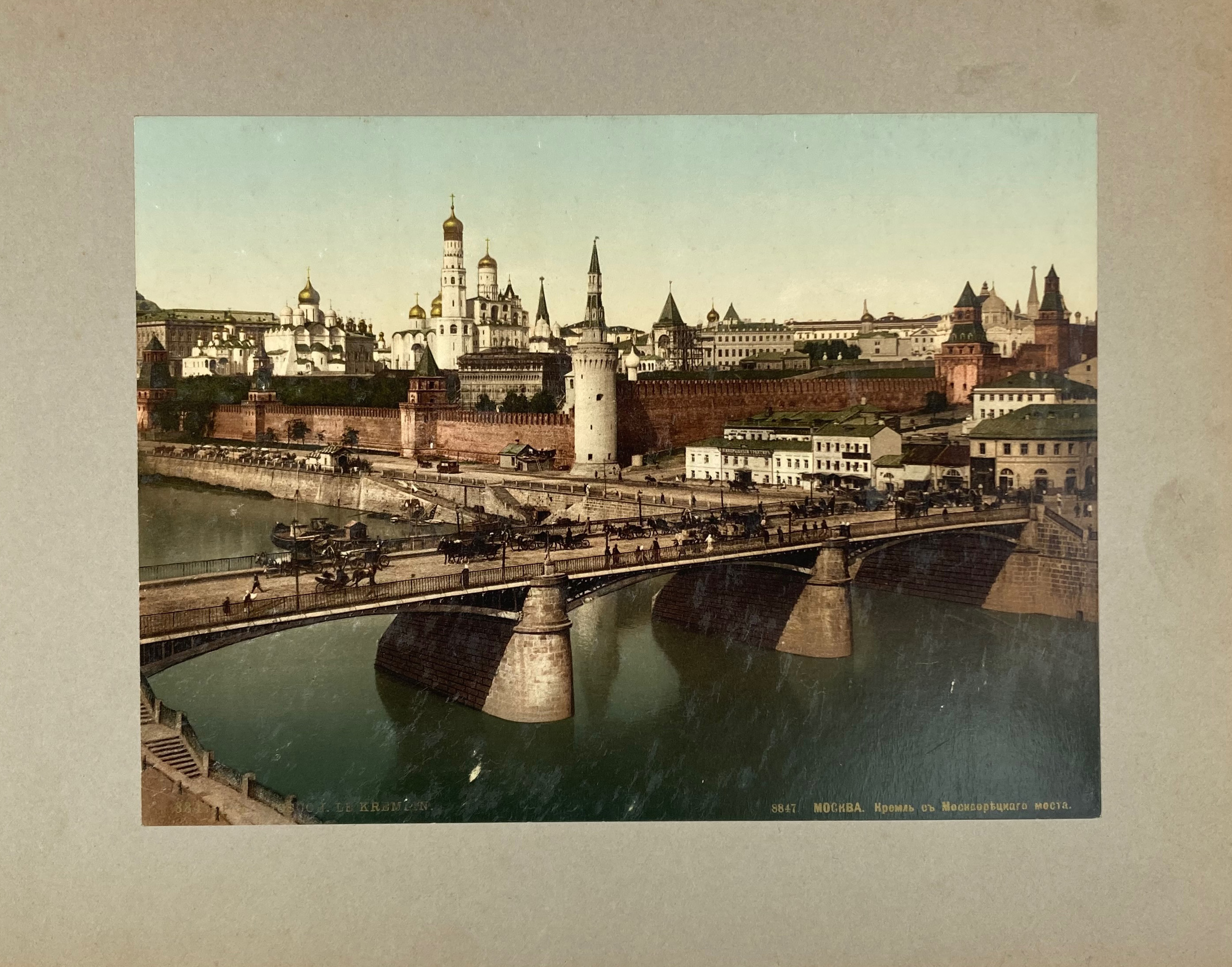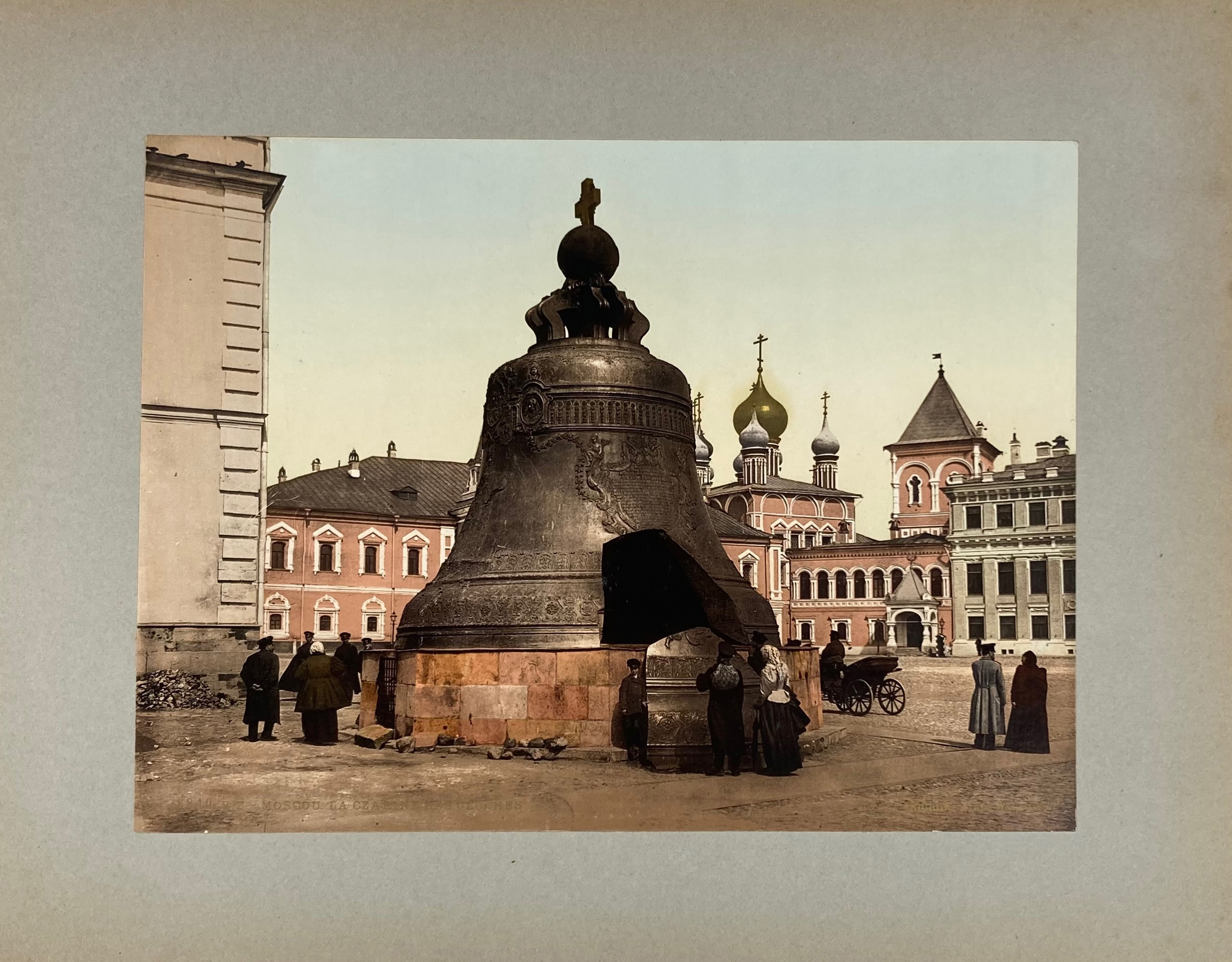 RUSSIA -- SOUVENIR DE MOSCOU. (Zürich, Photoglob, ca. 1900). Album containing 15 photochroms depicting several buildings & views in Moscou, handsomely handcold. & laid on mounts, w. captions in French & Russian in the picture. Fol.-obl. Cont. cl. w. gilt lettering. (Some wear to spine ends but both album & pictures very well-preserved).