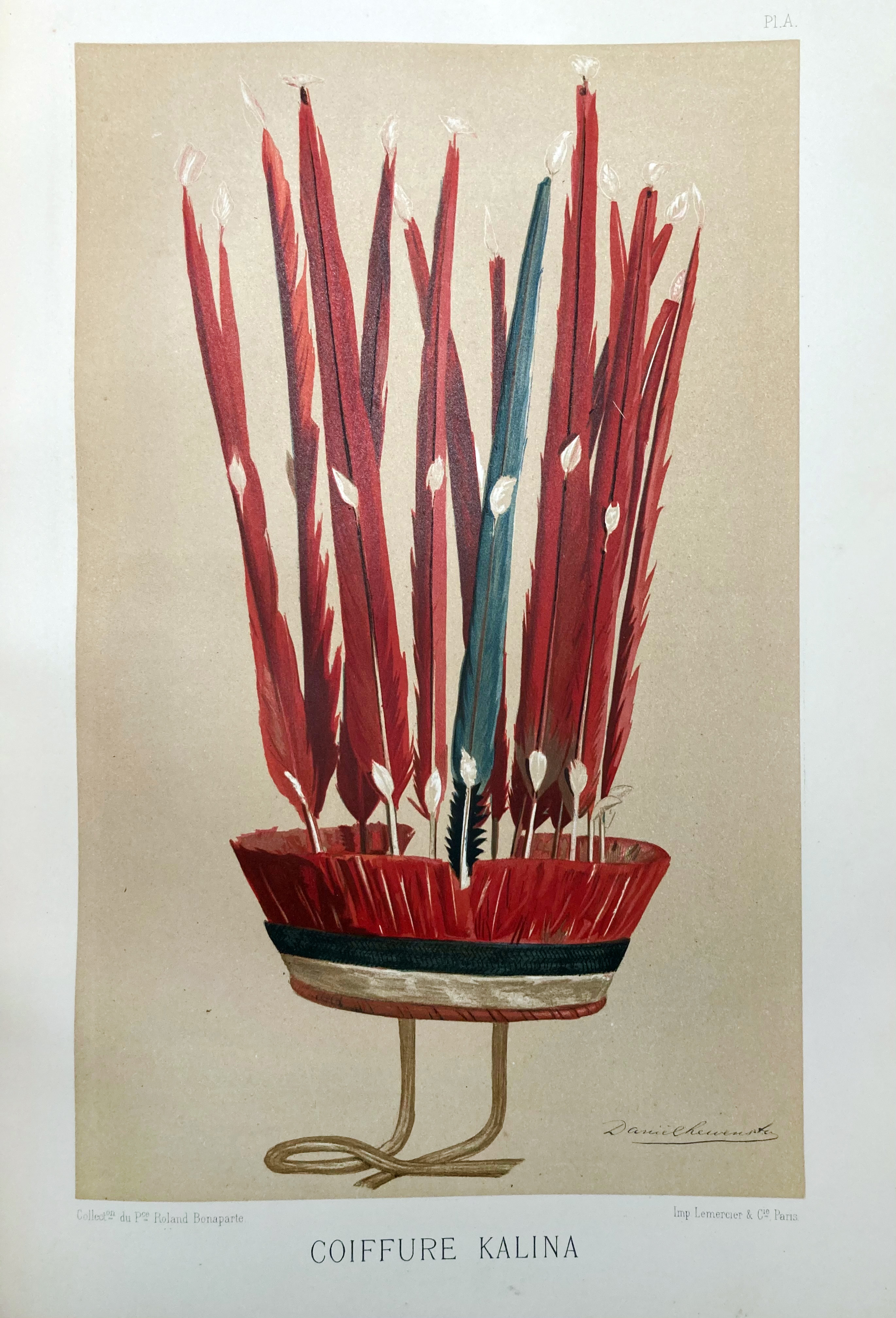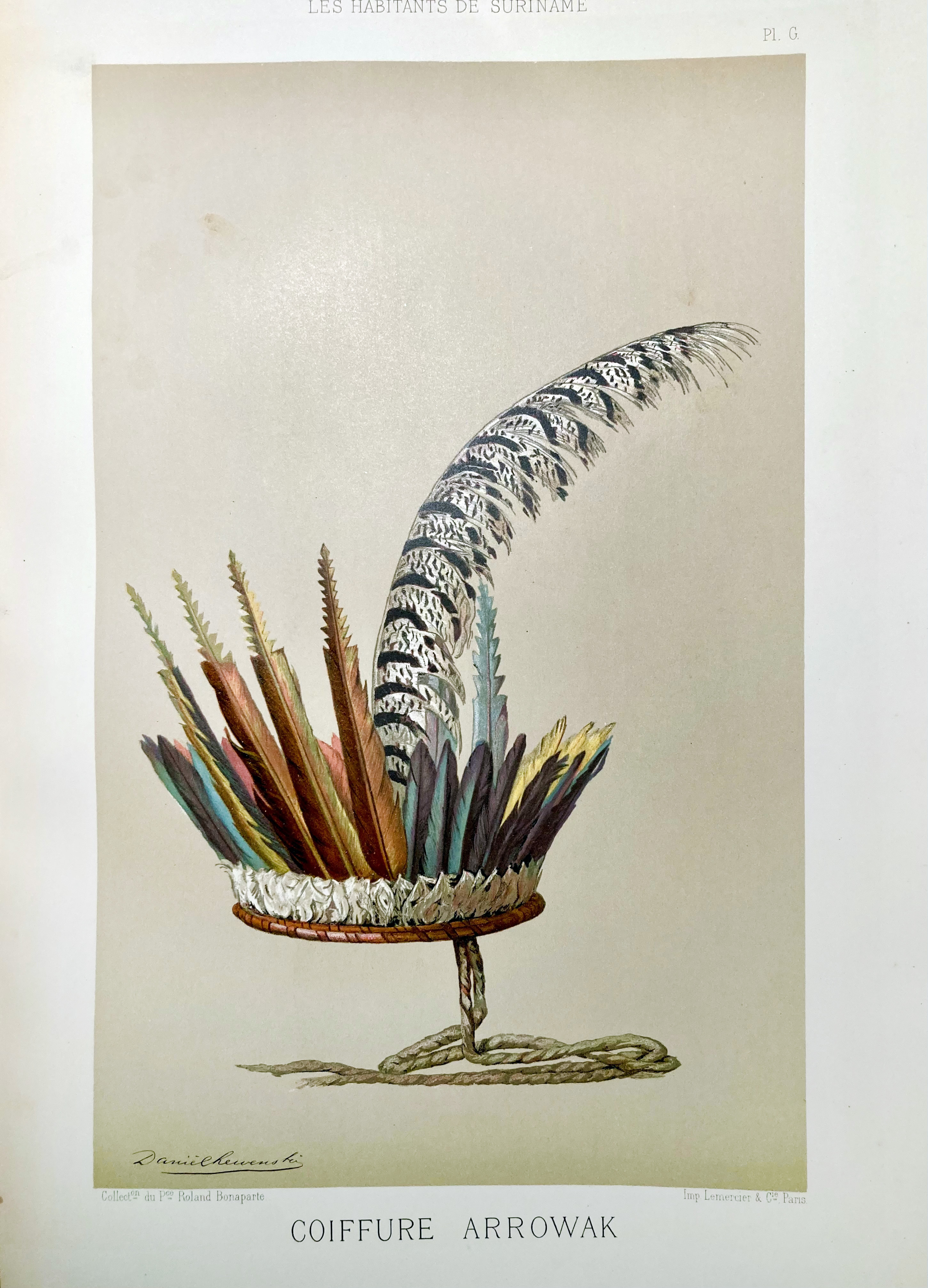 WEST INDIES -- SURINAM -- BONAPARTE, R. Les habitants de Suriname. Notes recueillies a l'Exposition Coloniale d'Amsterdam en 1883. Paris, A. Quantin, 1884. (4) lvs., viii, 226, (2) pp. W. tinted dec. title, 1 photo-engr. plate showing the exhibition 'poster', 2 fold. cold. maps of Surinam (1 a bit stained), 55 plain photo-engr. portraits of indigenous peoples, 13 full-p. cold. chromolithogr. plates, 10 plain views, and dec. initials. Lge-fol. Or. green cl. (Spine detached, bind. in need of restoration, some plates loose, partly foxed/browned, but complete).