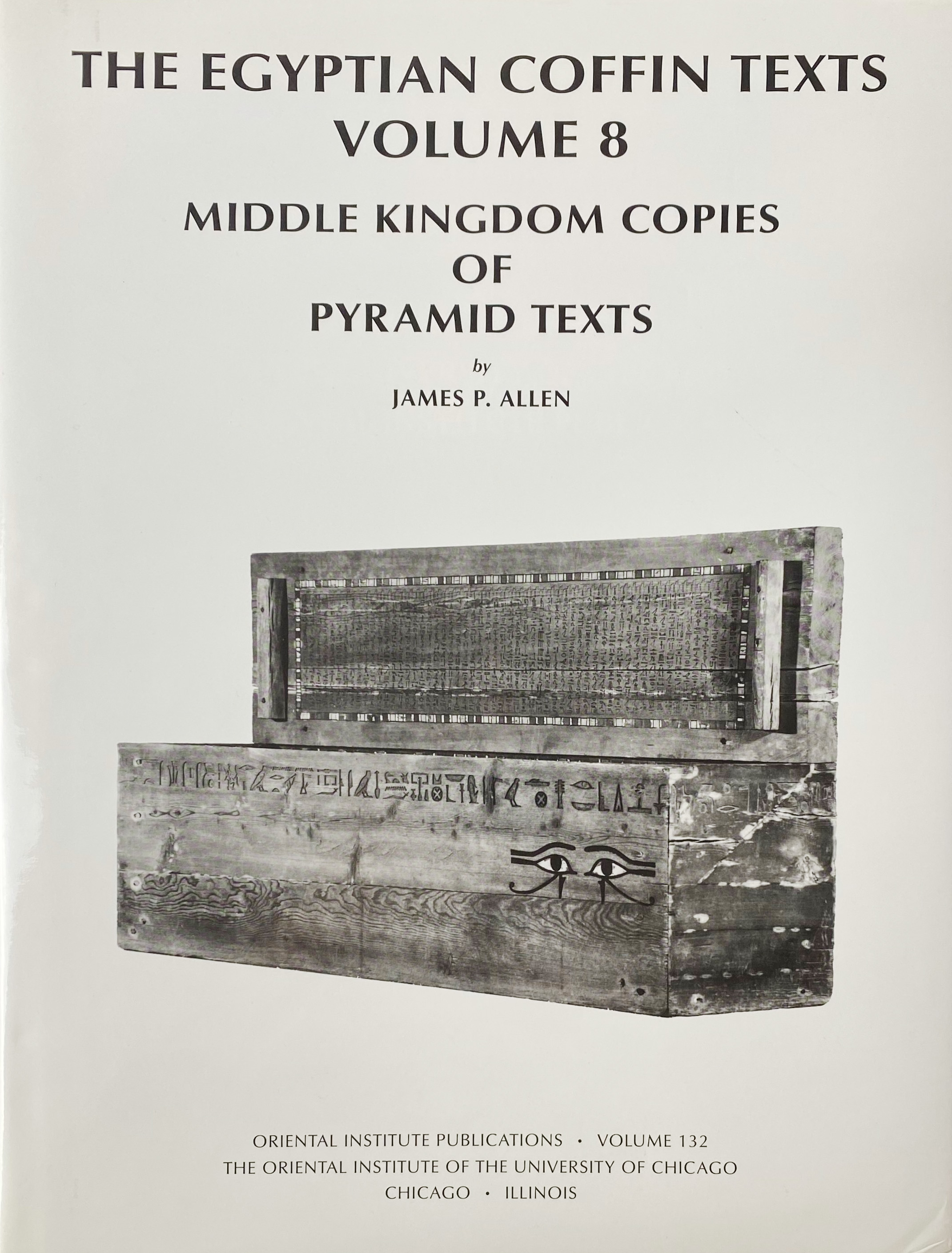 BUCK, A. de. The Egyptian coffin texts. Texts of spells, 1-1185. Chicago, (1935-61). 7 vols. 4°. Ohcl. (Spines a bit worn/dam.). (The Oriental Institute Publications 34, 49, 64, 67, 73, 81, 87). -- J.P. ALLEN. The Egyptian coffin texts. Vol. 8: Middle Kingdom copies of pyramid texts. (2006). 4°. Ocl. w. dust-j. (The Oriental Institute Publications 132). -- R. GRIESHAMMER. Die altägyptischen Sargtexte i.d. Forschung seit 1936. Bibliographie zu De Bucks The Egyptian Coffin Texts I-VII. 1974. 4°. Ohcl. -- (9).