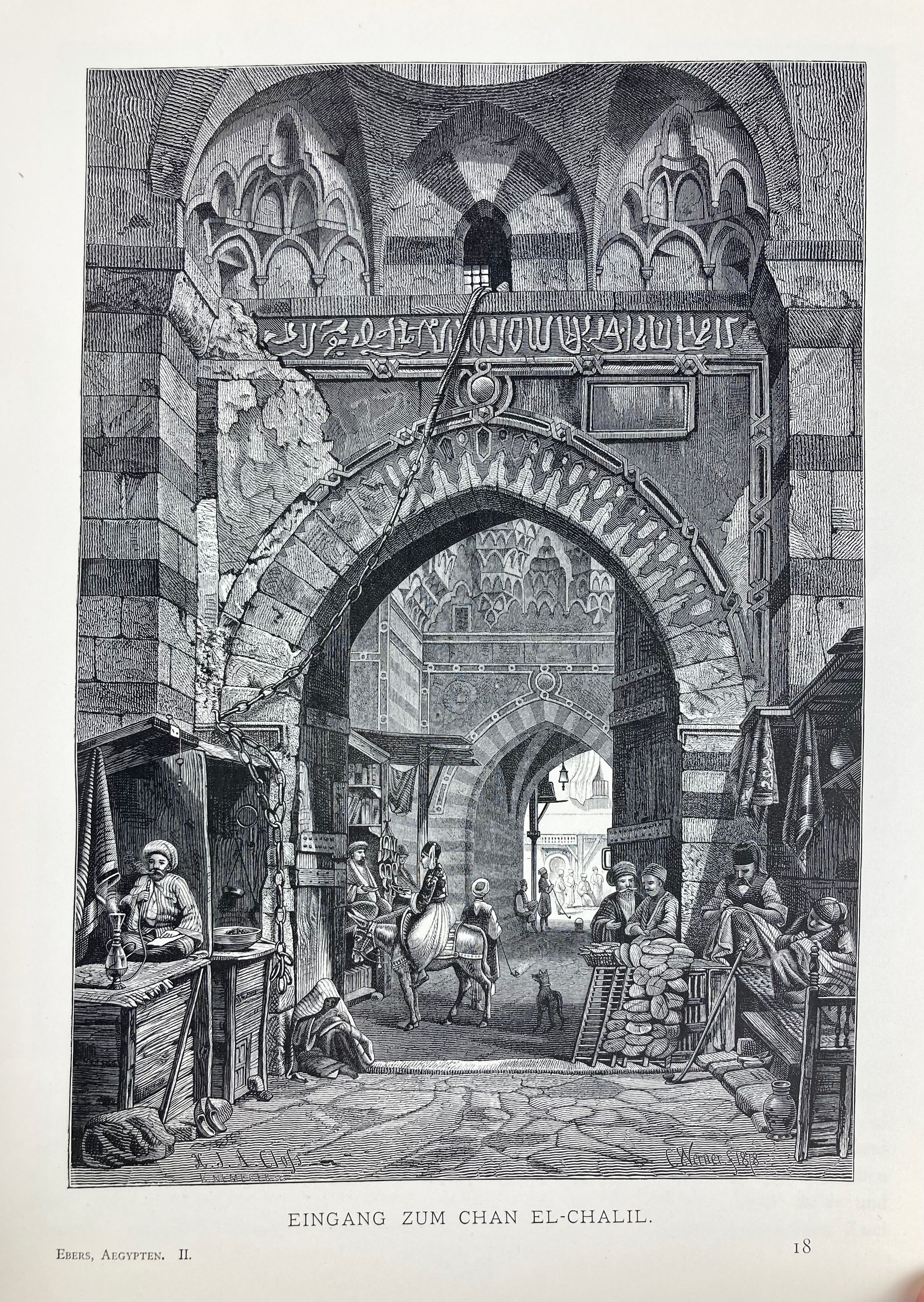 EBERS, G. Aegypten in Bild & Wort. Stuttg. & Lpz., 1879-80. 2 vols. (4), vi, (6), 387; xii, 432 pp. W. 2 lithogr. cold. maps & num. wood-engr. in text by various artists, e.g. Franz Lenbach, Alma Tadema, Hans Makart a.m.o. Fol. Ohcf., richly dec. gilt backs & sides tooled & ruled in blind & dec. w. blue beads. (Binds. slightly chafed in places, else a fine set).