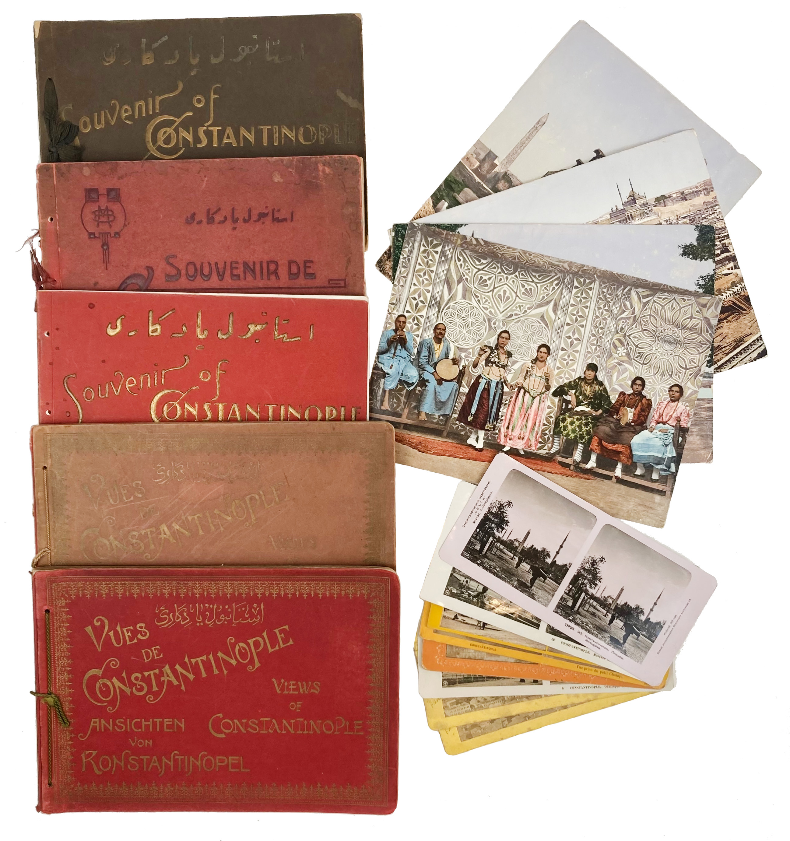 TURKEY -- COLLECTION of 6 Photochrom prints of scenes and views in Istanbul. (Photoglob, Zürich, 1890-1900s). All prints 165 x 235 mm (image size). Laid down on (somewhat foxed) mounts. -- SET of 5 souvenir booklets w. b&w & cold. photolitho's by a.o. Sébah & Joiallier: Souvenir de Constantinople / Vues de Constantinople. J. Ludwigsohn, M(oize) B(aruh) a.o., (1900s). All booklets ca. 180 x 250 mm. Hcl. (2) & owrps. (3), stapled & tied w. ribbon or string. (Worn at extremities). -- And 12 o. photolitho's & stereo photogr. (23).