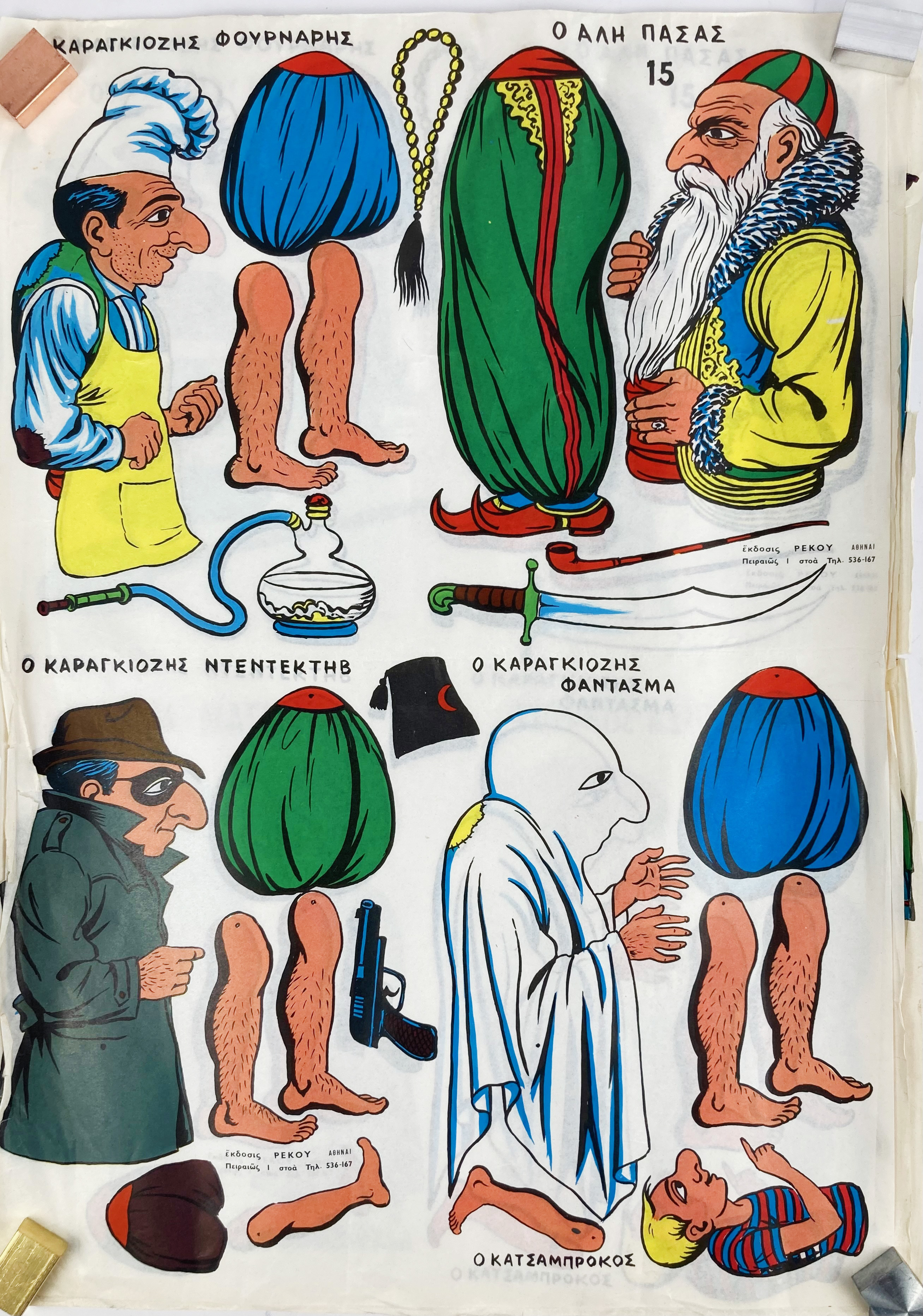 TURKEY -- KARAGÖZ/KARAGHIOZIS - SHADOW THEATRE -- 2 HAND PAINTED MOVEABLE KARAGÖZ PUPPETS made of strong plastic elements, connected through rivets. 1960's? c. 50 and c. 65 cm high. -- Added: 4 sheets w. coloured cut out Karagöz puppets. Athens, Pekoe, n.d. (1960's?). 500 x 350 mm each. (Some wear & tear to margins). -- (6).
