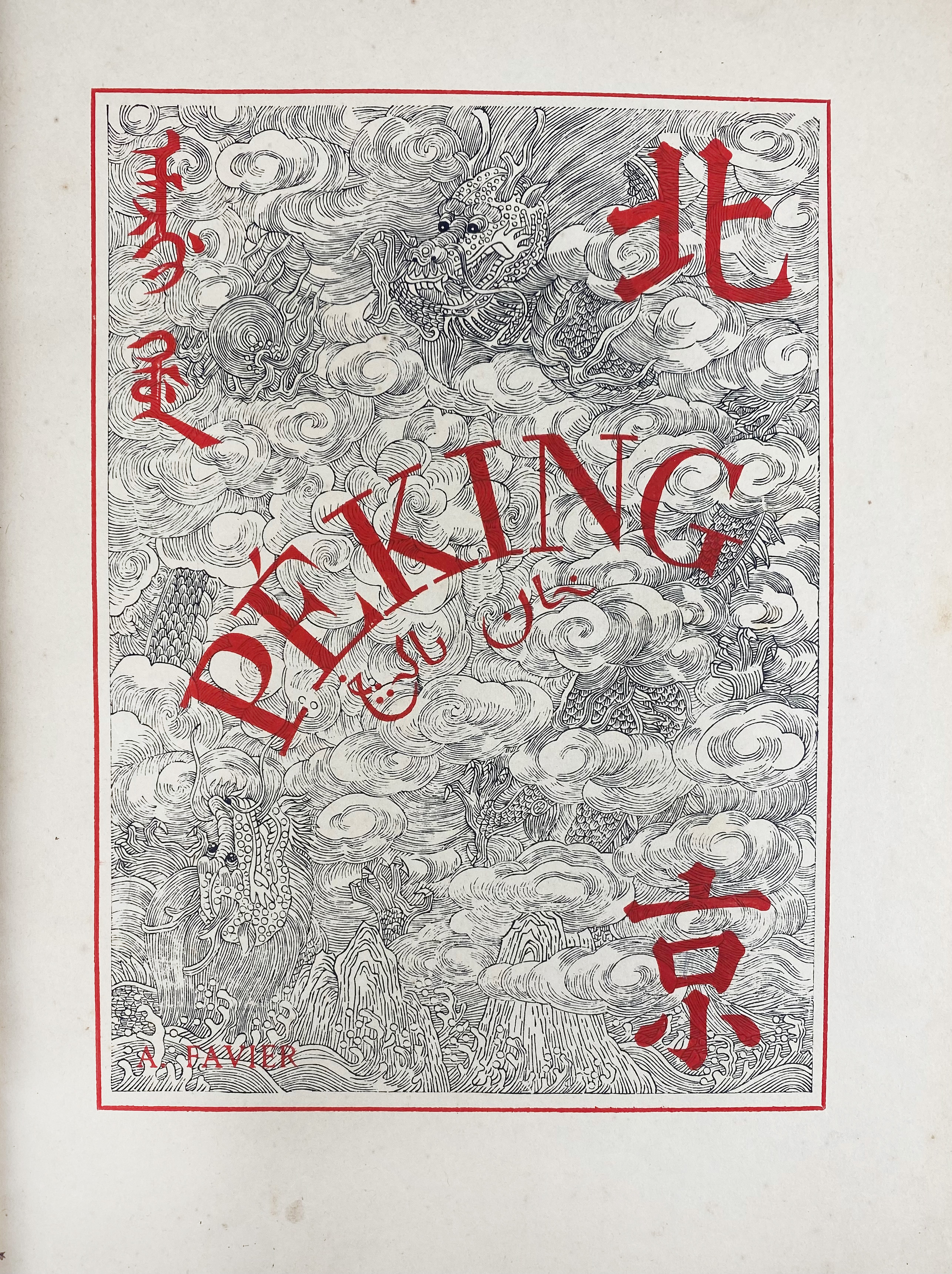 CHINA -- FAVIER, A. Péking. Histoire et description. Peking, Impr. des Lazaristes au Pé-T'ang, 1897. 2 in 1 vol. xii, (4), 336; (6), 337-562, (1) pp. W. 2 fronts., 51 plates with photolithogr. and collographs, 1 tinted map & 660 wood engr. text-ills. 4°. Fine cont. mor. w. raised bands, dec. gilt back, t.e.g. (Cloth on sides a bit stained, corners sl. worn, upper hinge broken, margins a bit stained in places, sl. yellowed, but a v.g. copy).
