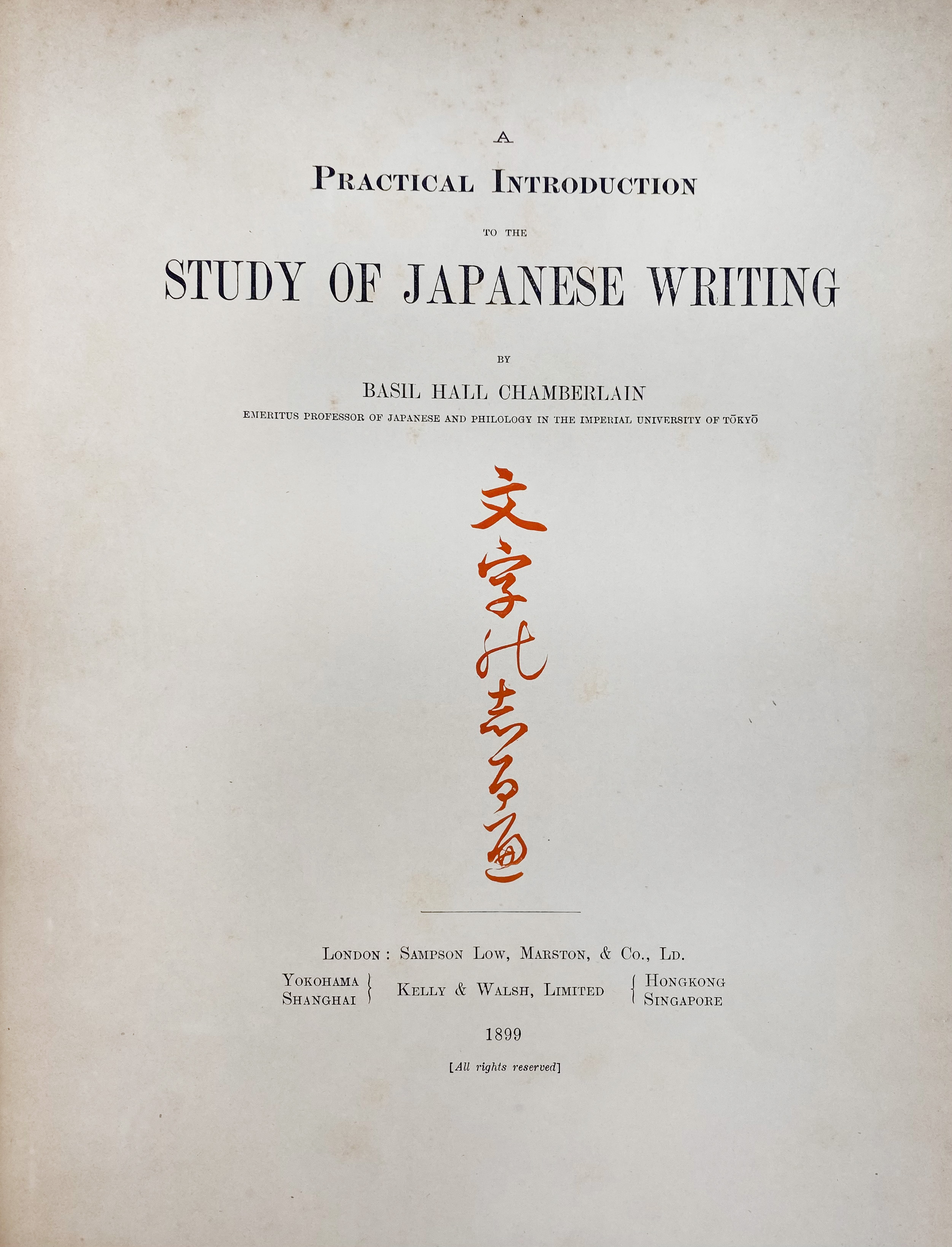 JAPAN -- CHAMBERLAIN, B.H. A practical introduction to the study of Japanese writing. Lond., (etc.), 1899. vi, 482, (4) pp. 4°. Ocl. (Top of spine sl. dam.). Rare first edition. -- And 2 o. (3).