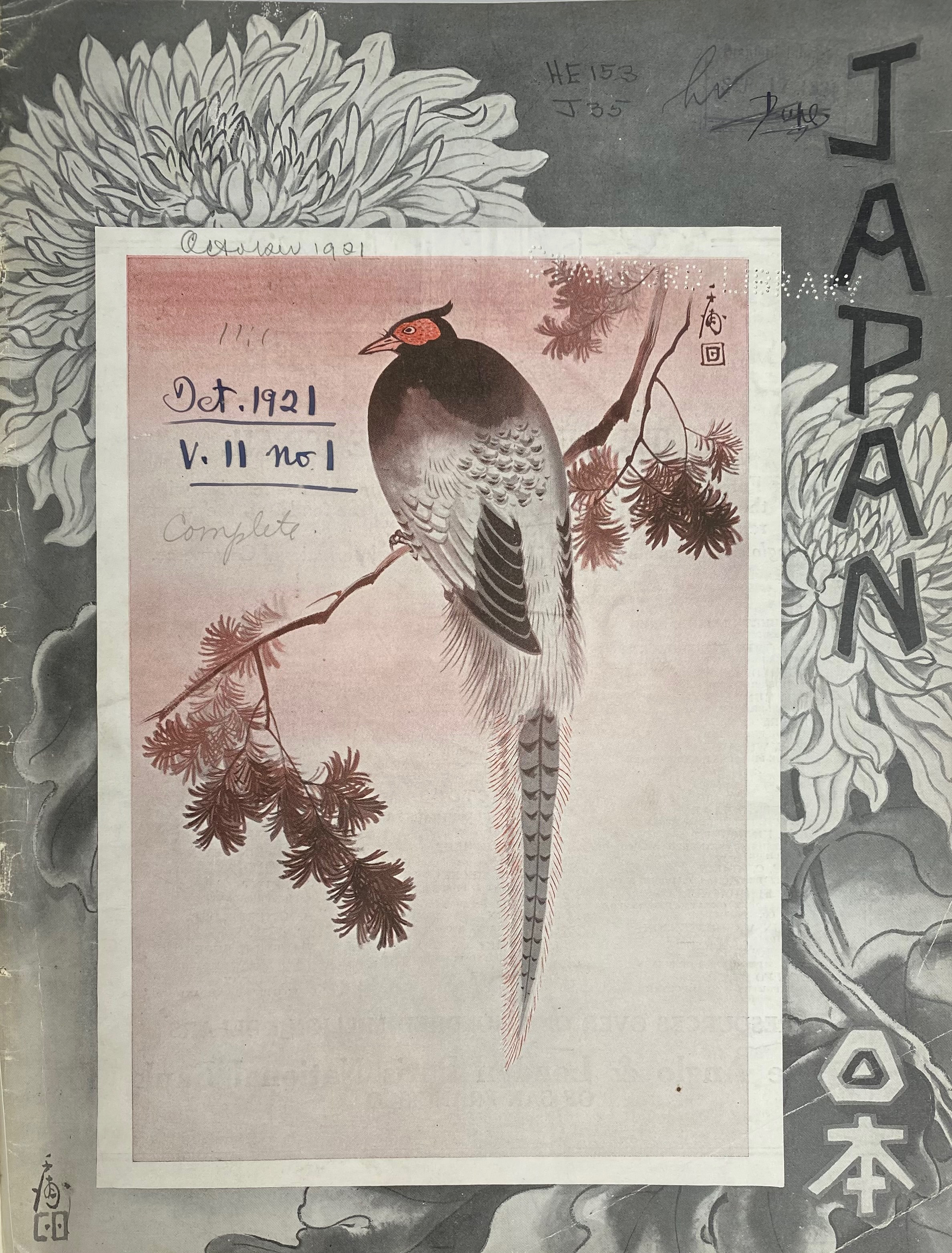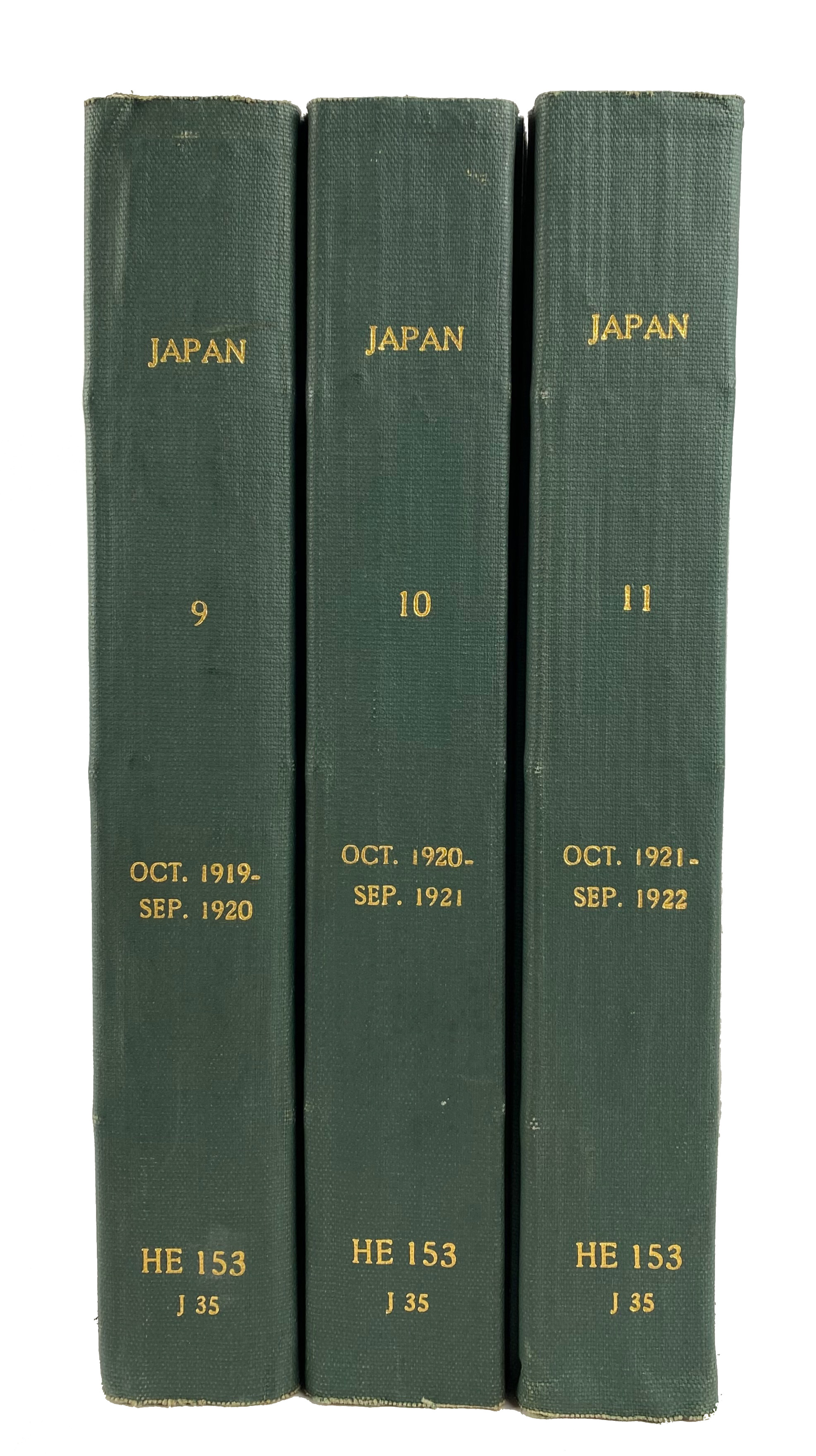 JAPAN -- JAPAN. An Illustrated Magazine of Oriental Travel and Trade Development. 3 vols. (Year 9-11). San Francisco, Toyo Kisen Kaisha, 1919-22. 36 issues in 3 vols. Prof. ill. 4°. Clothbacked brds., w. owrps. bound up. (Ex libr. copies, w. small stamps).