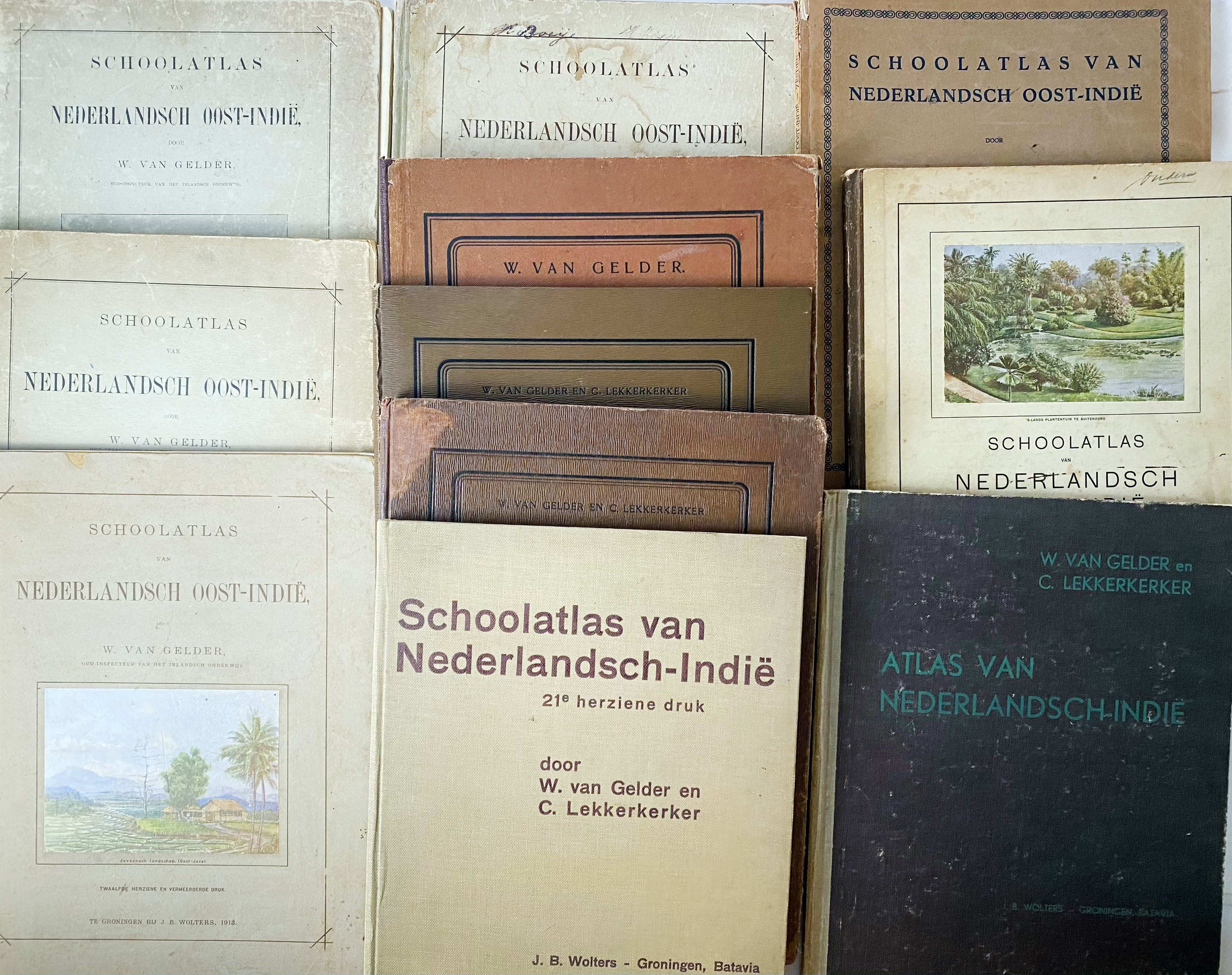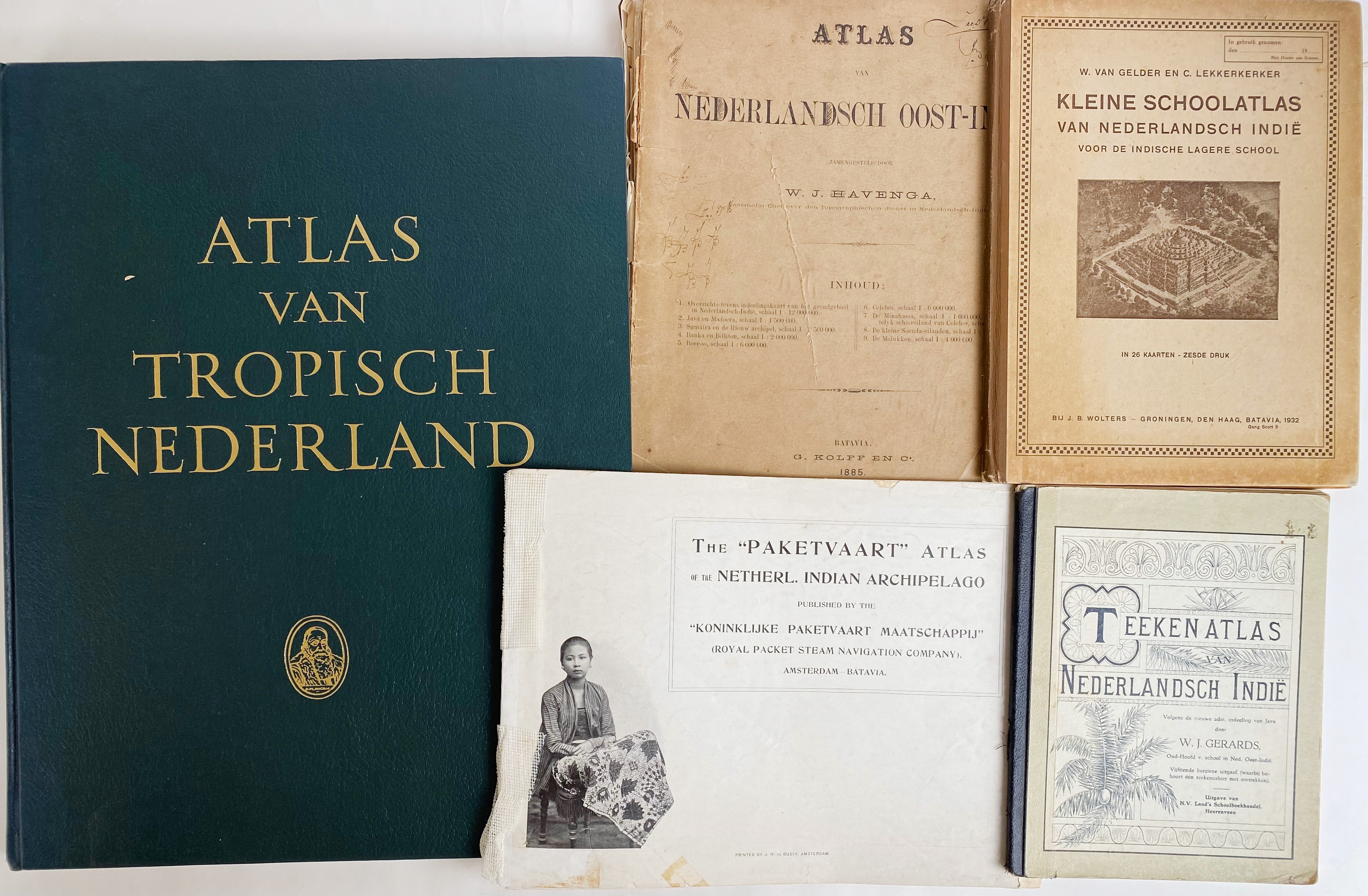 ATLASES -- DE BUSSY'S ATLAS van Nederlandsch Oost-Indië voor kantoor, school en huis. Amst., J.H. de Bussy, 1919. W. 9 double-p. cold. maps. Fol. Ohcl. First edition. -- W. v. BEMMELEN. Regenatlas. 1915. W. 7 cold. lithogr. maps. Lge-fol. Owrps. -- ATLAS VAN TROPISCH NEDERLAND. (Facs. ed. 1938. 1990). (10) pp. W. 31 cold. maps & loosely added index. Fol. Ocl. -- And 15 o. atlases (incl. num. editions of Van Gelder's 'Schoolatlas'). (18).