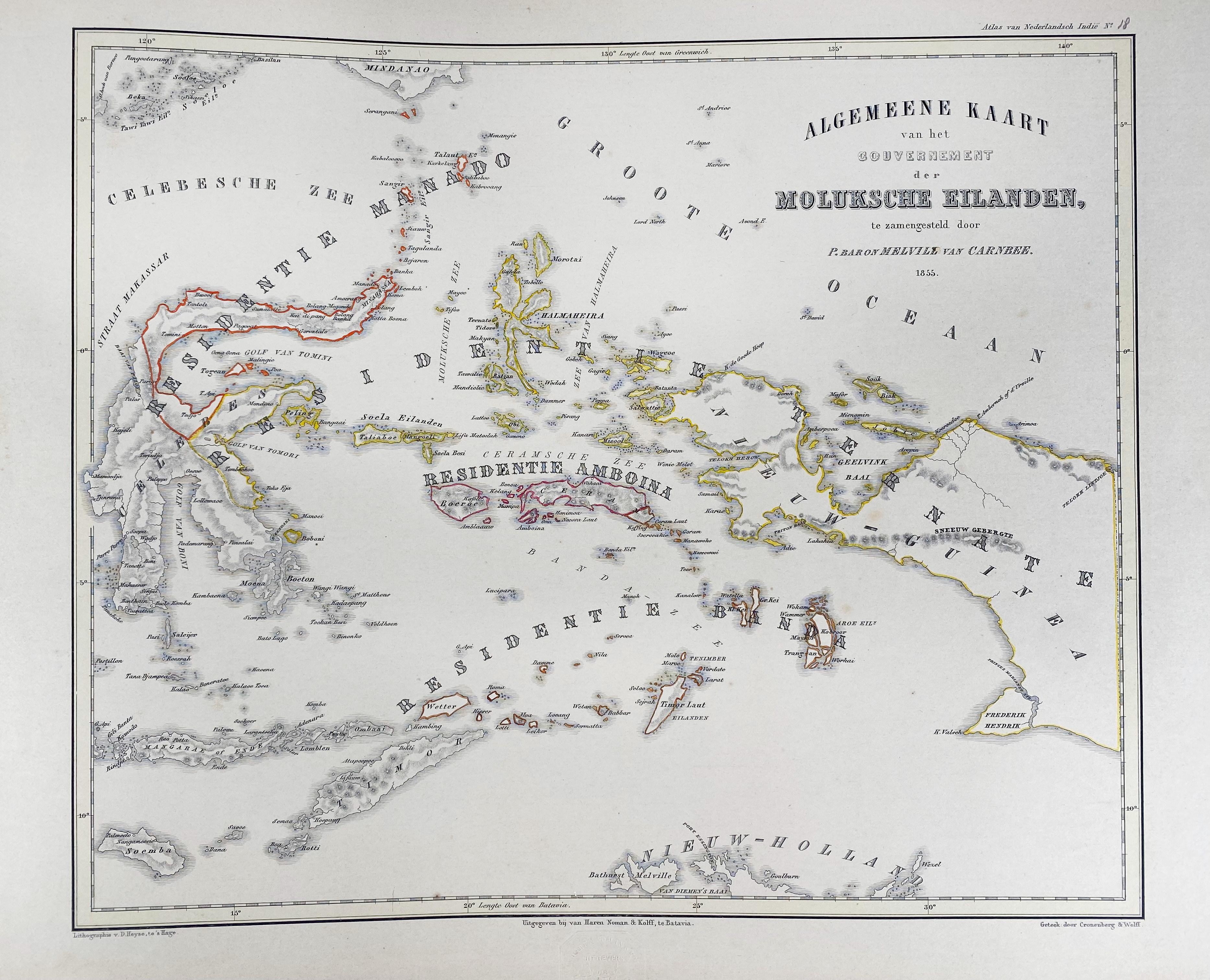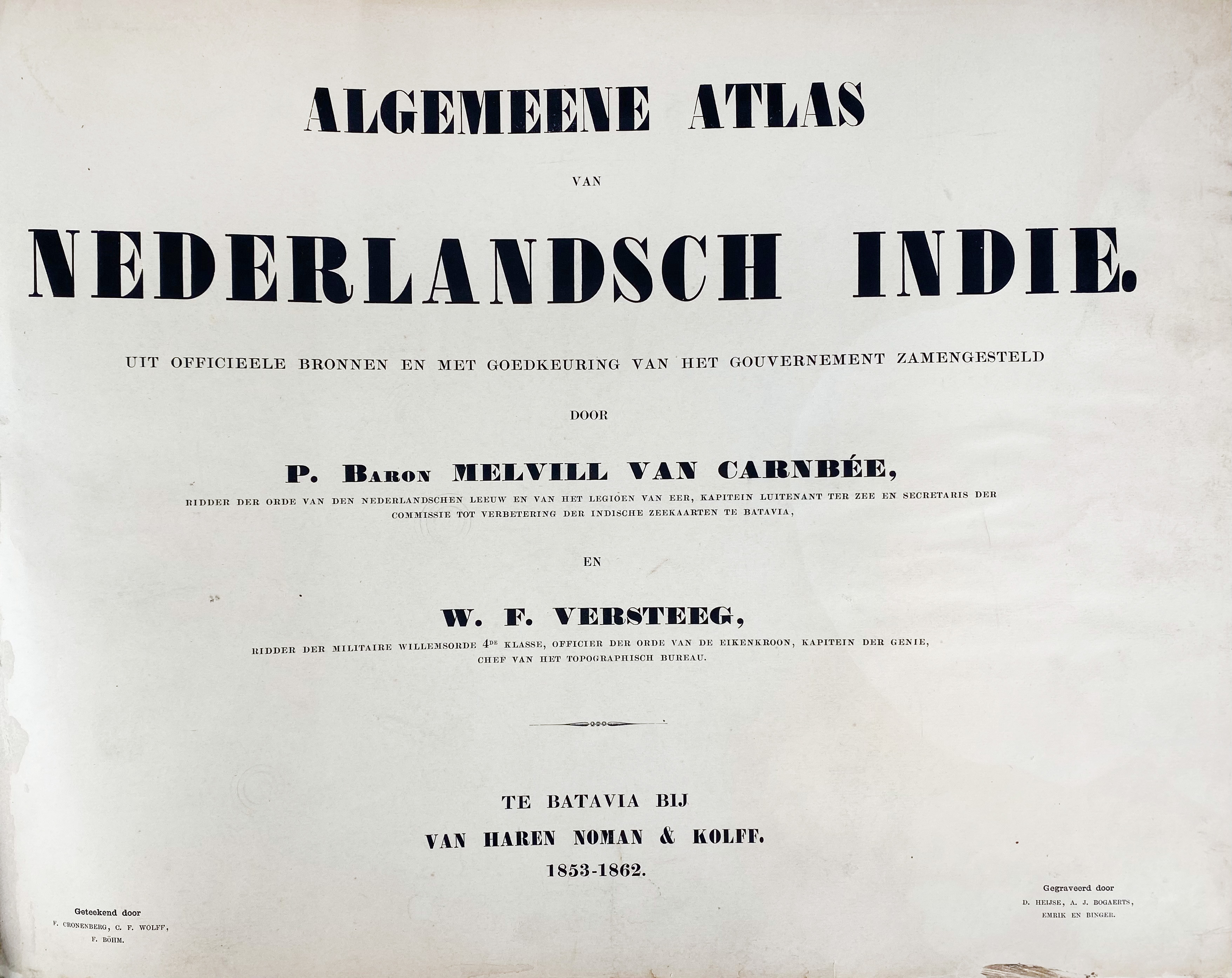 ATLASES -- MELVILL v. CARNBÉE, P. & W.F. VERSTEEG. Algemeene atlas van Ned. Indië. uit officieele bronnen en met goedkeuring van het gouvernement zamengesteld. Batavia, Van Haren Noman & Kolff, 1853-62. W. ti-p., 2 section ti-pp., 2 indexes, 60 lithogr. maps, handcold. in outlines & 3 lithogr. index maps. Fol.-obl. Or. h. mor. extra w. gilt lettering. (Spine ends dam./torn, corners worn, covers stained, espec. front cover, index-leaf partly torn, margins a bit frayed/brittle at beginning and end, sl. age-toned).