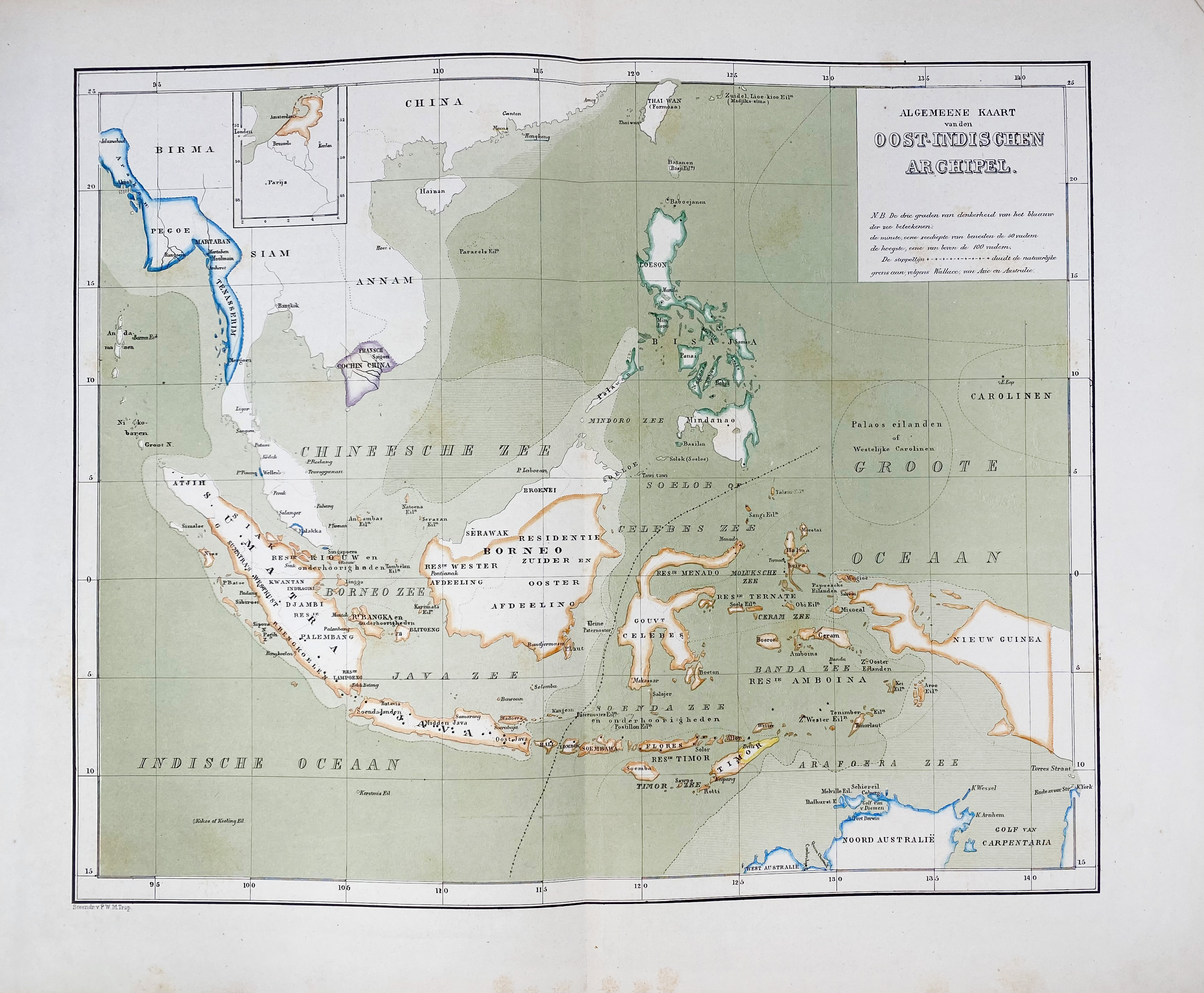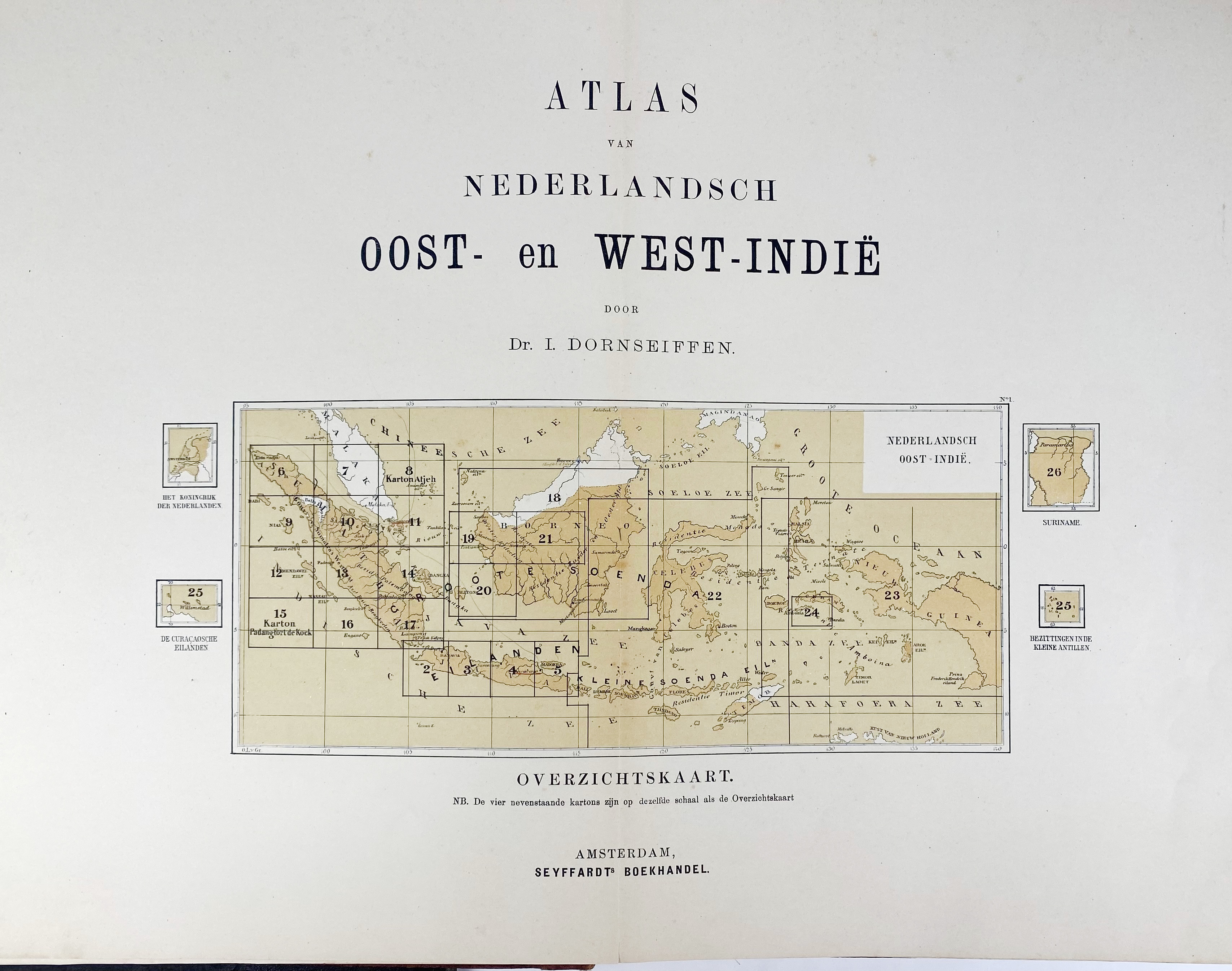 ATLASES -- PIJNAPPEL, J. Atlas van de Nederlandsche bezittingen in Oost-Indië. Geheel op nieuw bewerkte uitgave. Amst., P.N. v. Kampen, 1872. W. 11 cold. lithogr. maps on 9 double-p. lvs. Fol. Ocl. (Spine & corners dam.). -- I. DORNSEIFFEN. Atlas van Ned. Oost- en West-Indië. 5e dr. Amst., (1901). 26 cold. lithogr. maps on 23 double-p. lvs. (map of Java in 3 parts). Fol. Or. blind tooled cl. w. gilt lettering. -- (2).
