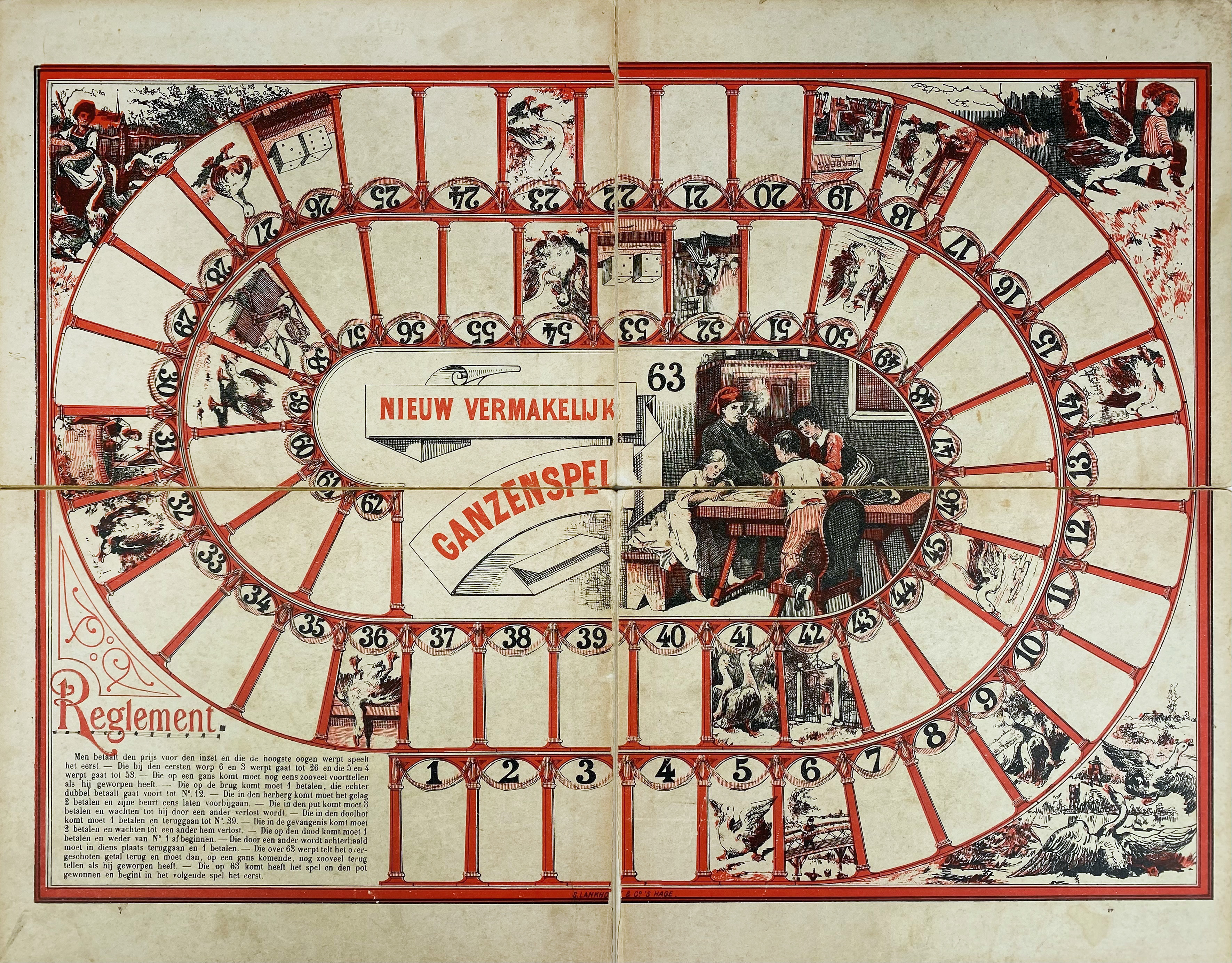 GAMES/TOYS -- SINT NICOLAAS SPEL. Amst., J. Vlieger, (c. 1885). Cont. cold. lithogr. by Gebr. Braakensiek with engr. rules of the games in the center. c. 600 x 450 mm. Mounted on cardboard, folding into 4 parts. Buijnsters, Papertoys p. 277. -- And 1 o. goose board. (2).