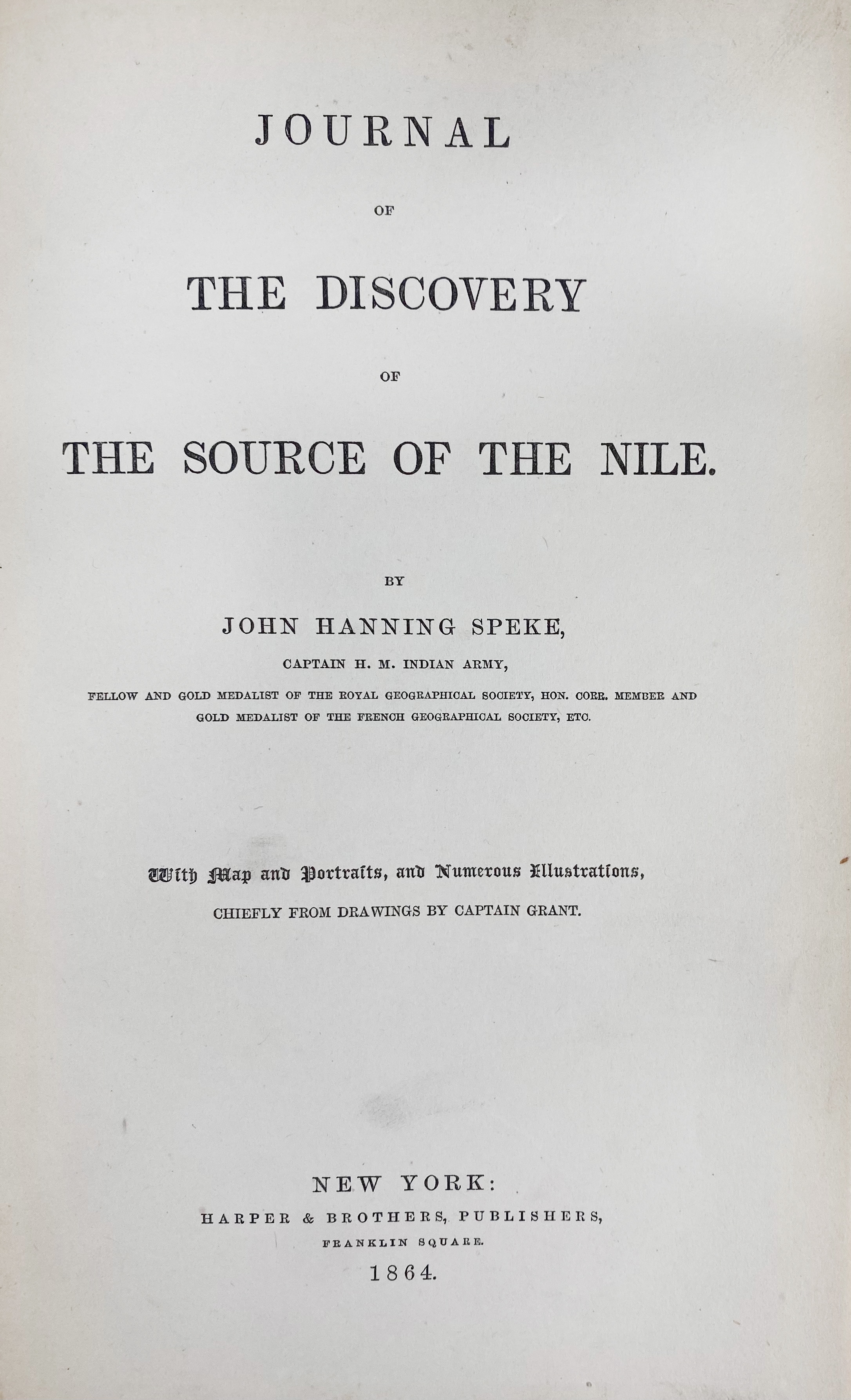 AFRICA -- HANNING SPEKE, J. Journal of the discovery of the source of the Nile. N.Y., 1864. xxx, 31-590, (6) pp. W. front.-portr., 23 plates, 2 maps, (1 lge-fold.), num. text-ills. Or. gilt lettered cl. (Extremities a bit worn, lge-fold. map rep. w. sello-tape). - First American edition.