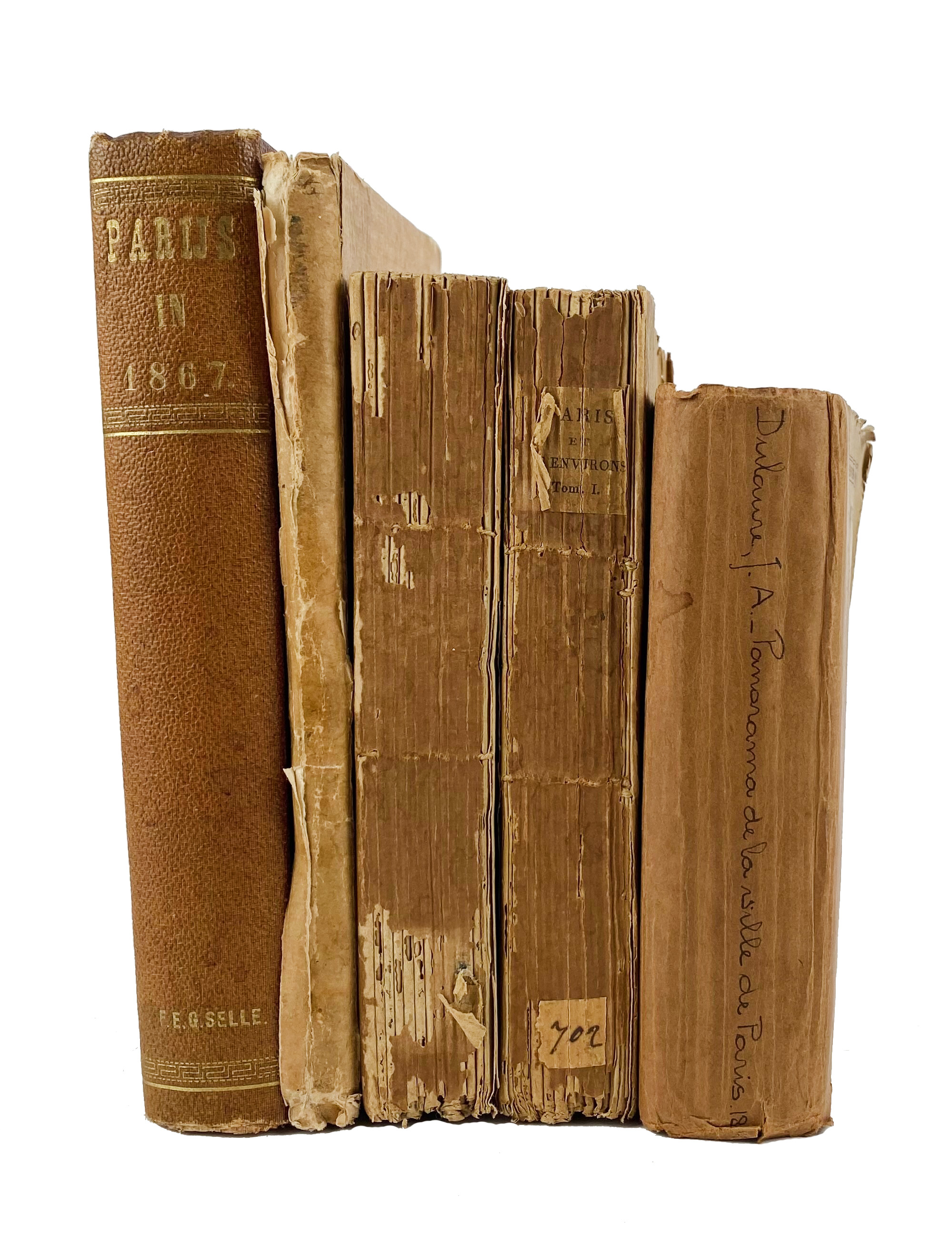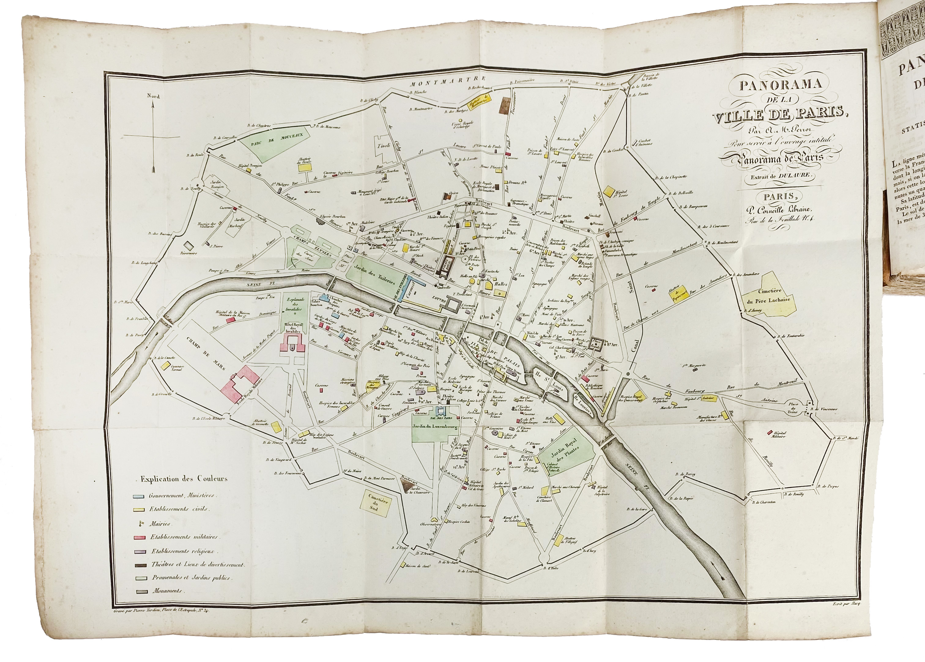 PARIS -- "NOUVEAU PLAN ROUTIER de la Ville et Faubourgs de Paris". Par., 1810. Engr. fold. plan, cold. in outlines. 755 x 540 mm. In obrds. bind. (Spine a bit dam., a few tears on folds). -- J.A. DULAURE. Panorama de la ville de Paris, et guide de l'étranger à Paris. Par., 1824. W. lge-fold. plan & 12 engr. plates. 12°. Or. printed wrps. (Paper strip on spine, stamps in places, stained throughout, some foxing). -- PARIS et ses curiosités, avec une notice historique et descriptive des environs de Paris. Nouv. éd. Par., 1804. 2 vols. Sm-8°. Wrps., uncut. (Wrps. worn/a bit dam., sl. age-toned). -- And 1 o. (5).