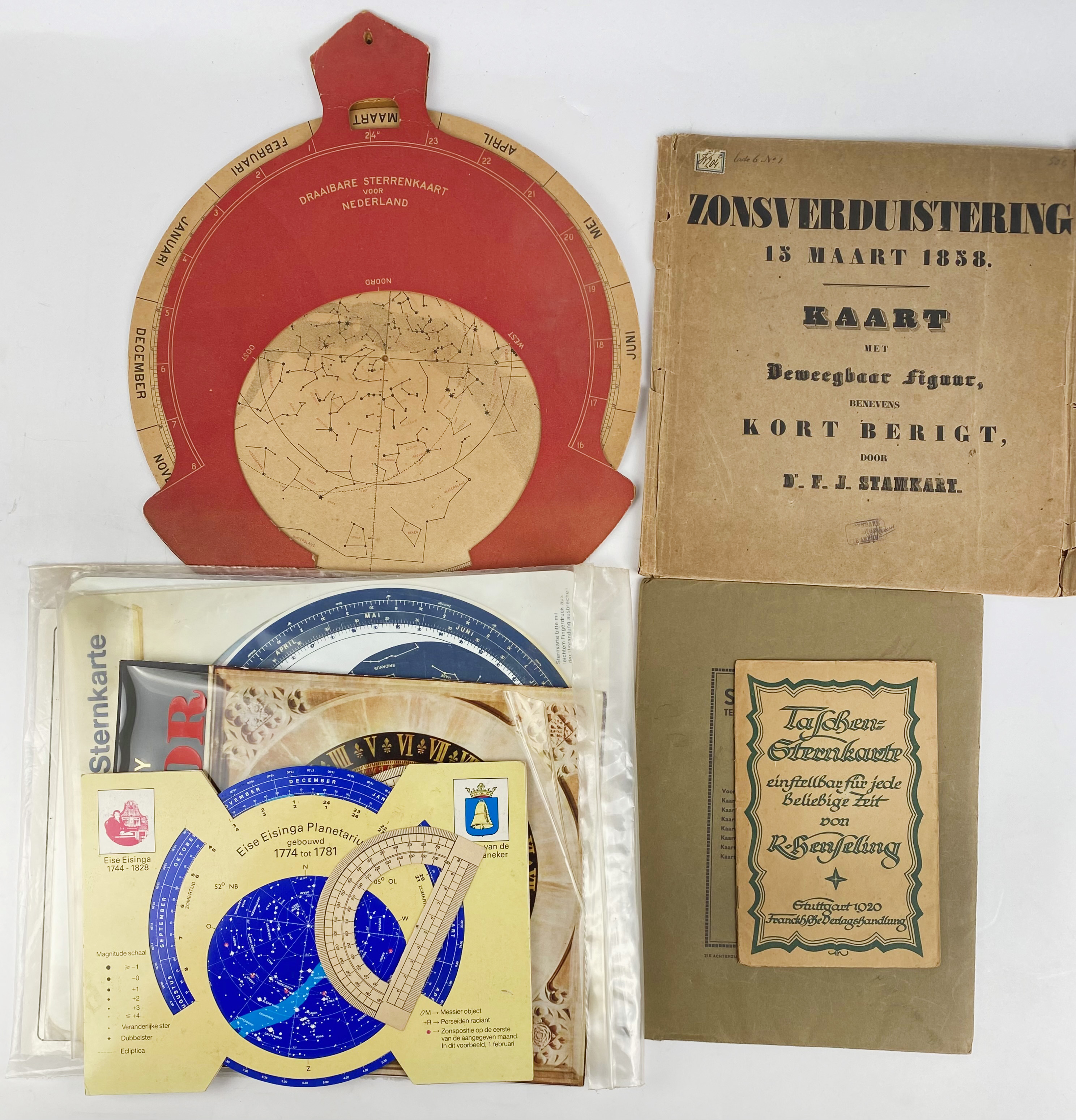 ASTRONOMY -- VISSER, S.W. Draaibare Sterrenkaart voor de Tropen. 4e dr. Gron./Djakarta, (c. 1930). Movable board disc w. constellations of stars surrounded by sections with months and days of the year in outer edge. - With: Id. Korte handleiding behoorende bij de Draaibare Sterrenkaart voor de Tropen. 5e dr. 1931. Or. printed wrps. -- F.J. STAMKART. Zonsverduistering 15 maart 1858. Kaart met beweegbare figuur, benevens kort berigt. (c. 1858). Moveable b&w card. In or. printed cover. (Without text, cover a bit dam.). -- W.G. ten HOUTE de LANGE & J.K. MULDER. Draaibare sterrenkaart voor Nederland. 2e dr. (1943). Movable board disc w. constellations of stars surrounded by sections with months and days of the year in outer edge. (A bit browned). -- And 6 o. (on) planispheres. (10).