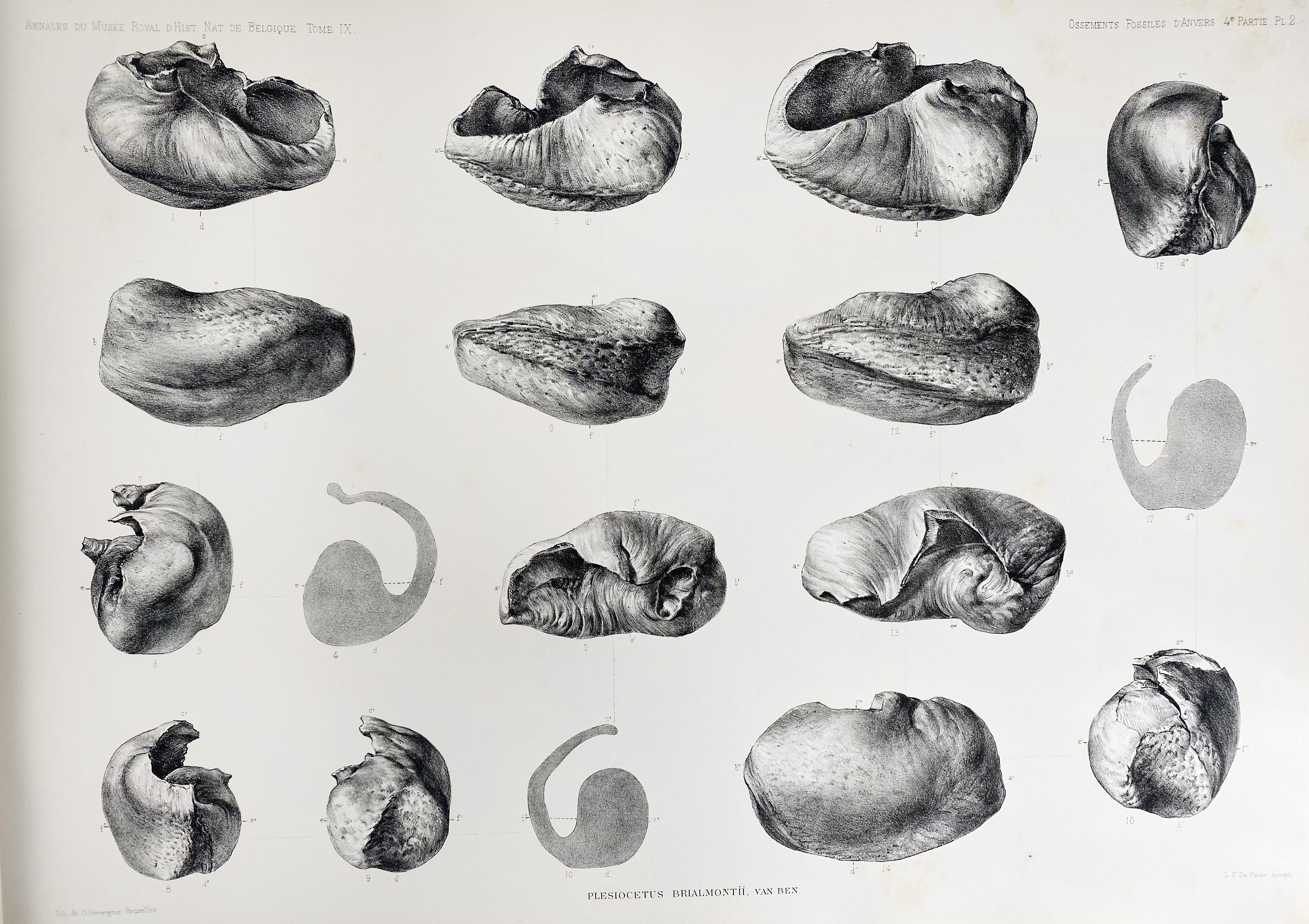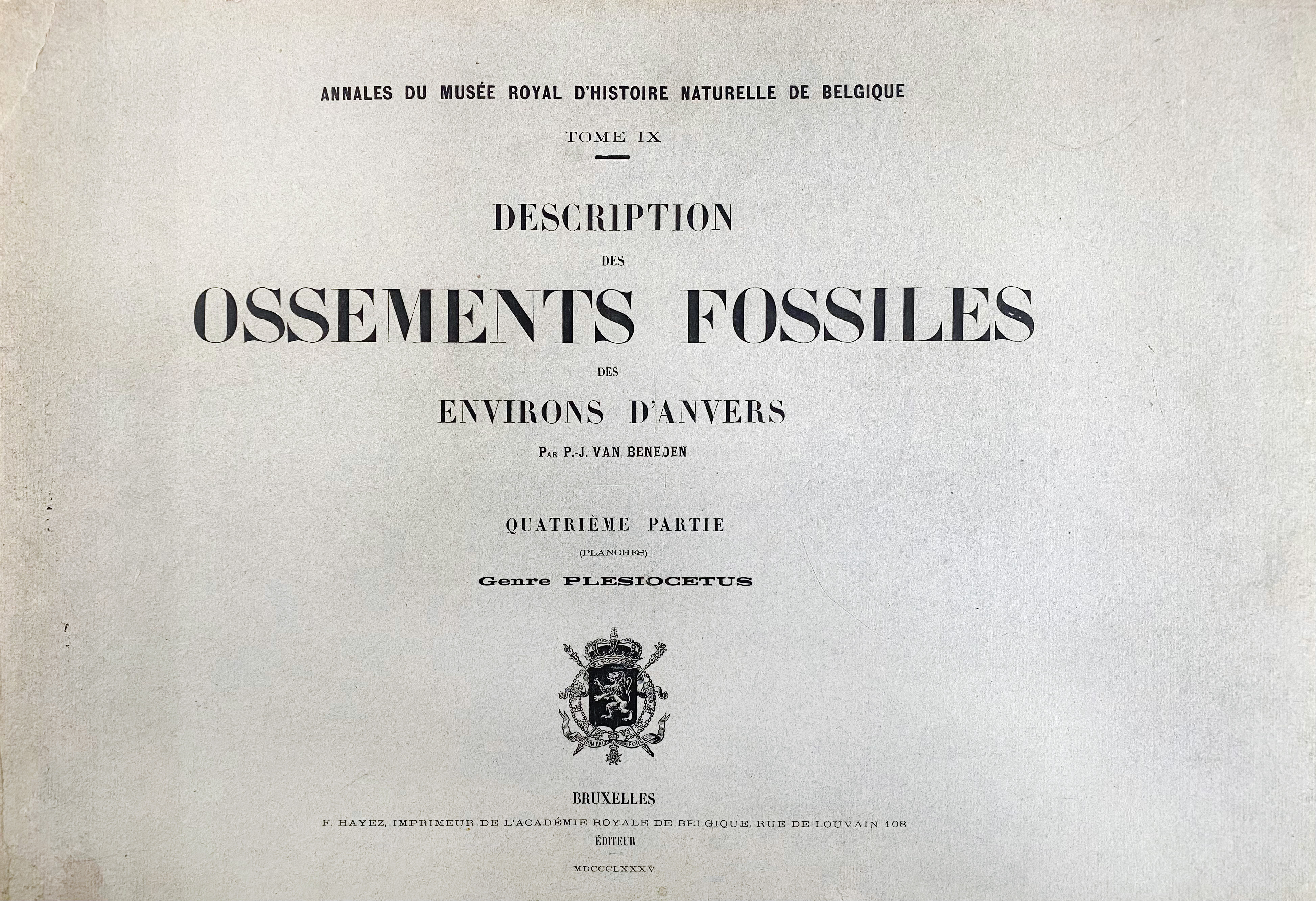 BENEDEN, P.J. v. Description des ossements fossiles des environs d’Anvers. 4me partie (planches). Cétacés genre: Plesiocetus. Brux., F. Hayez (Musée royal d’Histoire Naturelle de Belgique), 1885. W. 30 lithogr. plates. Lge-fol-obl. Or. printed brds. (Joint split at the bottom, spine a bit worn, upper hinge broken, half ti. & ti. detached, very light foxing, mainly to the explanatory leaves, the plates much cleaner).
