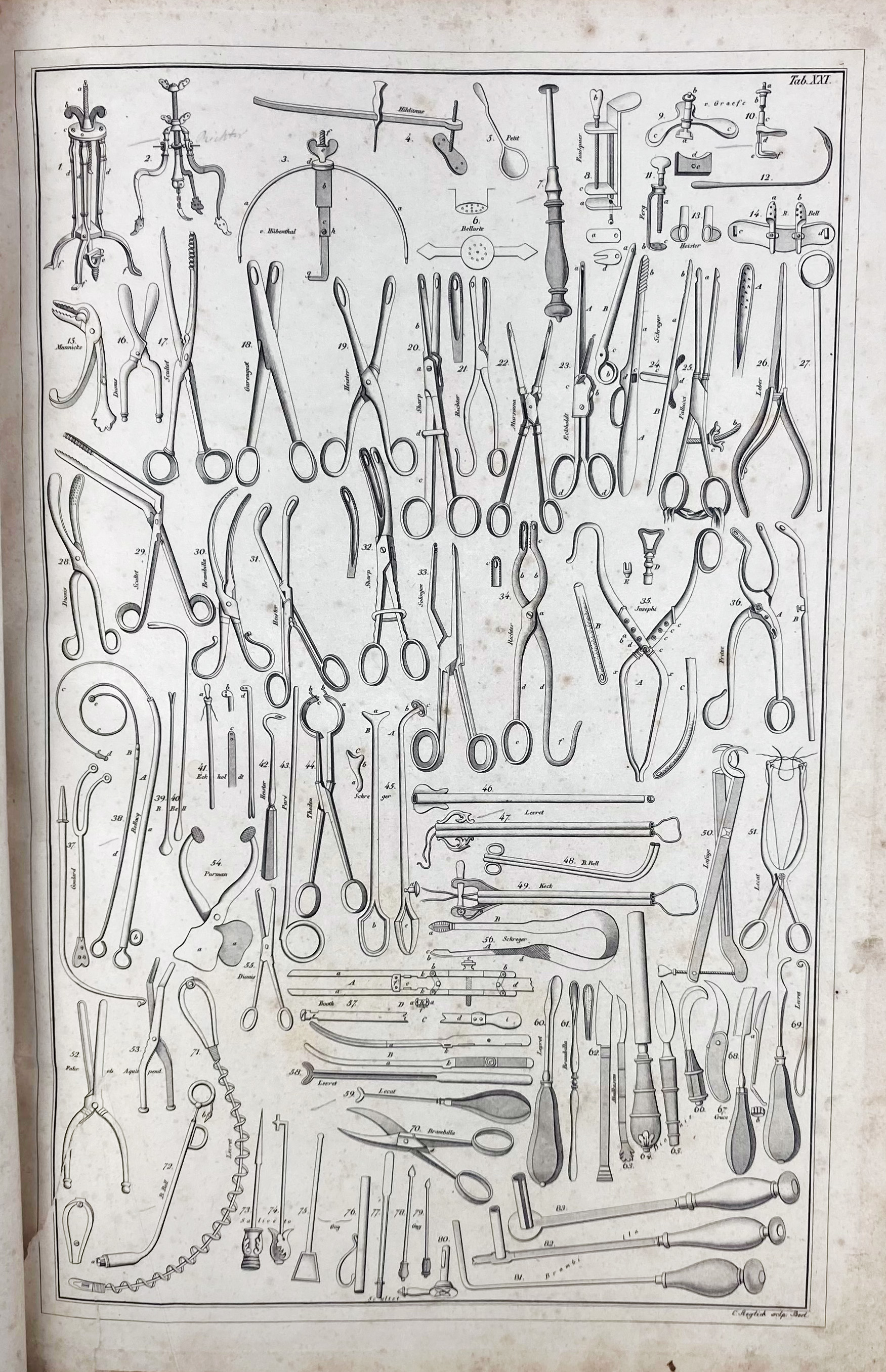 BLASIUS, E. Akiurgische Abbildungen oder Darstellung der blutigen chirurgischen Operationen und der für dieselben erfundenen Werkzeuge. Berl., F.A. Herbig, 1833. 50 plates (of which 12 partly cold.). Lge-fol. Later hcf. extra. (Endpapers replaced, margins delicate, some dust stains, some yellowing throughout, 1 plate torn at the stub, as often without the text volume).